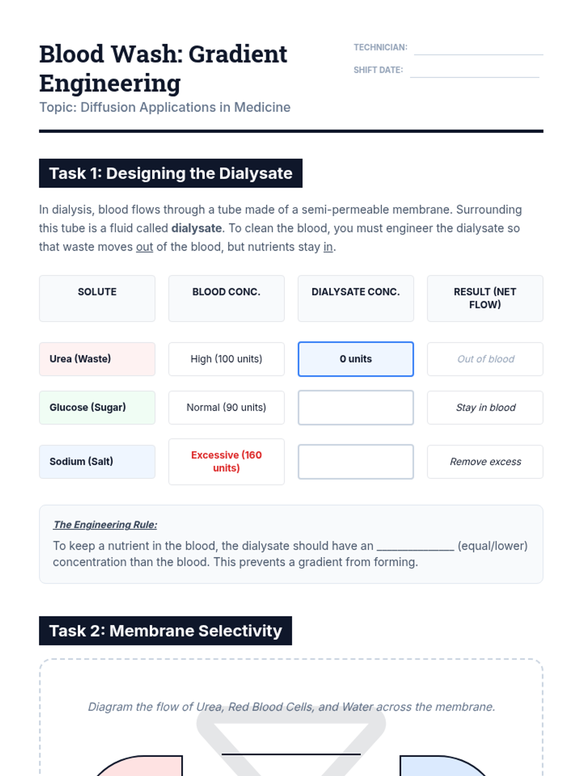 A comparison between the natural filtration of the human kidney and the mechanical process of dialysis. Students study how diffusion gradients are engineered to replace biological function.