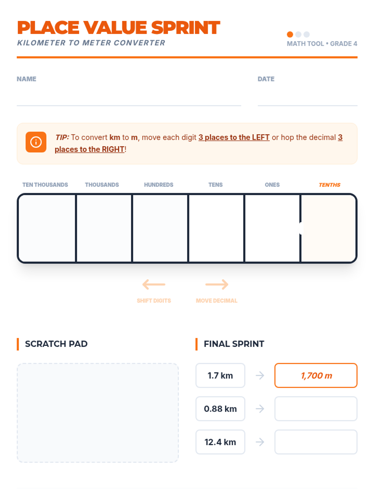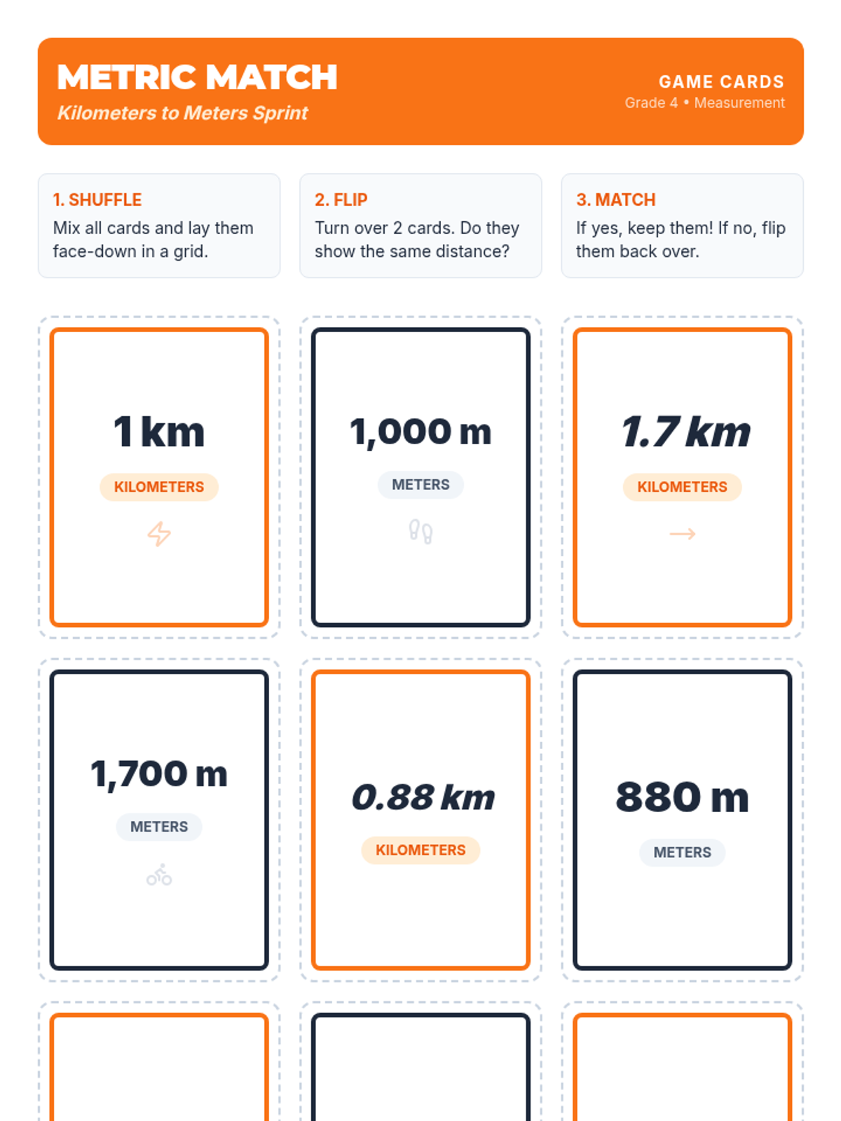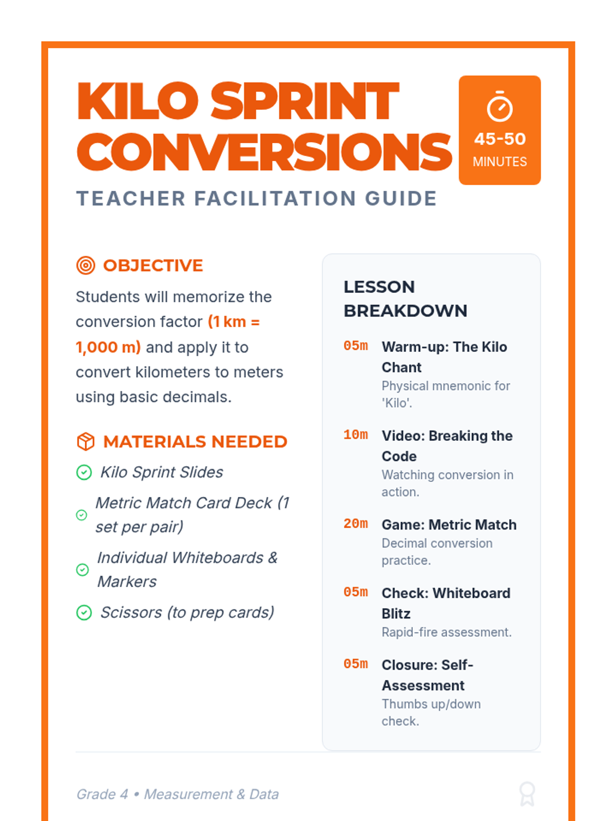 A high-energy 4th-grade lesson focusing on converting kilometers to meters using decimals, featuring a physical chant, a video deep-dive, and a 'Metric Match' card game.