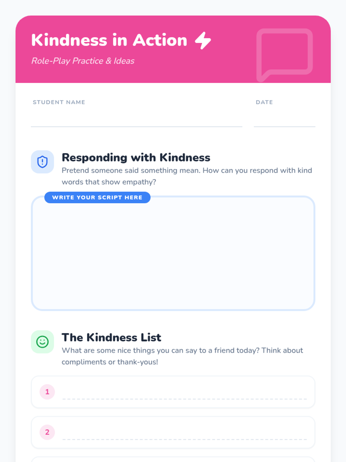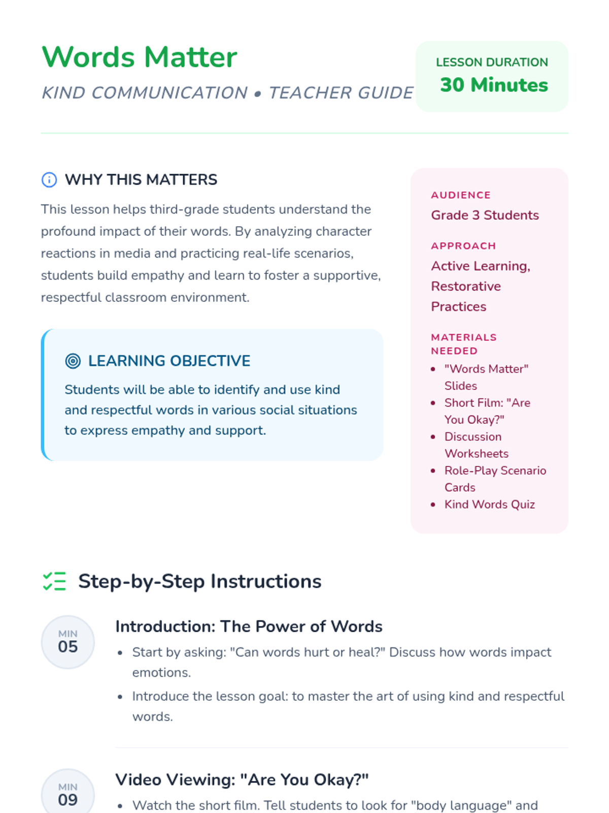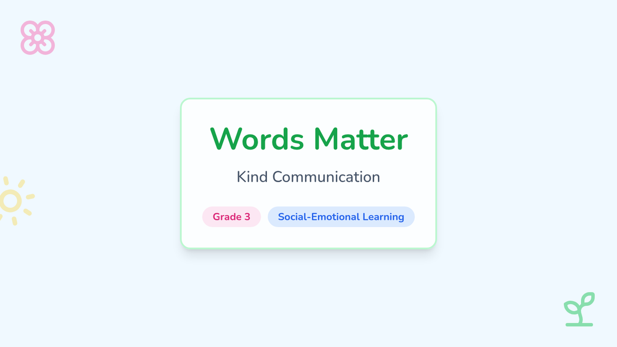 A lesson for third graders focused on the power of words and practicing kind, respectful communication through video analysis and role-play.