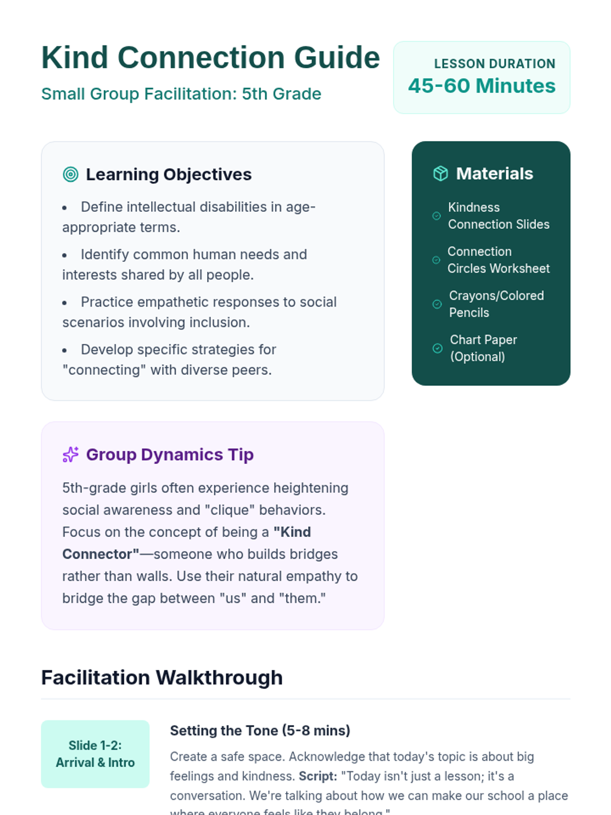 A social-emotional learning lesson designed for a small group of 5th-grade girls to foster understanding, empathy, and acceptance of individuals with intellectual disabilities through discussion and shared activities.