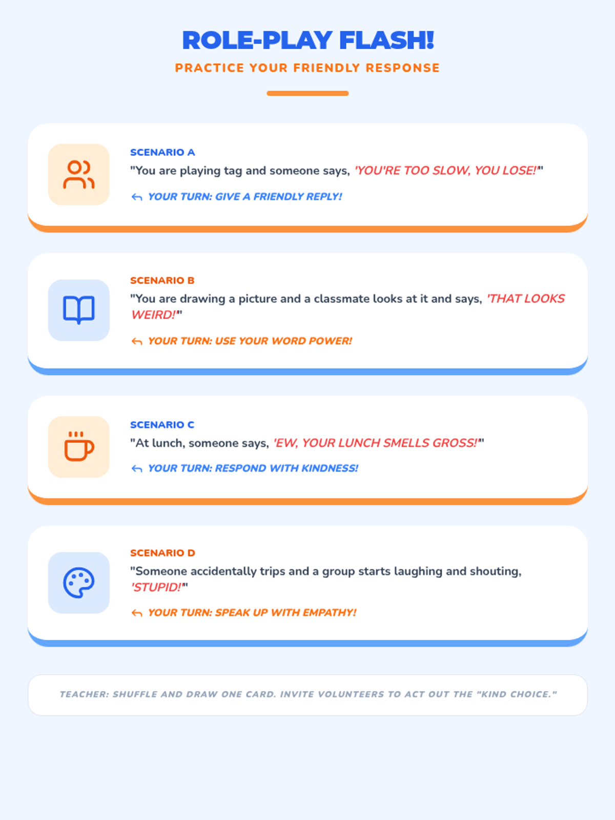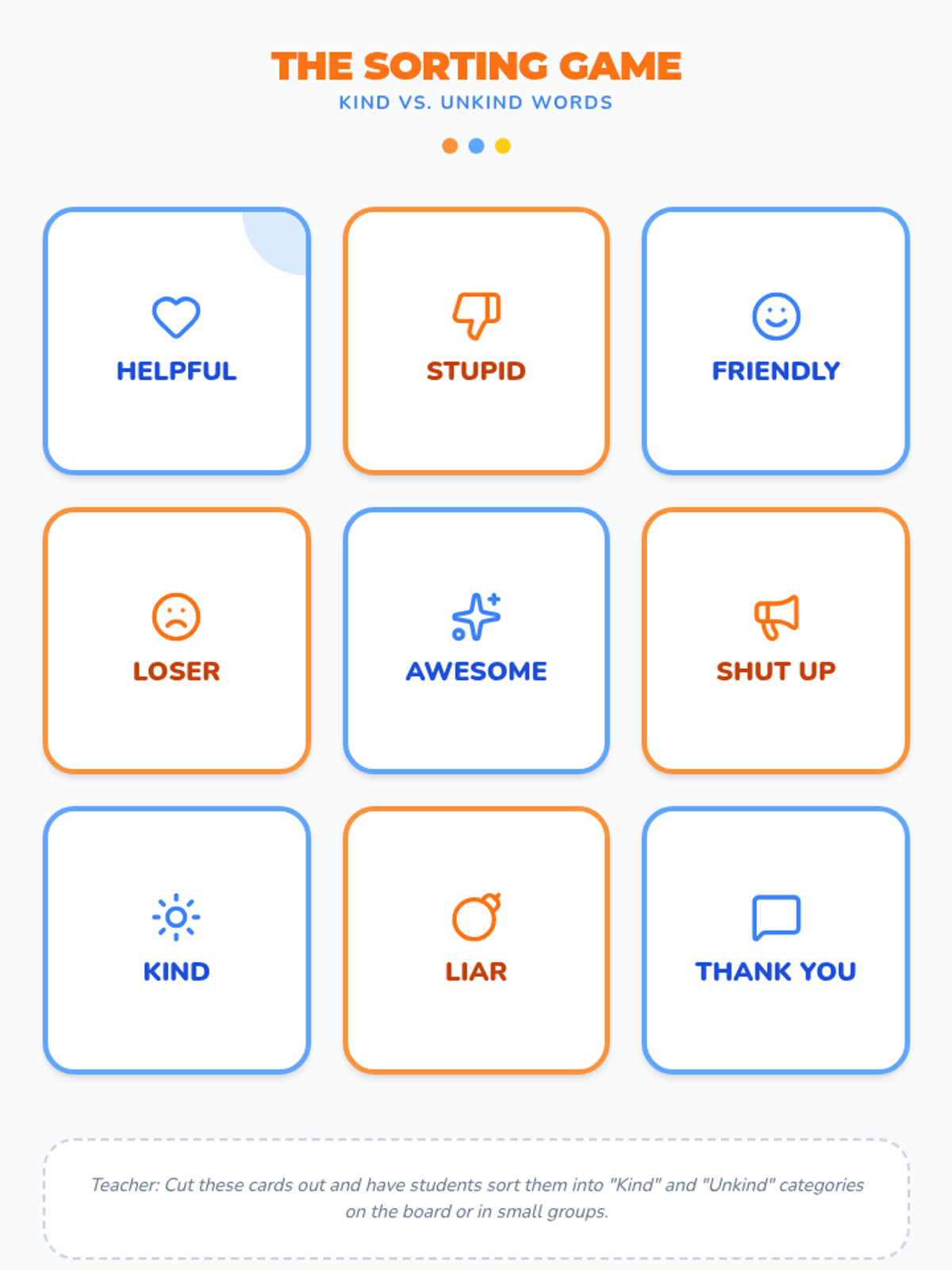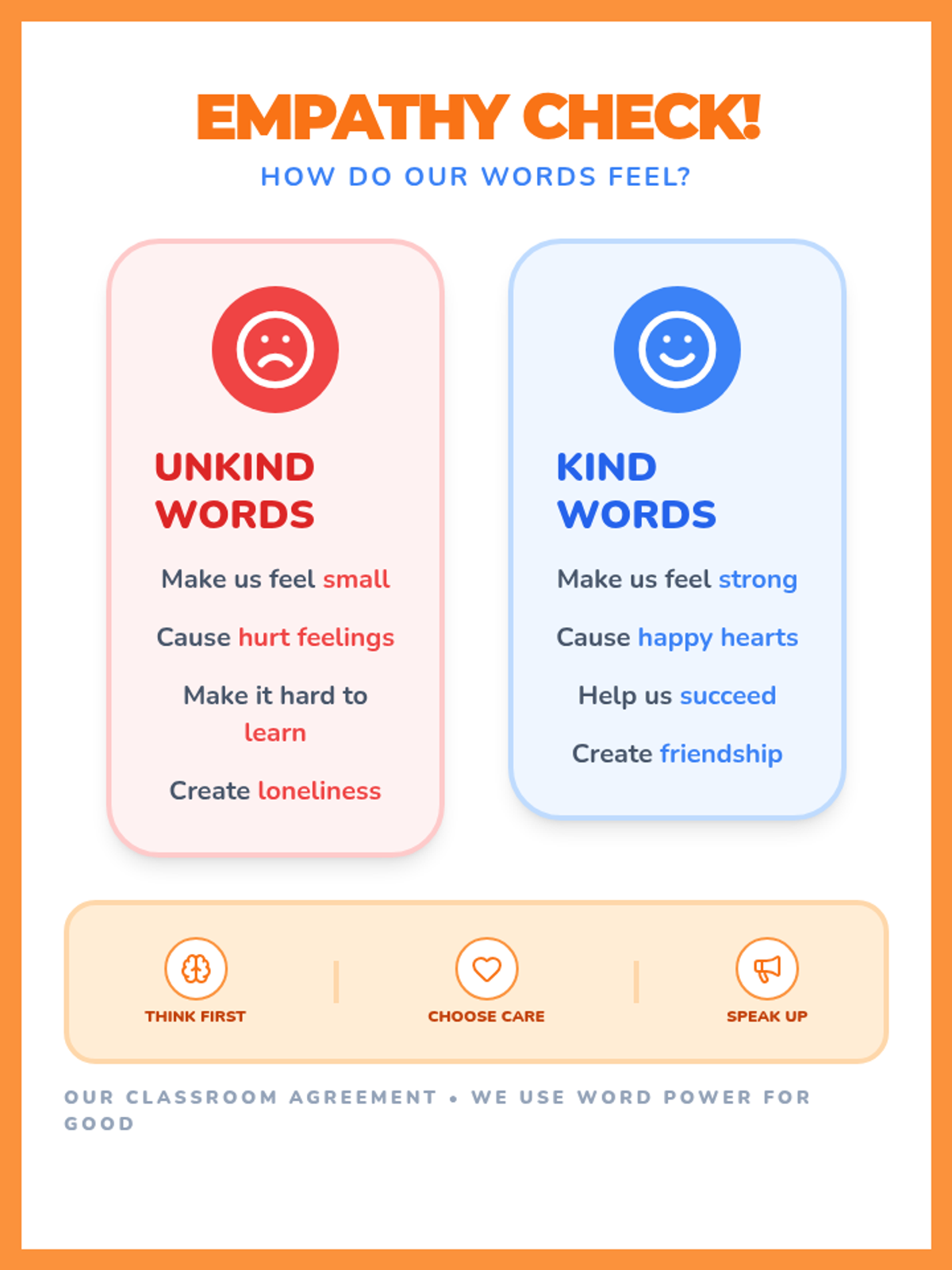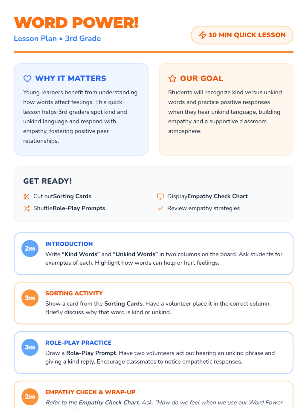 A quick, 10-minute lesson for 3rd graders to help them distinguish between kind and unkind words and practice empathetic responses.