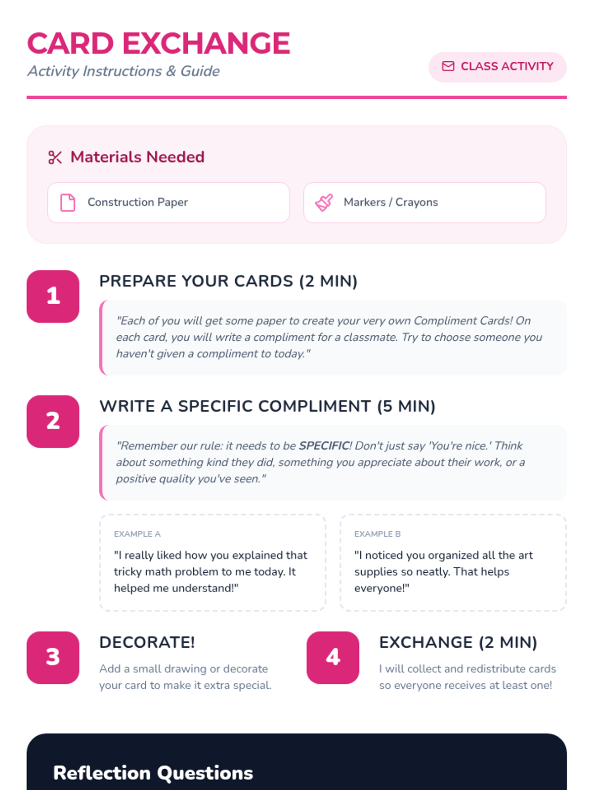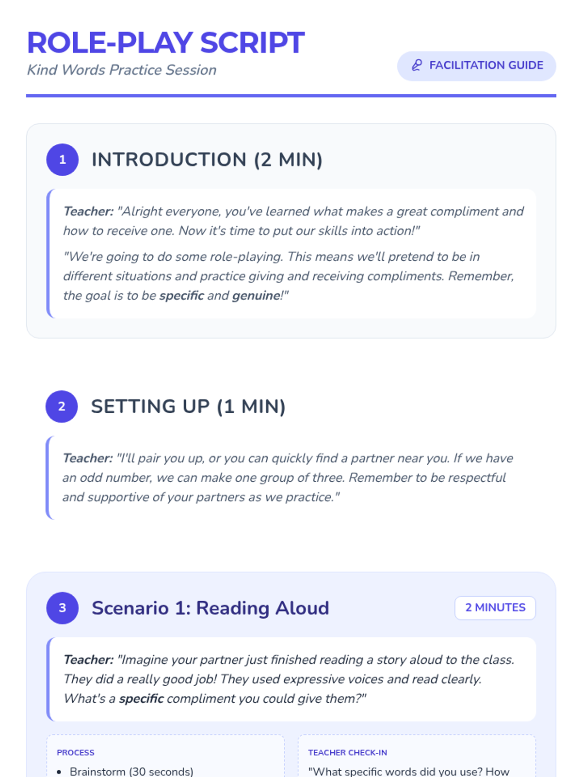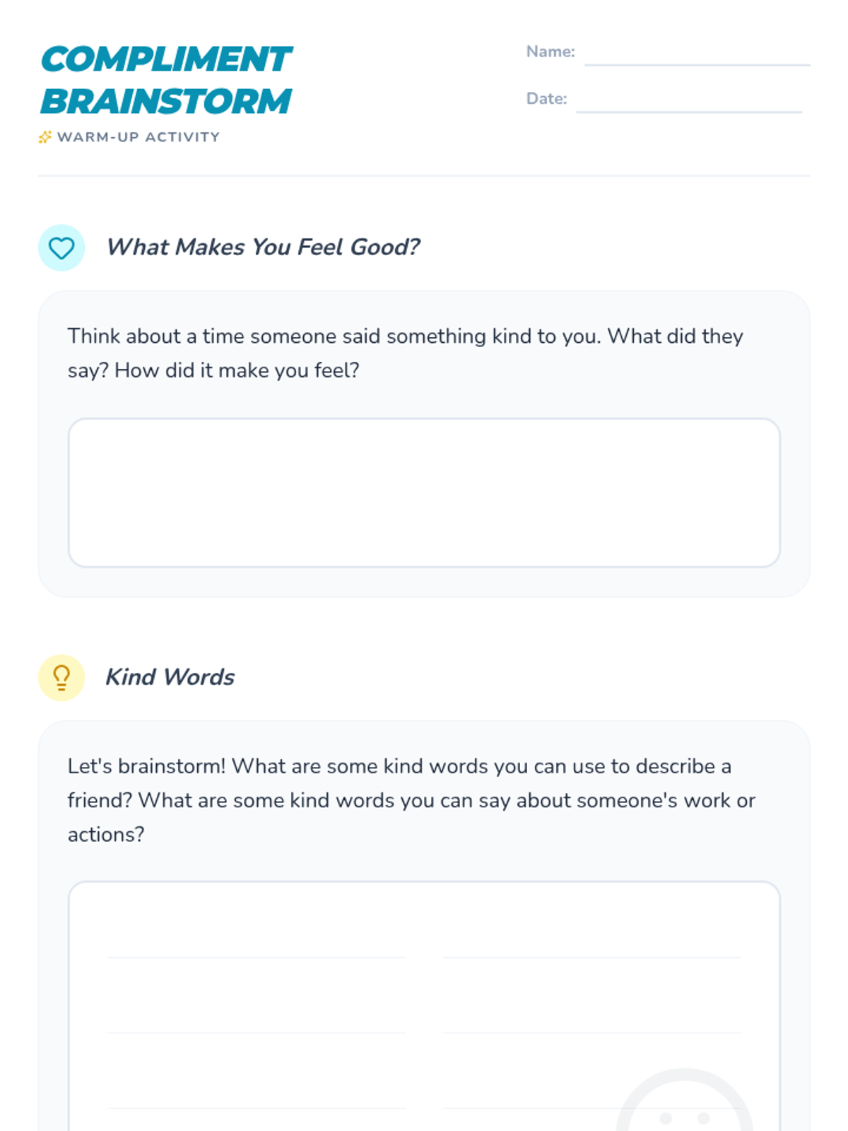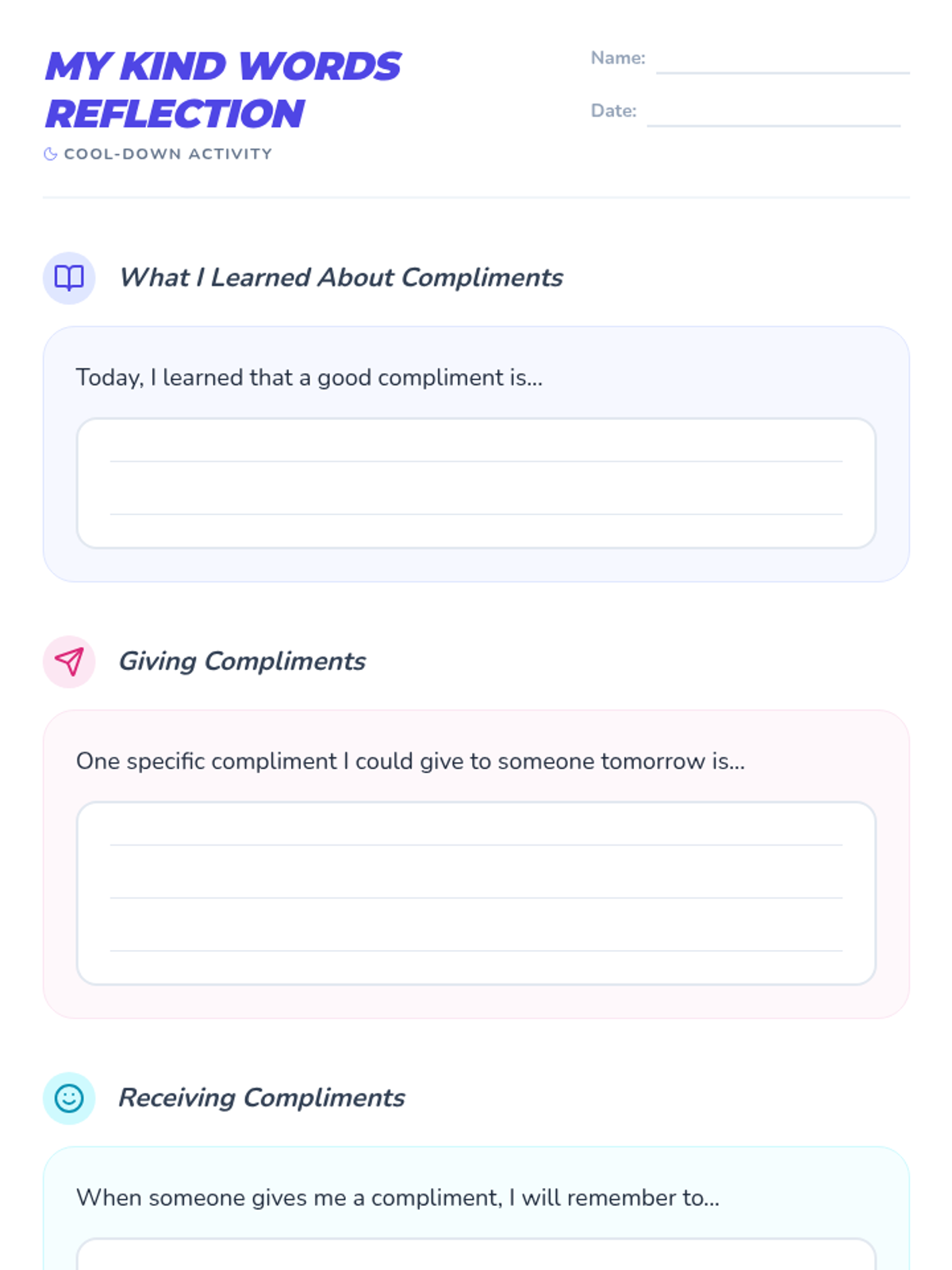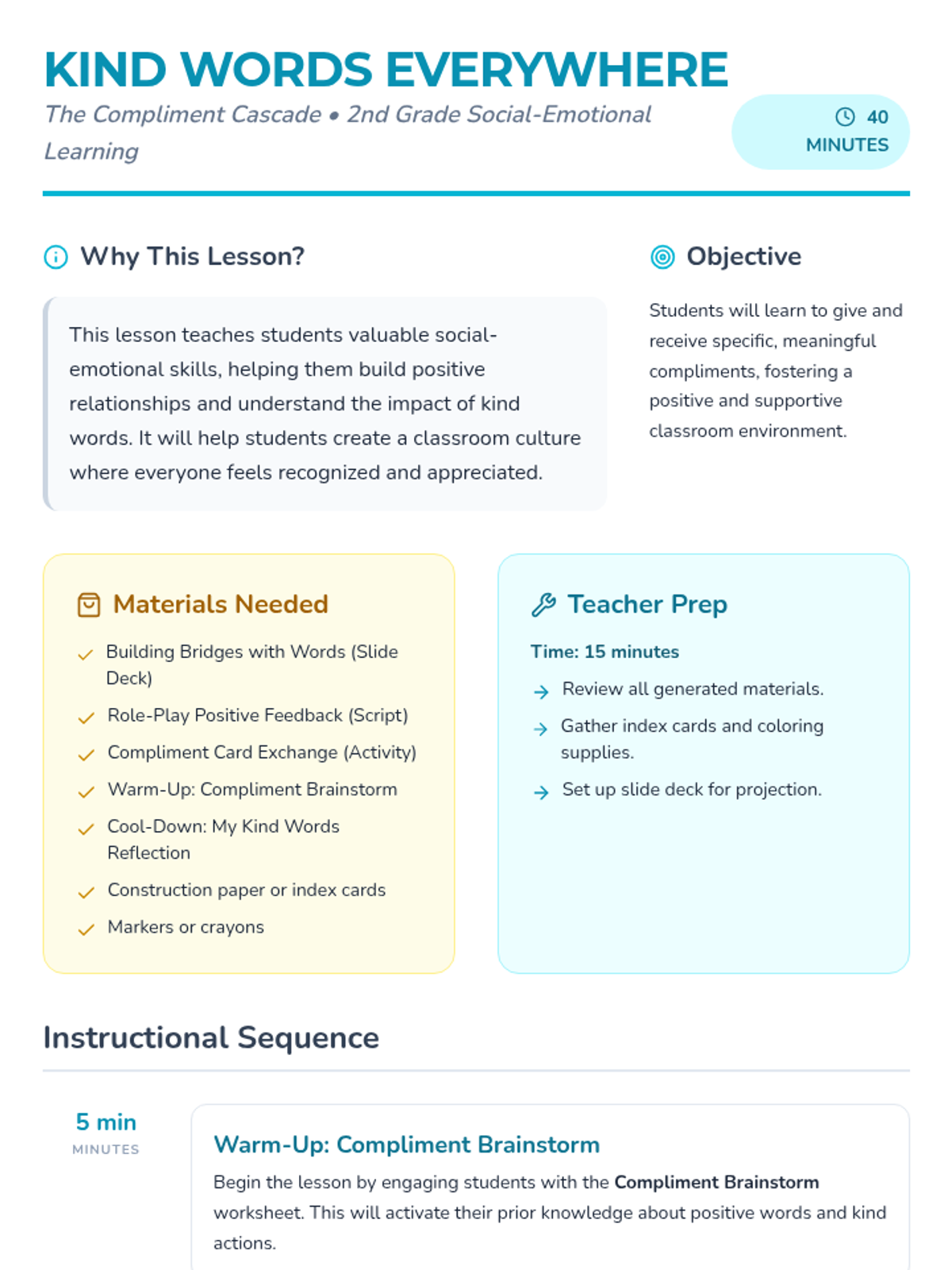 This lesson teaches students the power of verbal praise and how to give specific, positive feedback through role-play and a compliment card exchange.