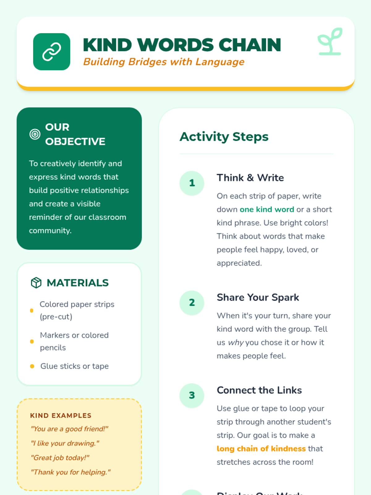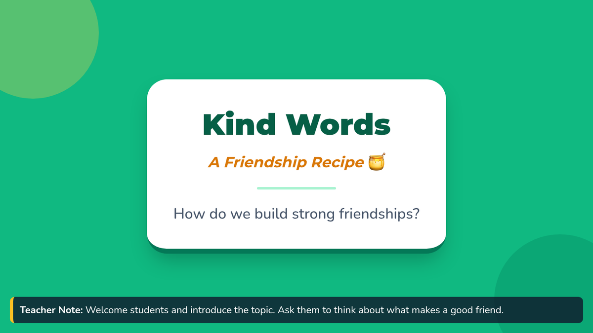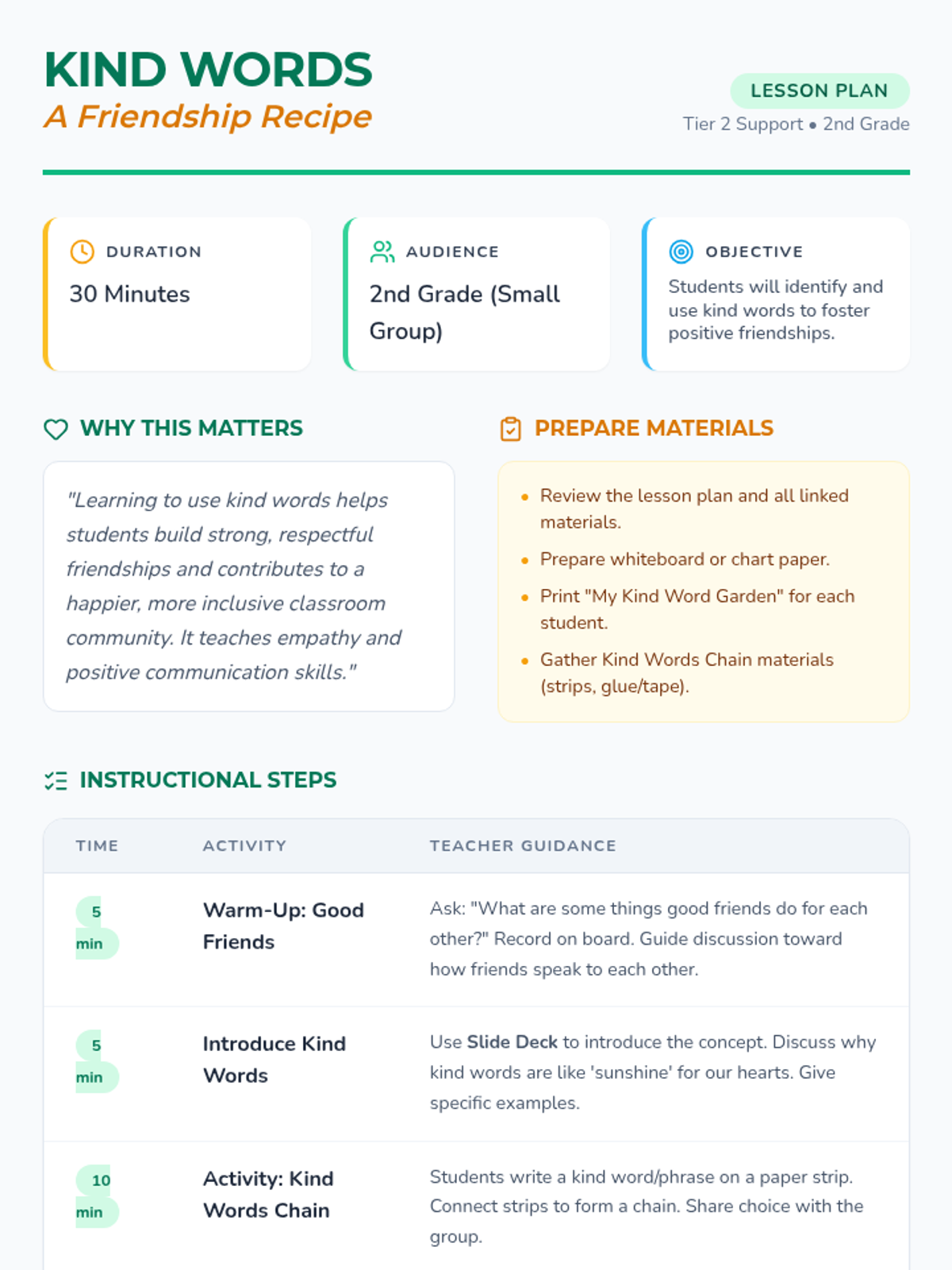 This Tier 2 lesson for 2nd graders uses garden and recipe metaphors to teach students the value of kind language in building friendships through a slide deck, a collaborative paper chain activity, and an individual garden-themed worksheet.