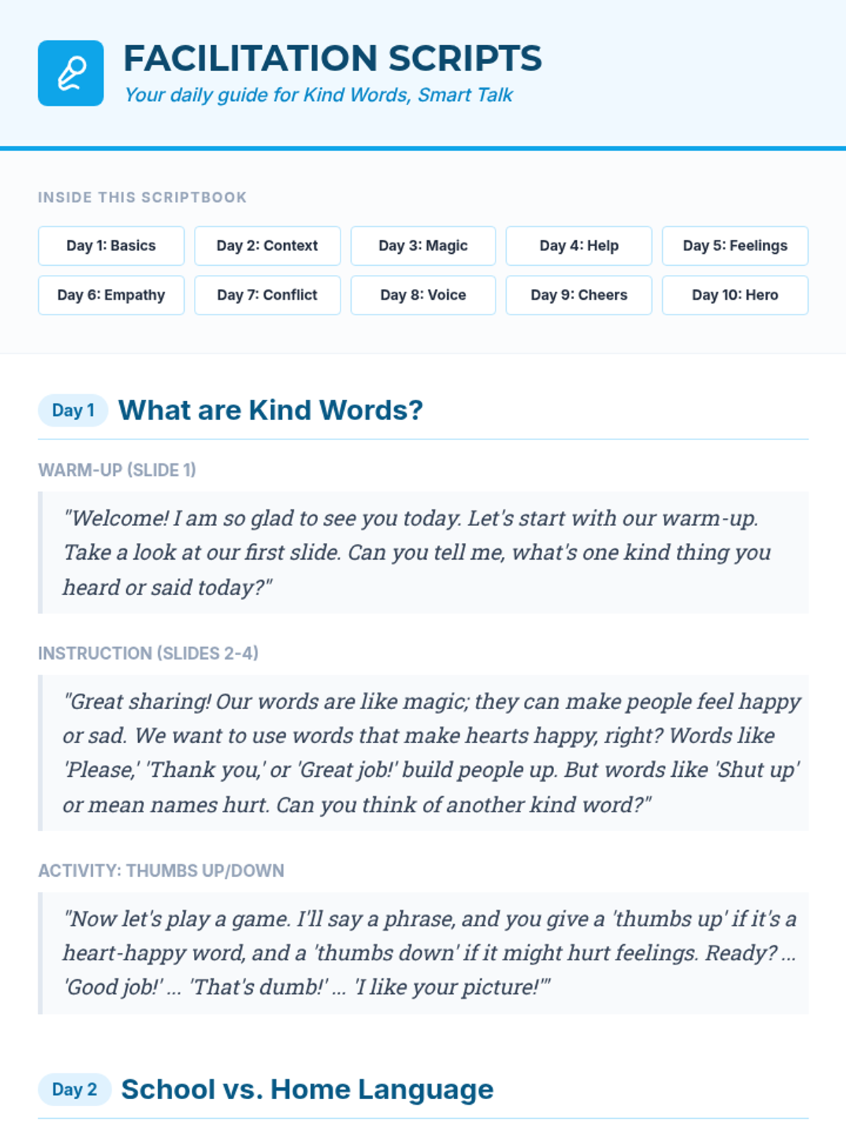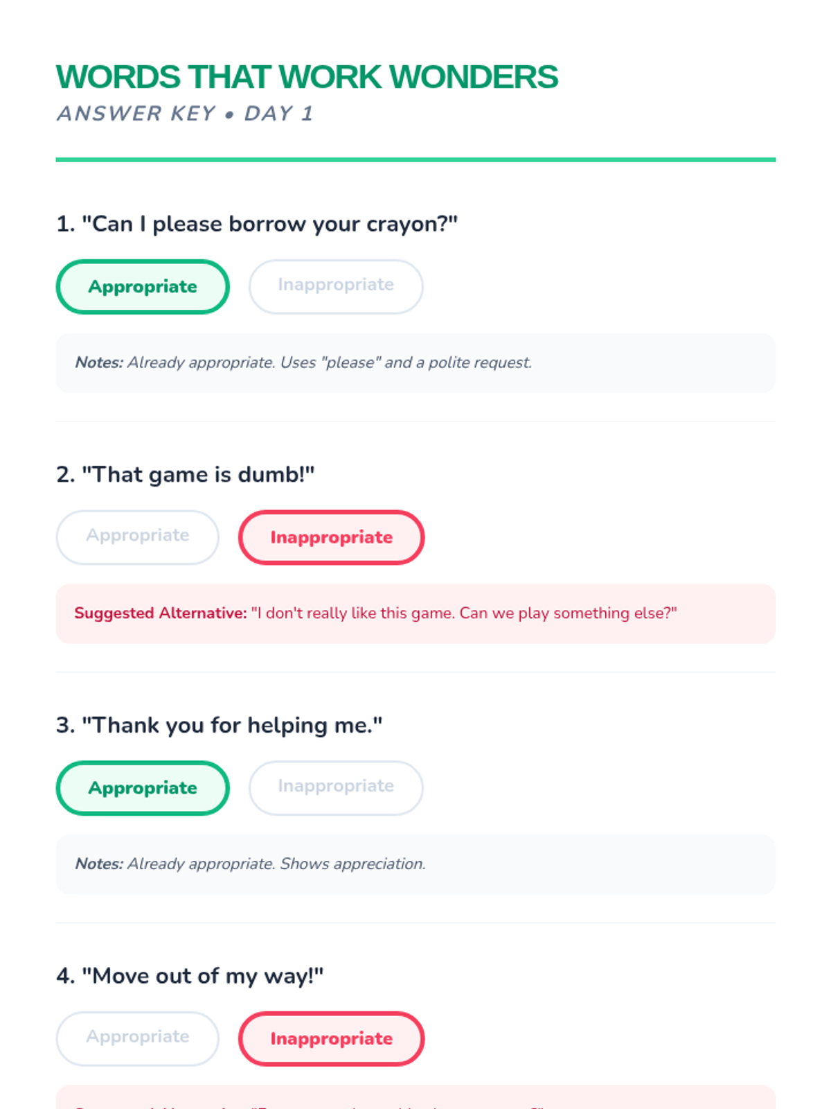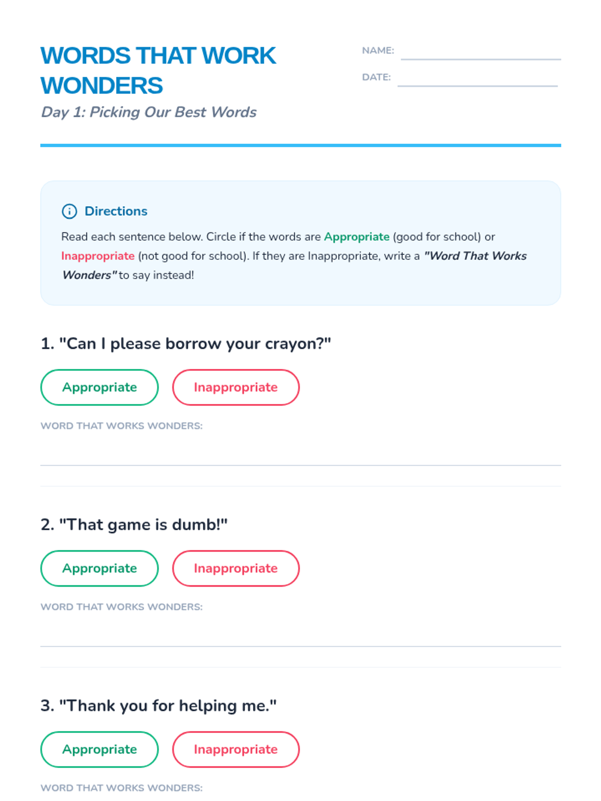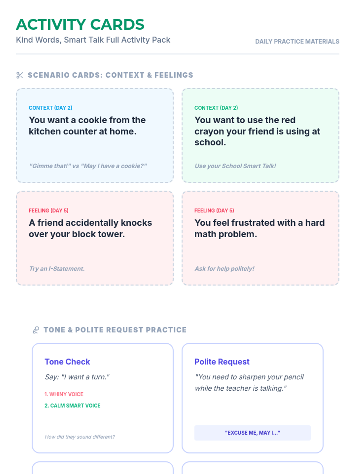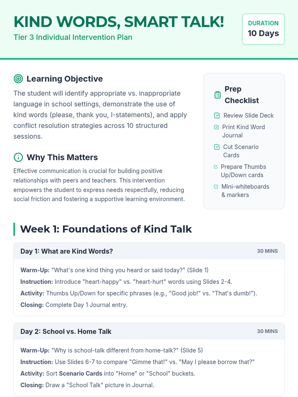 A 10-day series of 30-minute daily sessions designed to help a 1st-grade student with an IEP master appropriate school language, request help politely, and express feelings respectfully.