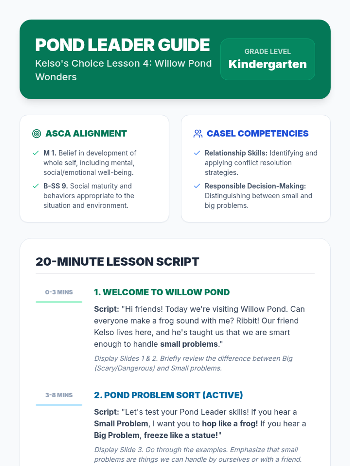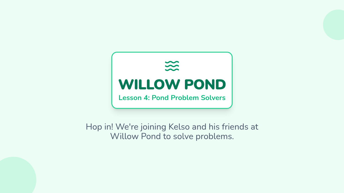 A conflict resolution lesson based on the Willow Pond storybook, featuring movement-based activities to help K-2 students distinguish between 'big' and 'small' problems and apply Kelso's Choices. Includes specific timing tracks for Kindergarten (20 mins) and Grades 1-2 (30 mins) with ASCA and CASEL alignment.
