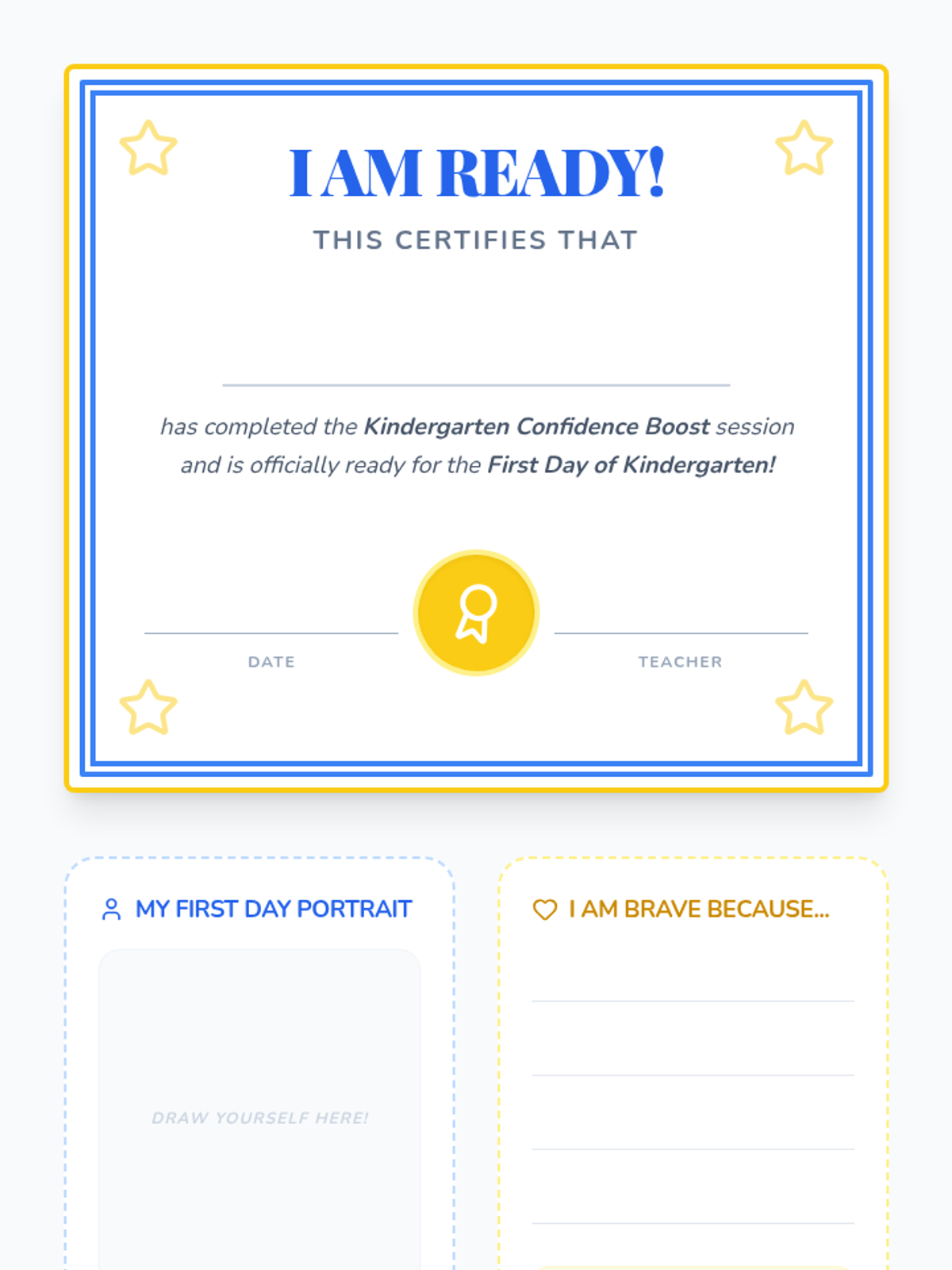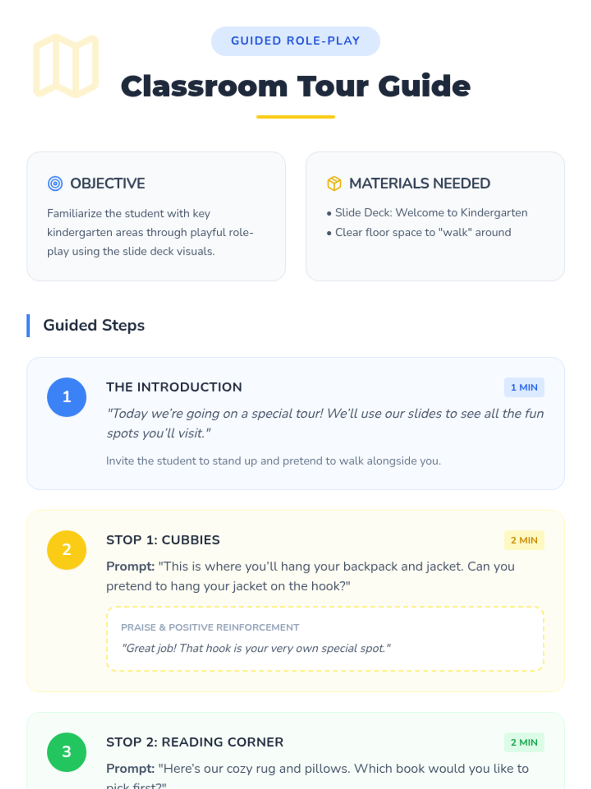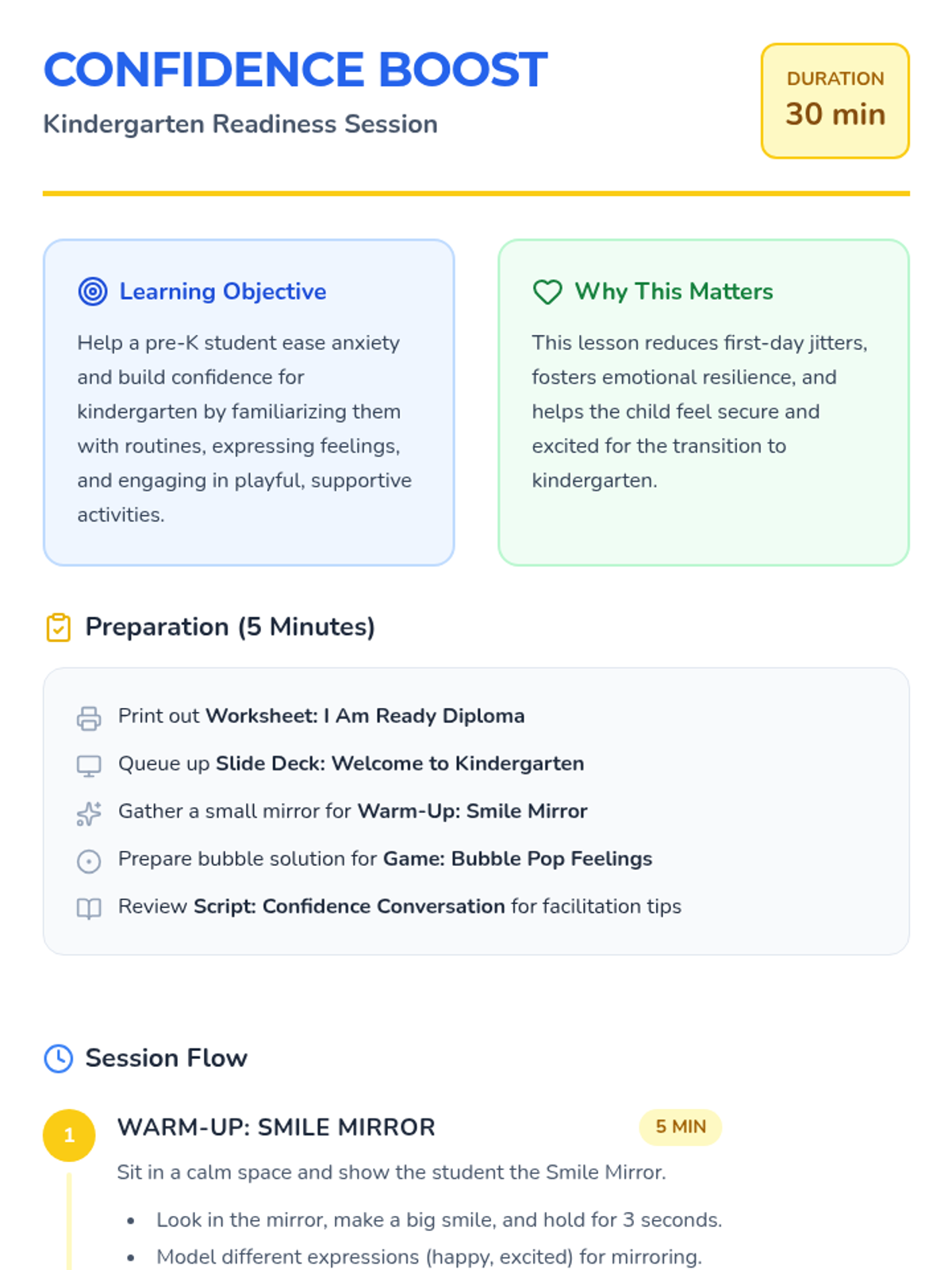A 30-minute individual session designed to ease kindergarten anxiety and build confidence in pre-K students through play, role-play, and emotional expression.