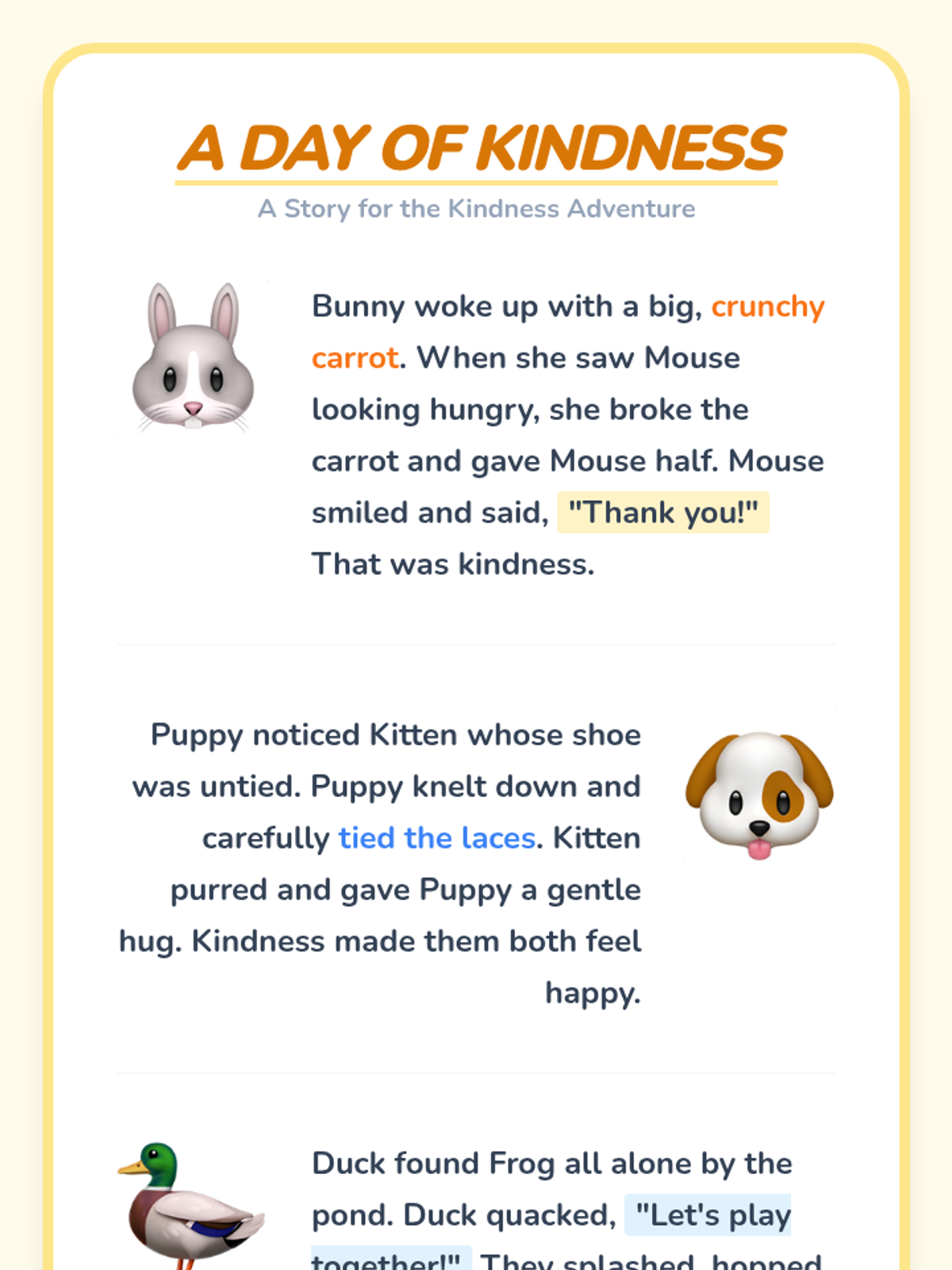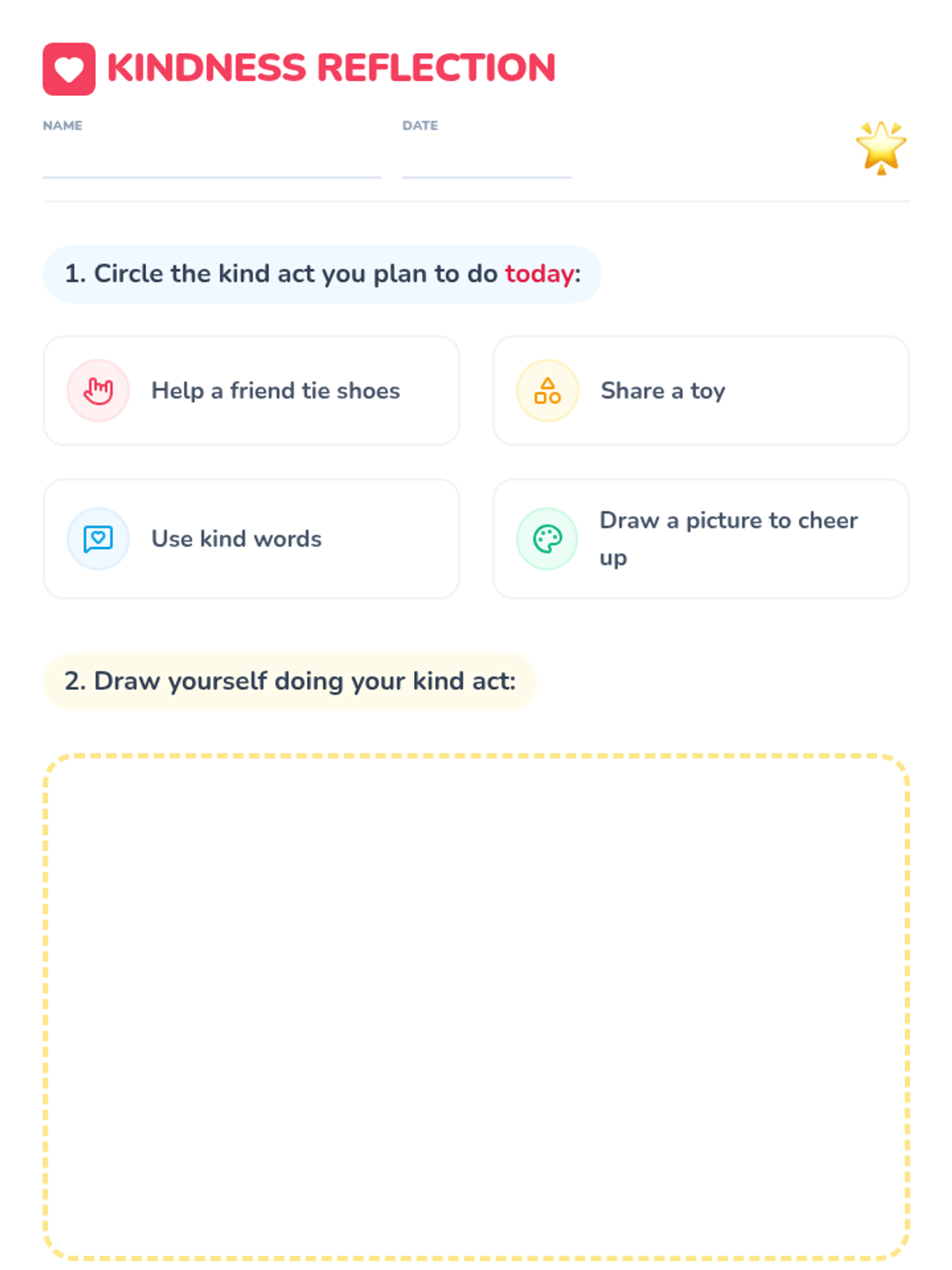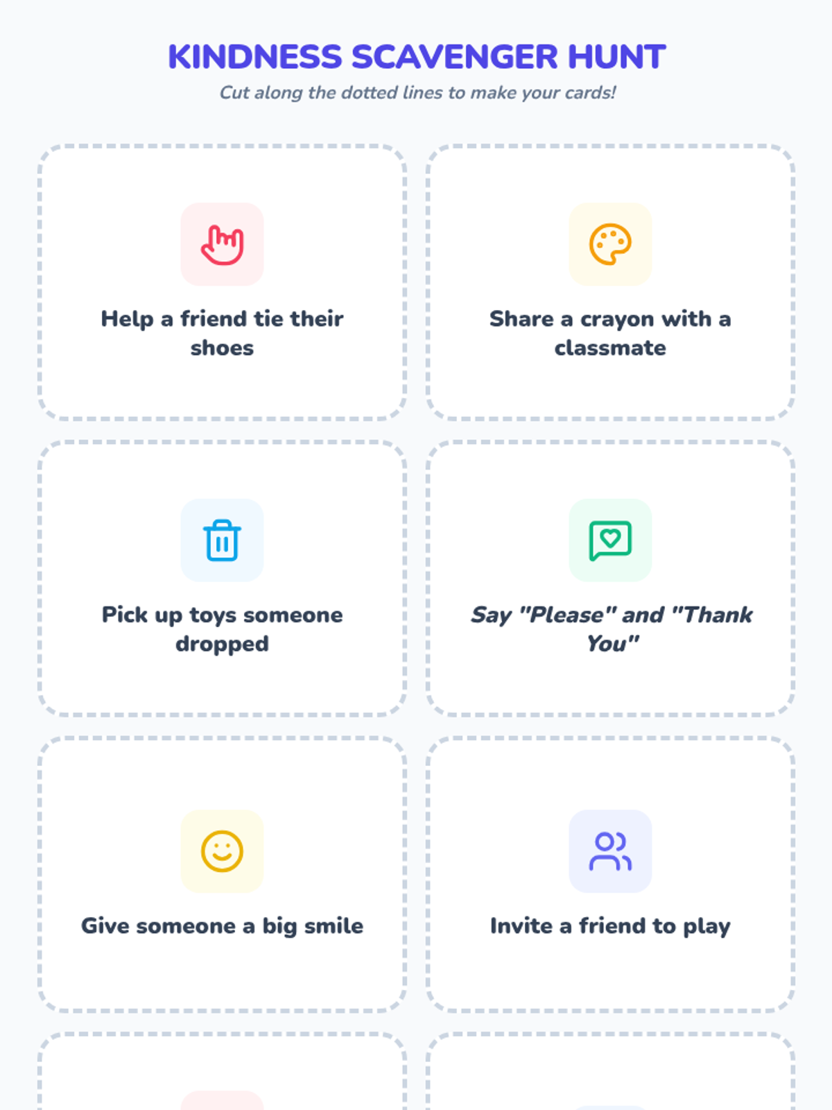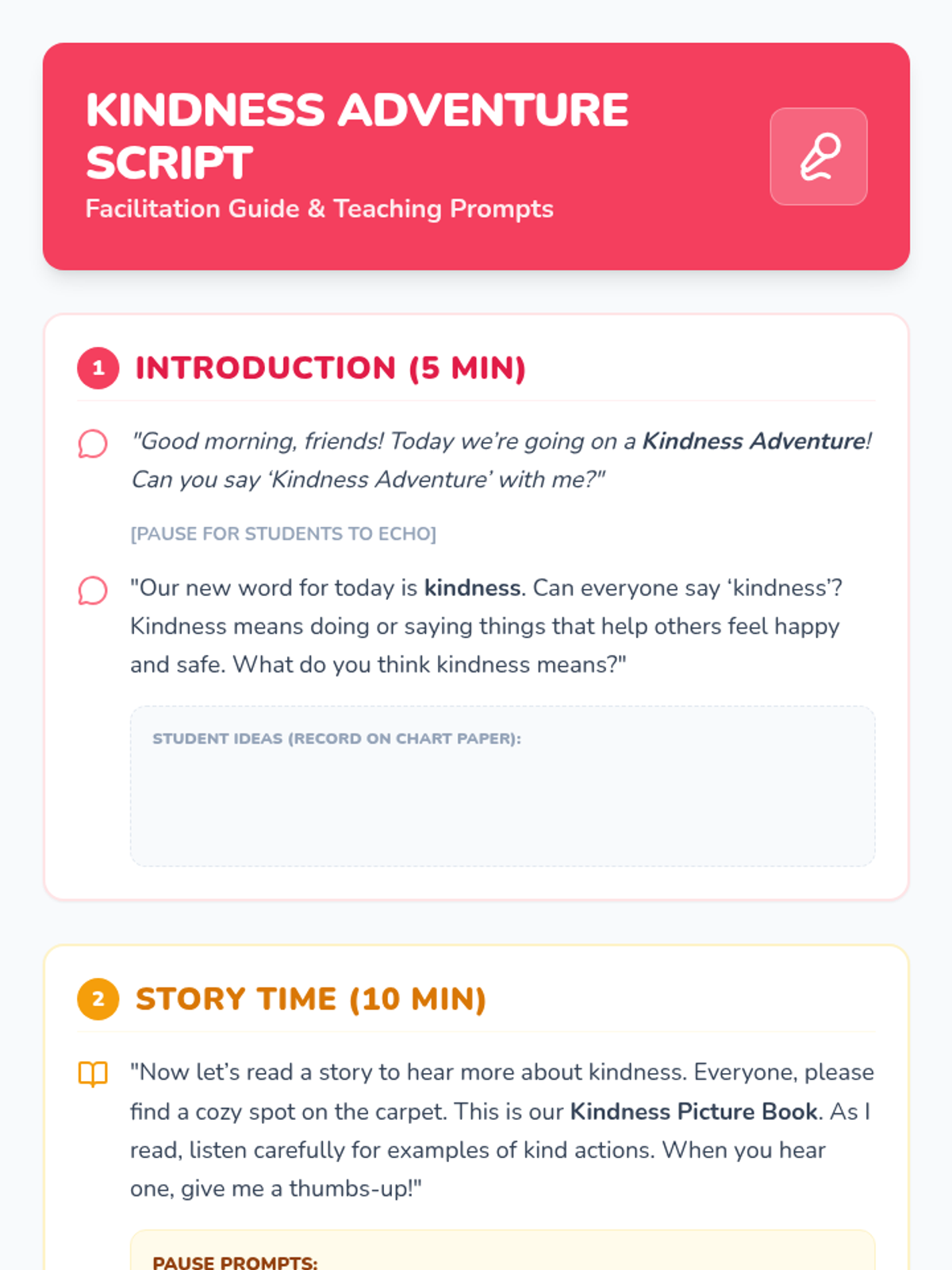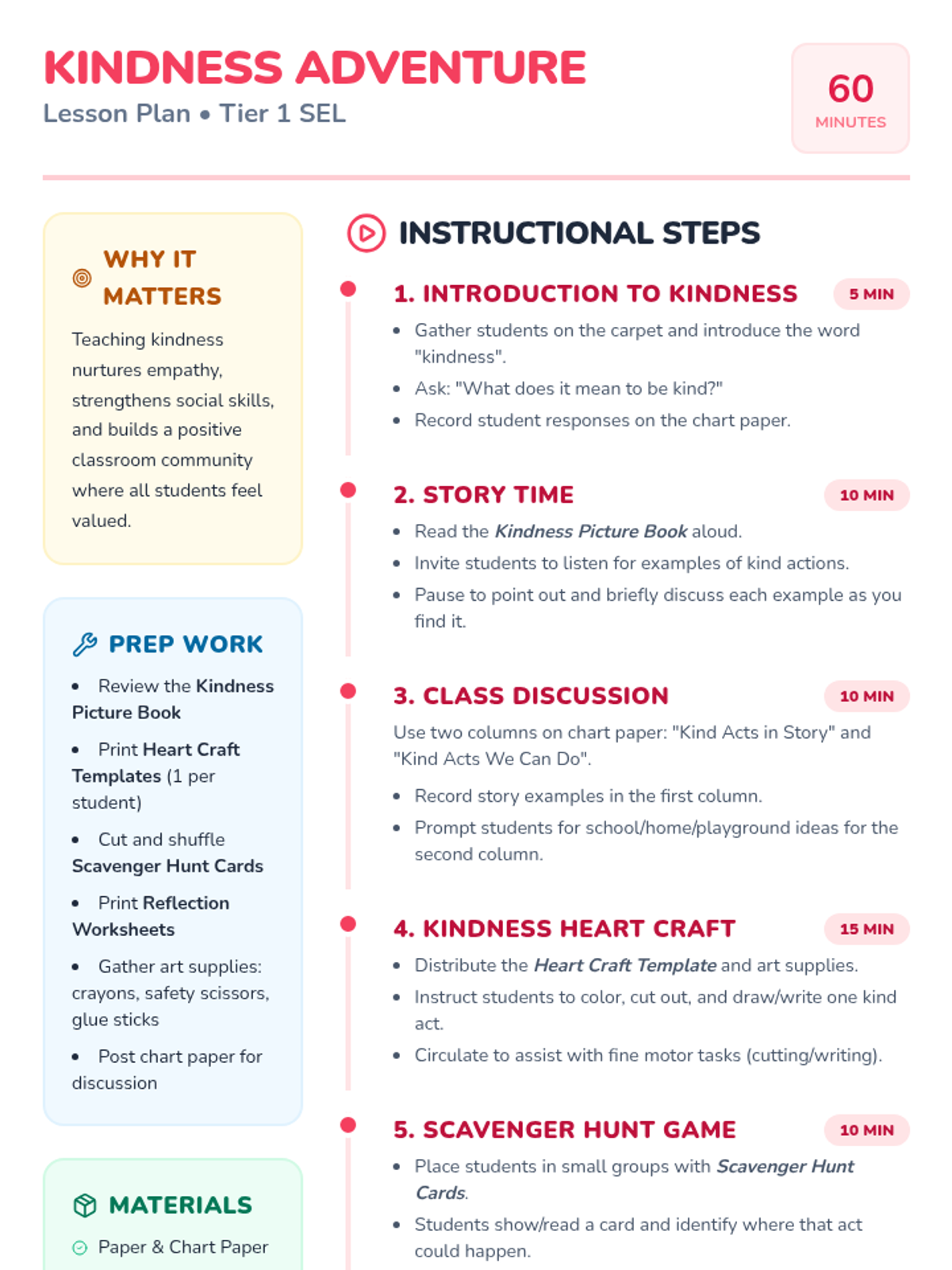 A 60-minute kindergarten lesson that introduces the concept of kindness through a picture book, a heart craft, and a cooperative scavenger hunt game. Students will practice empathy and identify simple ways to be kind every day.