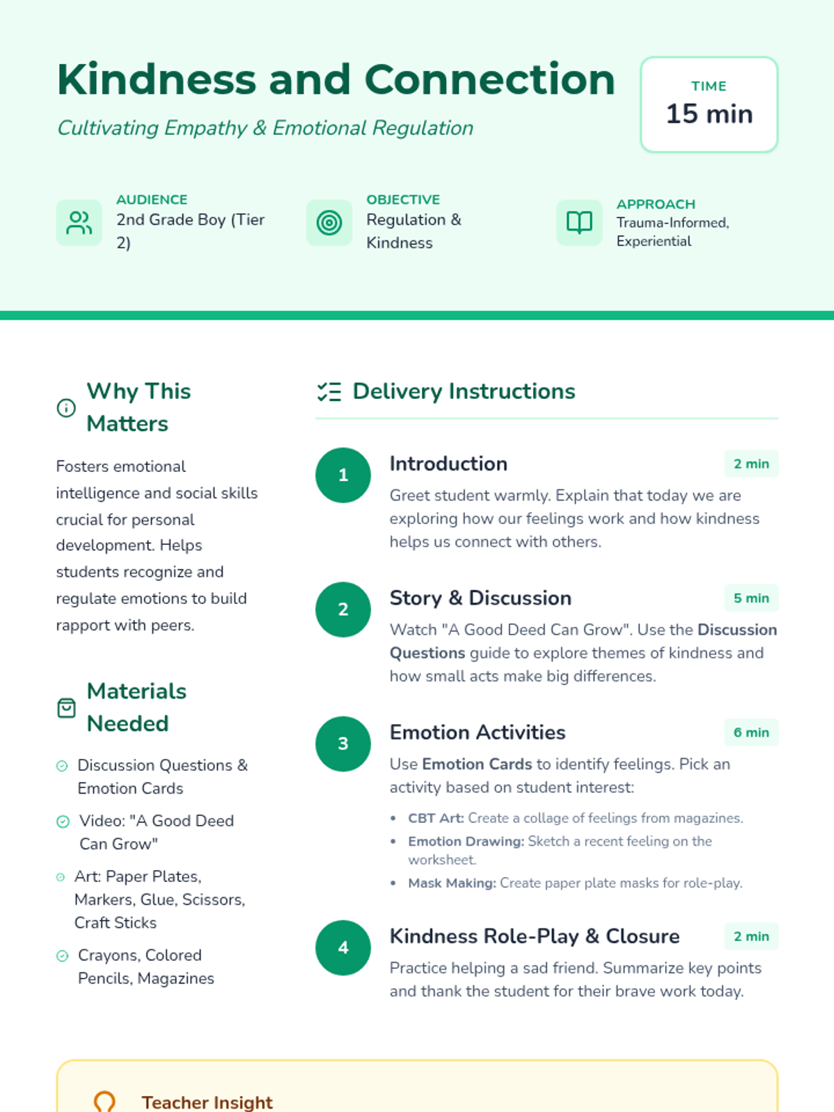A Tier 2 lesson for 2nd-grade students focusing on recognizing emotions, practicing kindness, and building peer rapport through collaborative art and role-play.