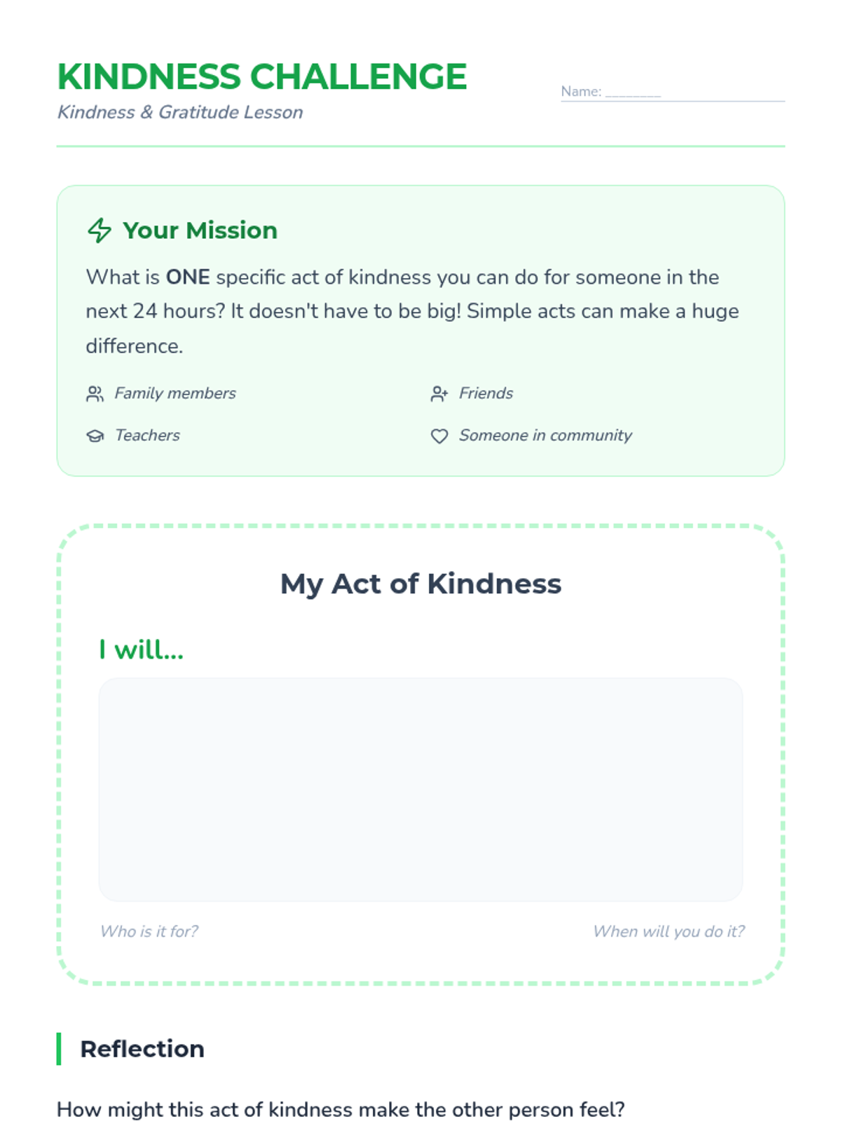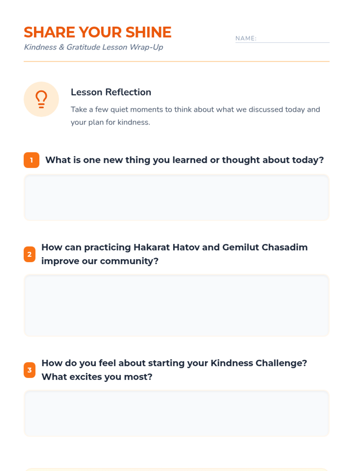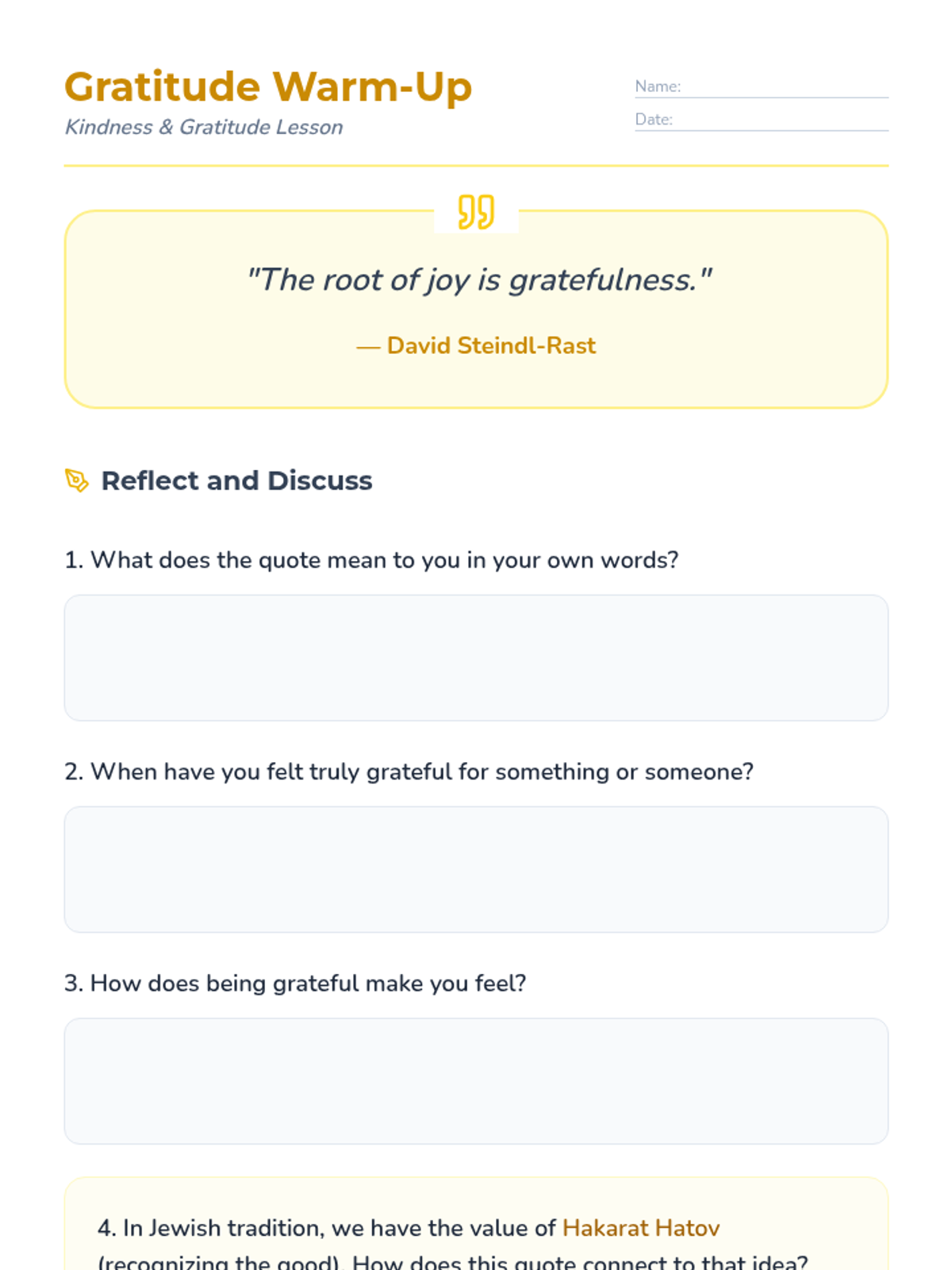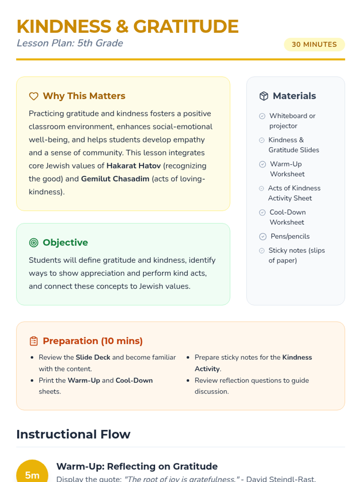 A 30-minute lesson for 5th graders exploring gratitude (Hakarat Hatov) and kindness (Gemilut Chasadim) through Jewish values, featuring reflection and a personal kindness challenge.