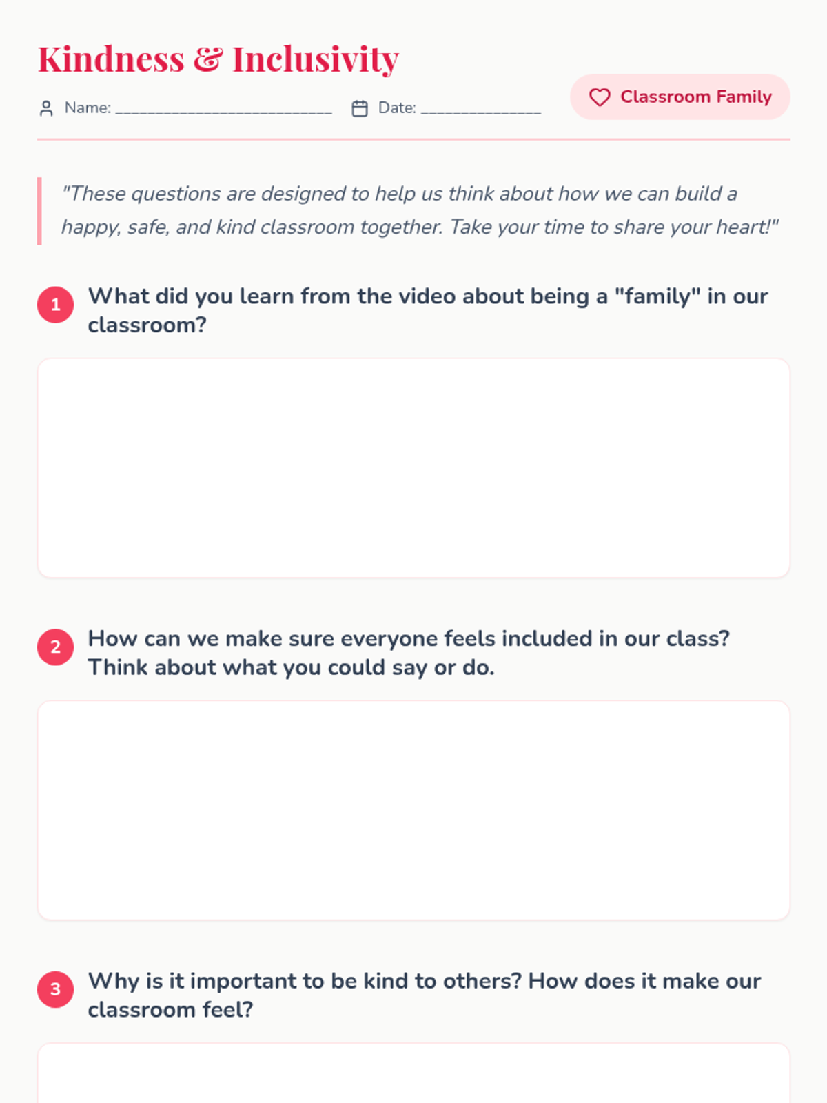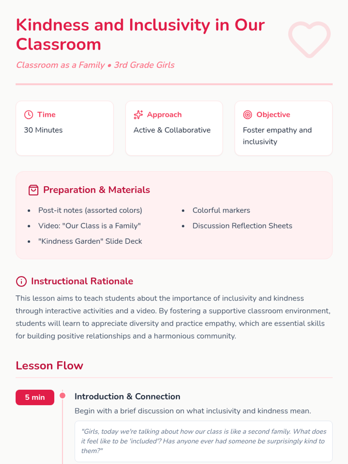 A heartwarming lesson for 3rd-grade girls focused on building empathy and a supportive classroom community through the concept of 'Classroom as a Family.' students will explore inclusivity through a read-aloud video and collaborative brainstorming.