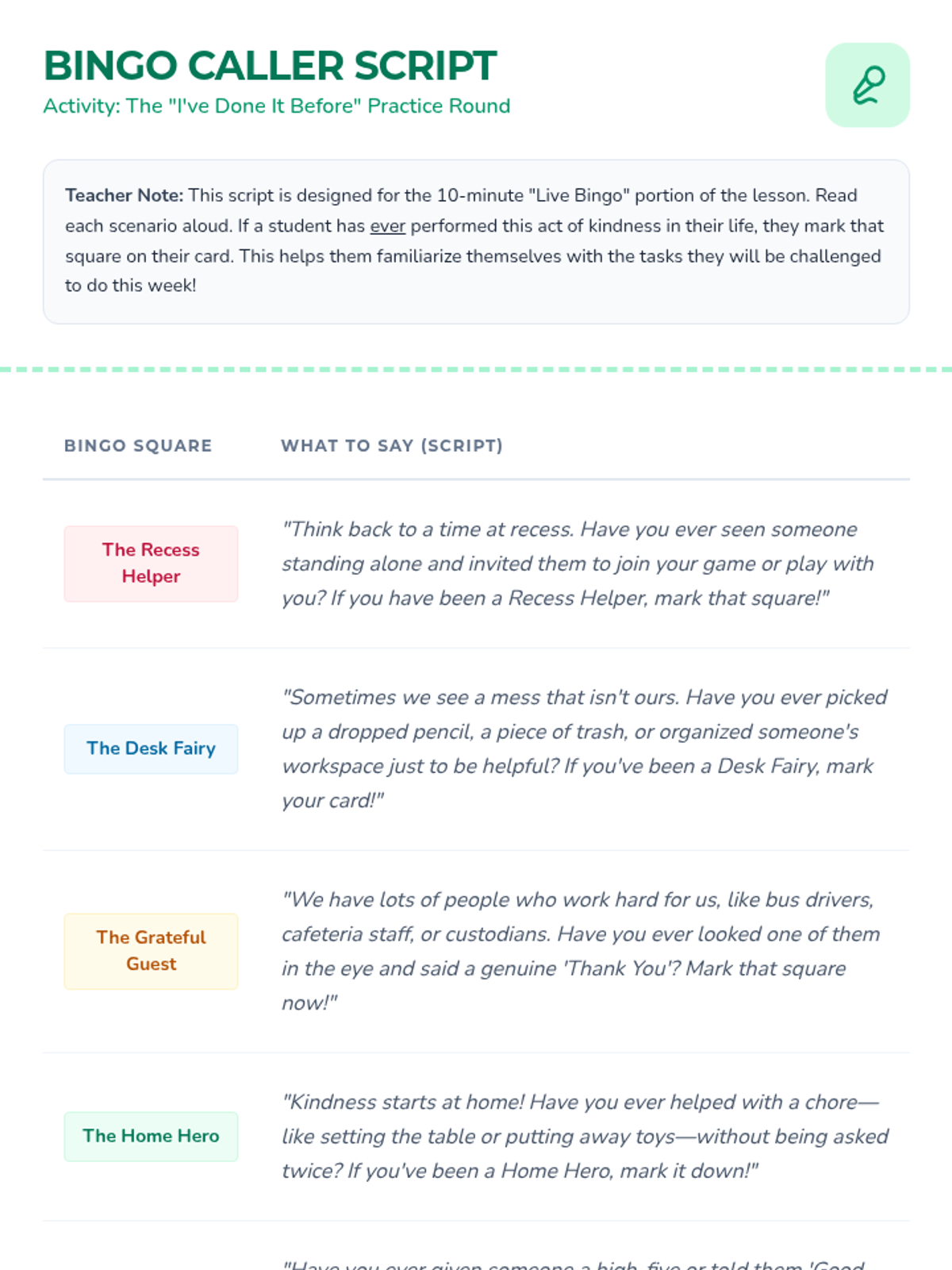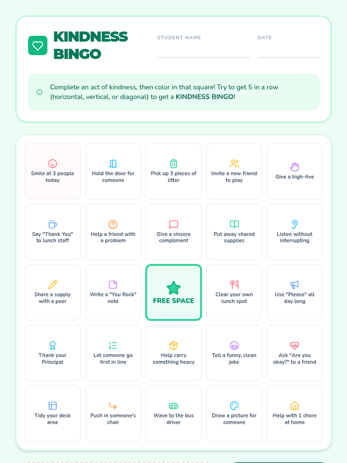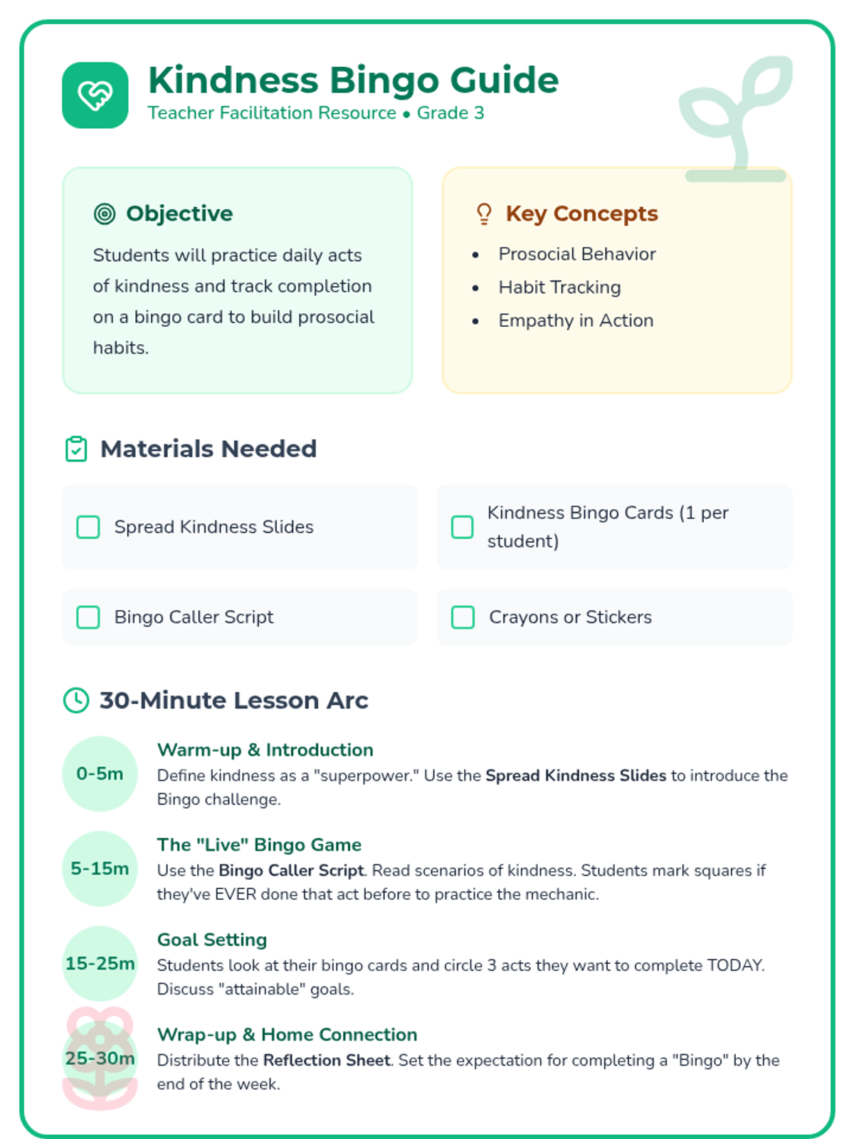 A 30-minute social-emotional learning lesson where 3rd graders explore and practice daily acts of kindness through a gamified bingo challenge. Students identify attainable prosocial behaviors and set goals for spreading kindness at school and home.
