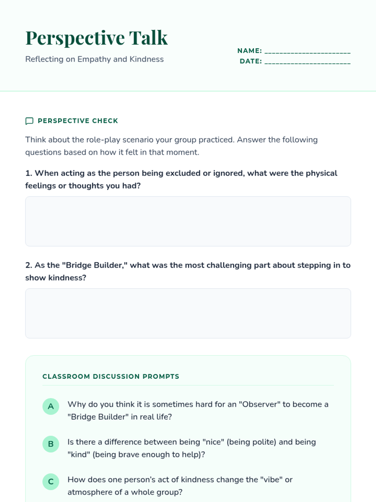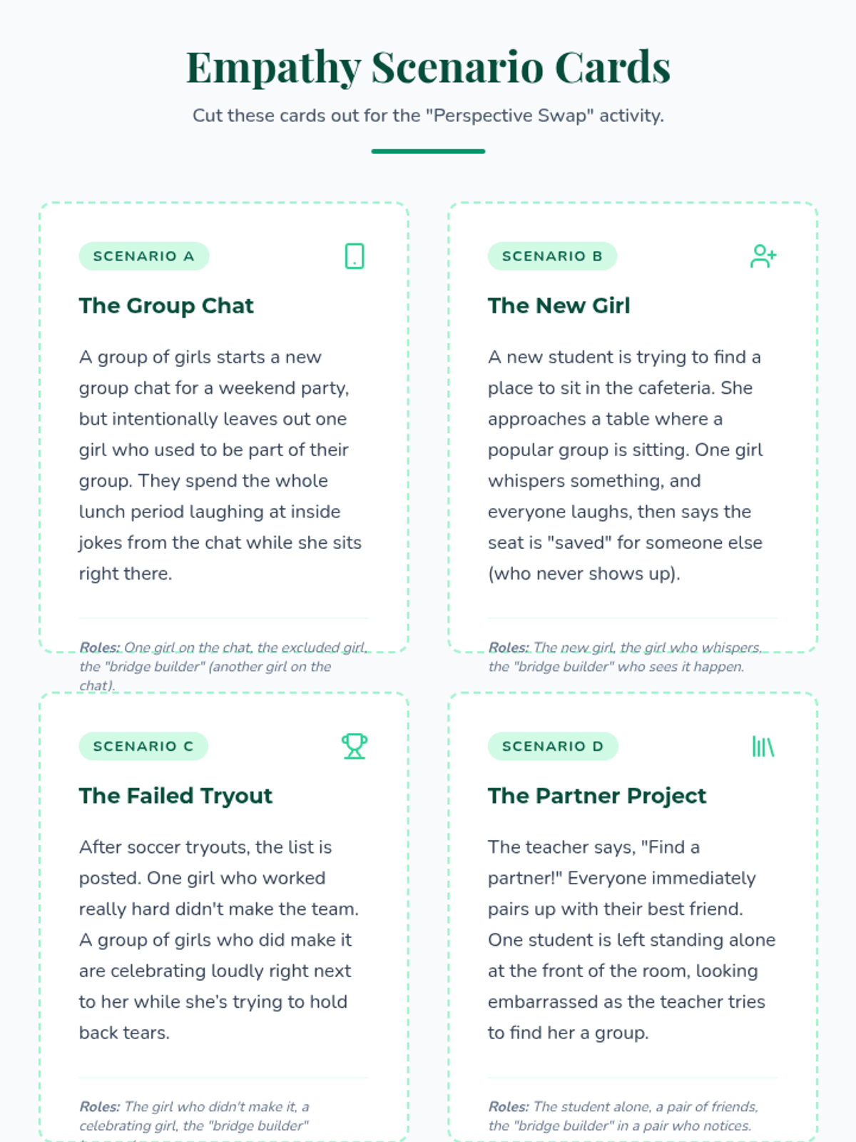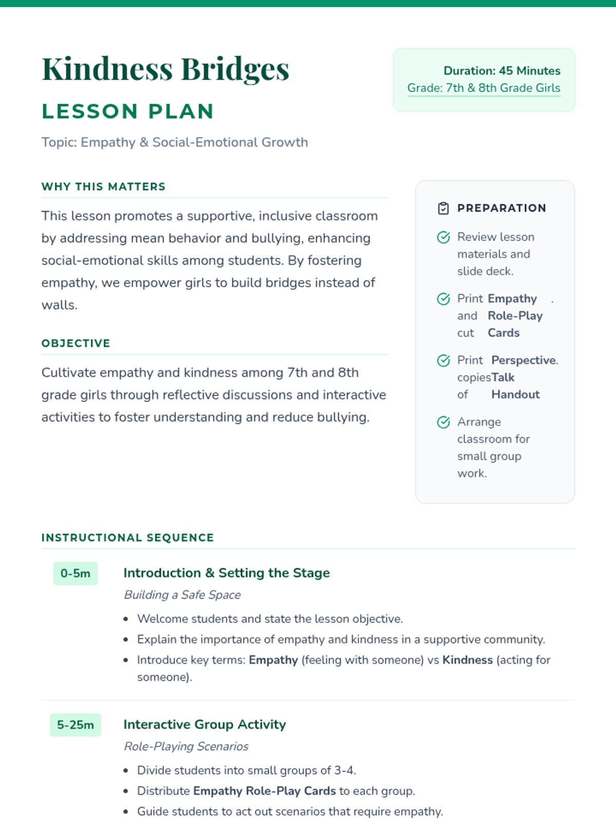 This lesson addresses mean behavior and bullying among 7th and 8th grade girls by fostering empathy and kindness through perspective-taking activities and reflective discussions.