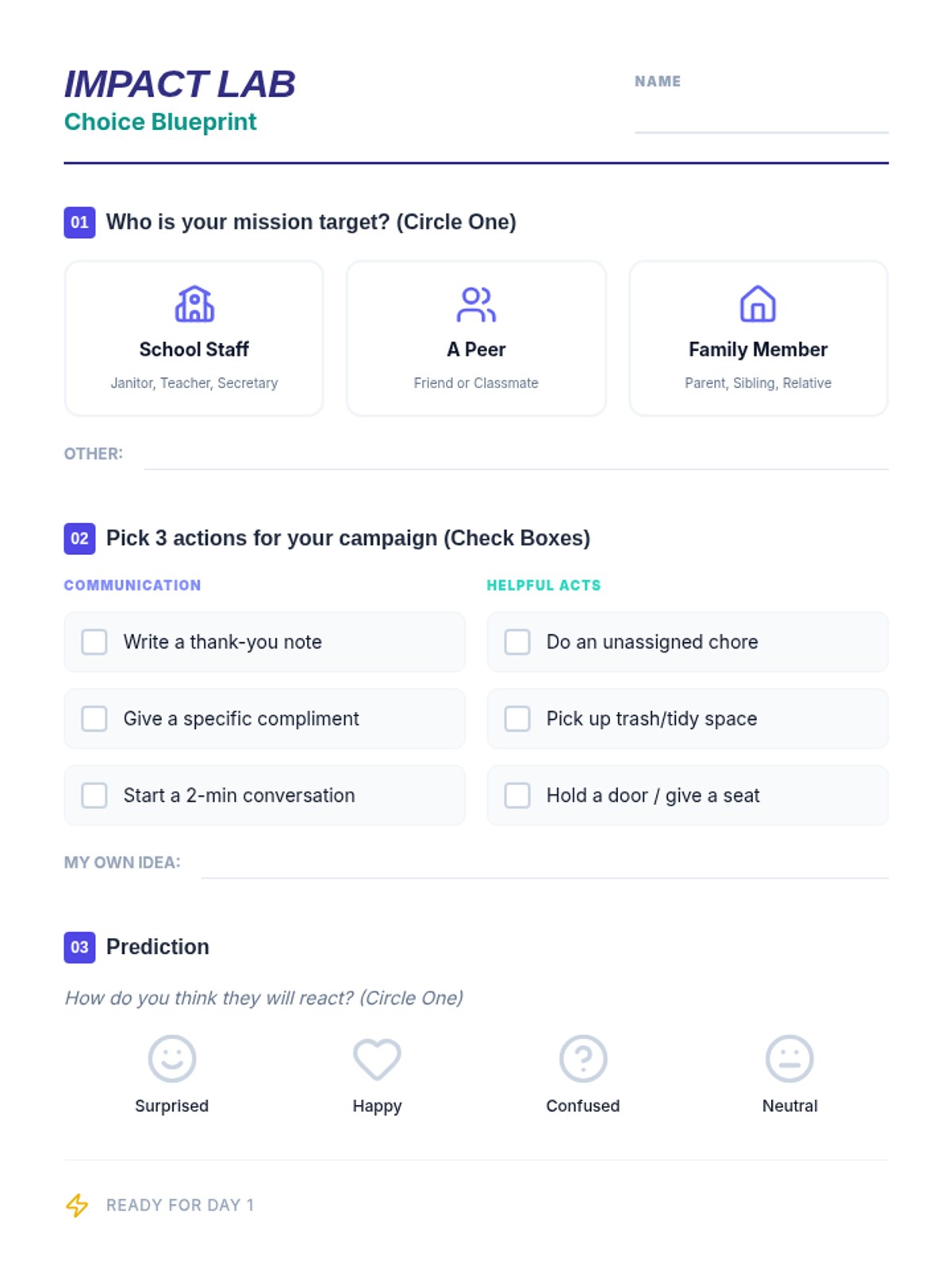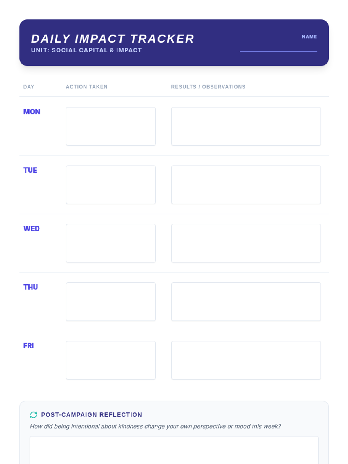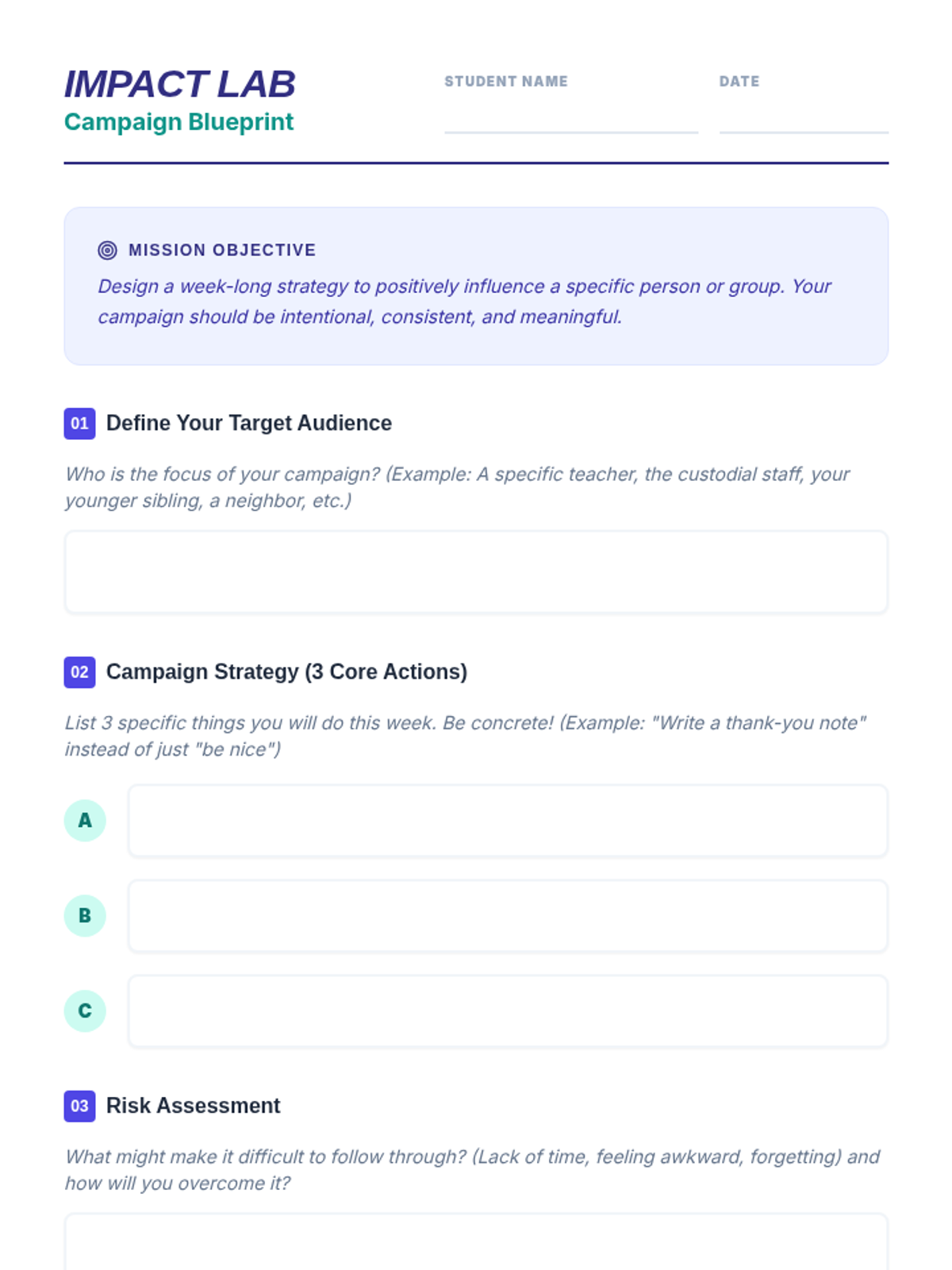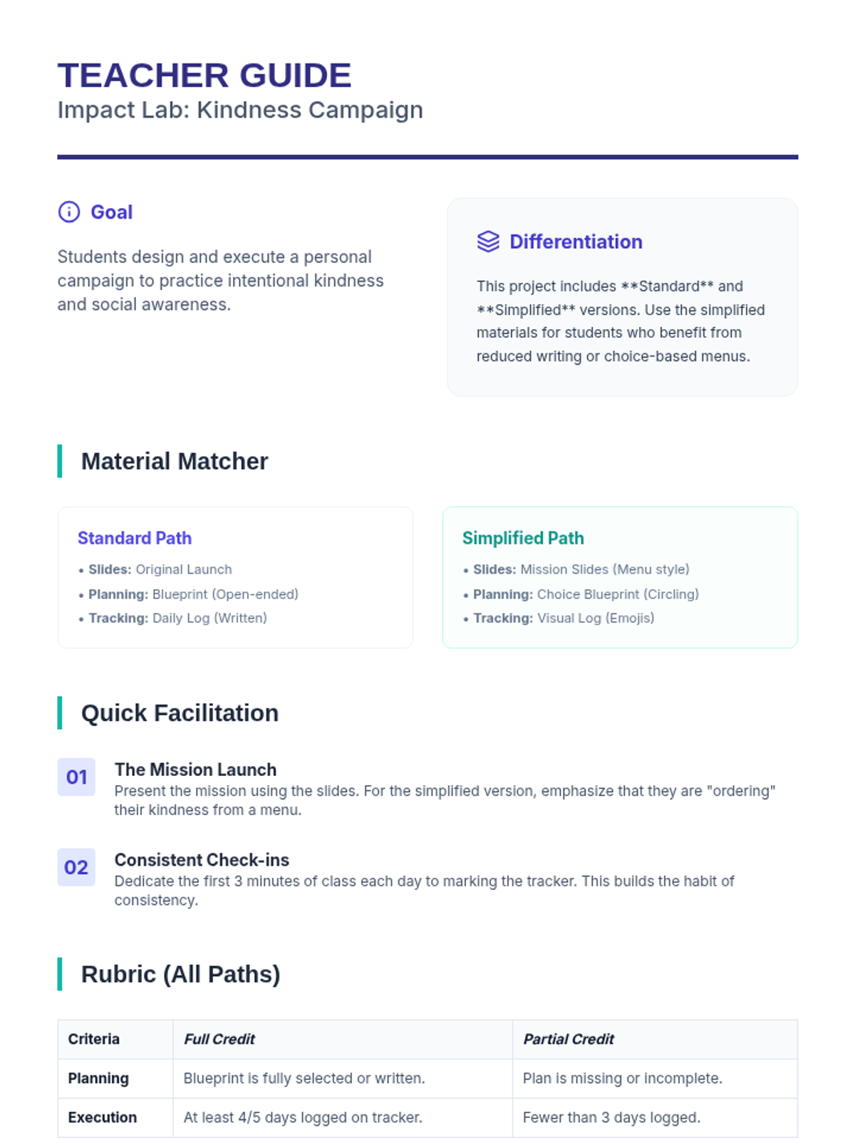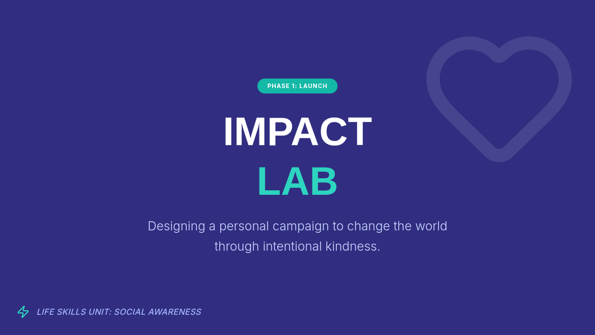 A project-based lesson where students design and execute a structured kindness campaign over the course of a week to develop social awareness and empathy.