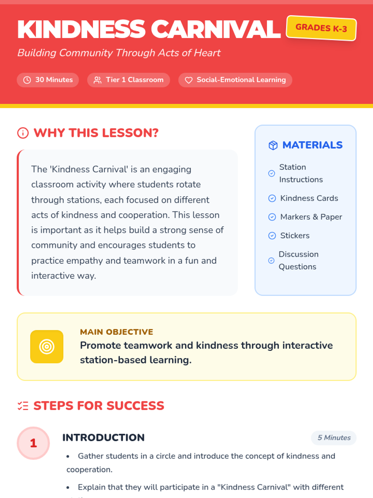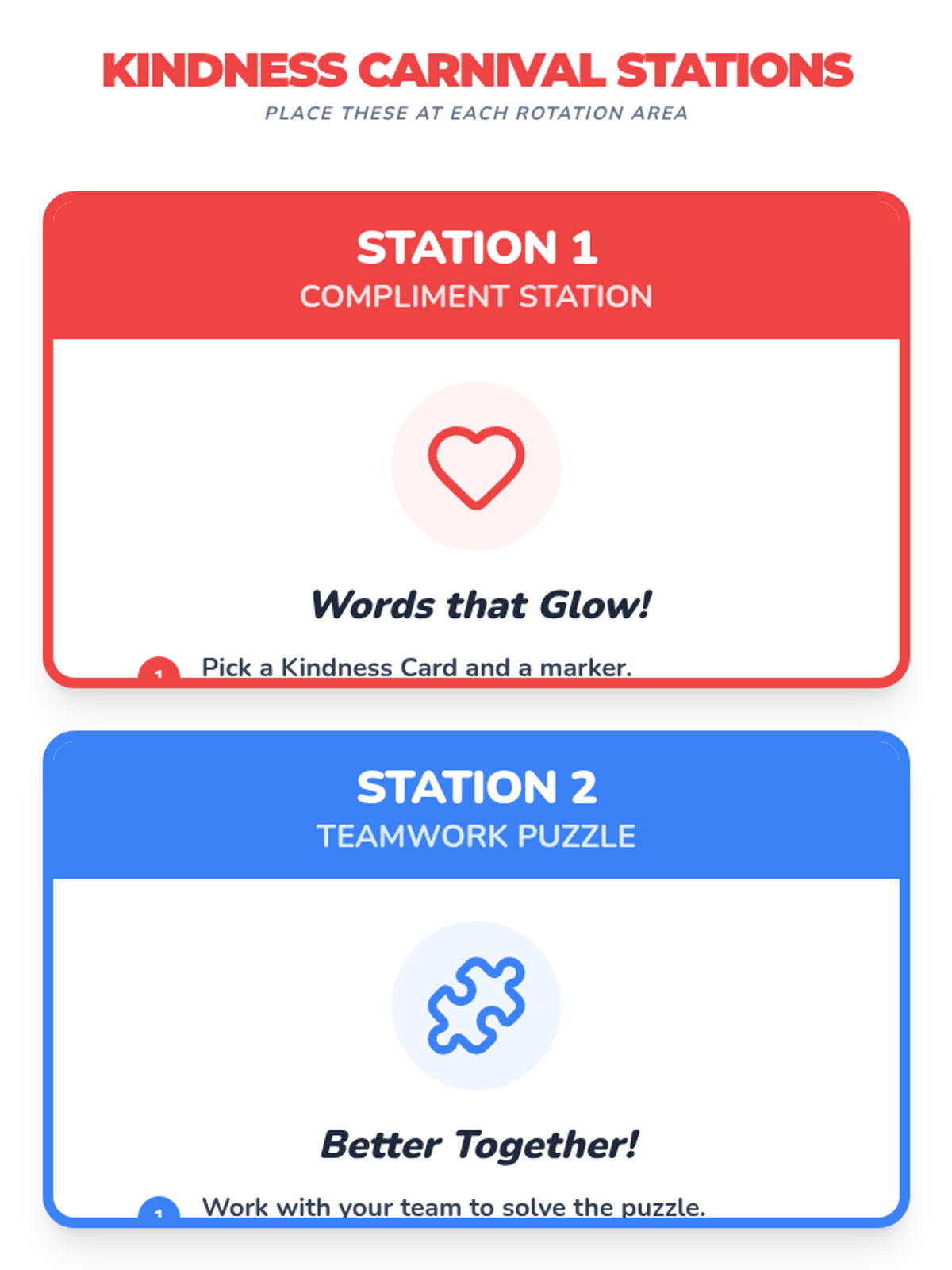 An engaging classroom activity where students rotate through stations focused on kindness and cooperation to build empathy and community.