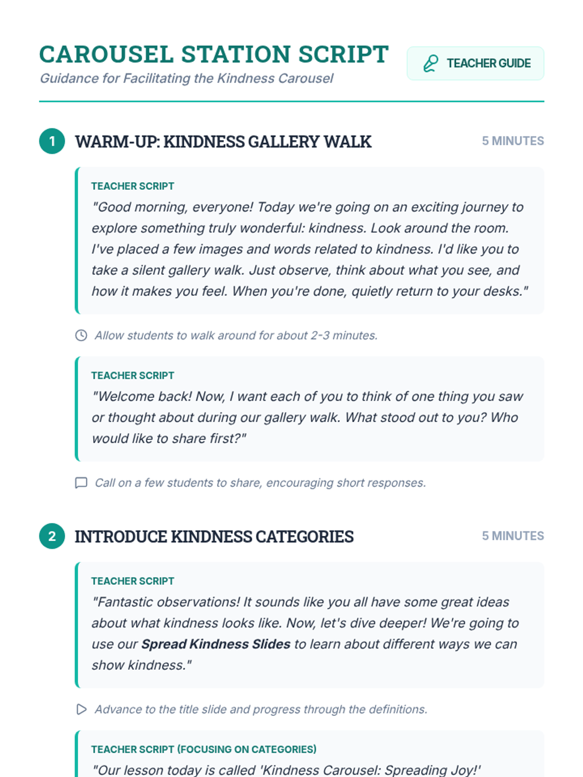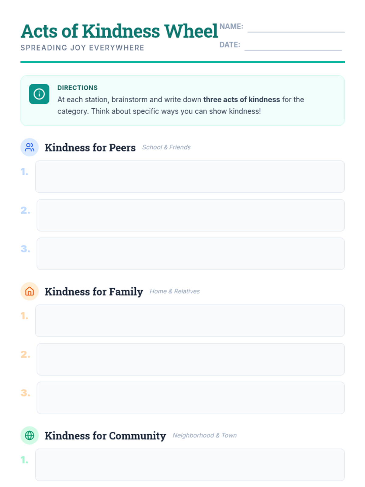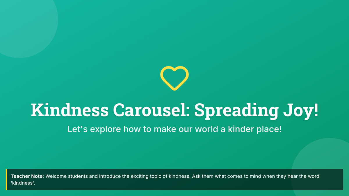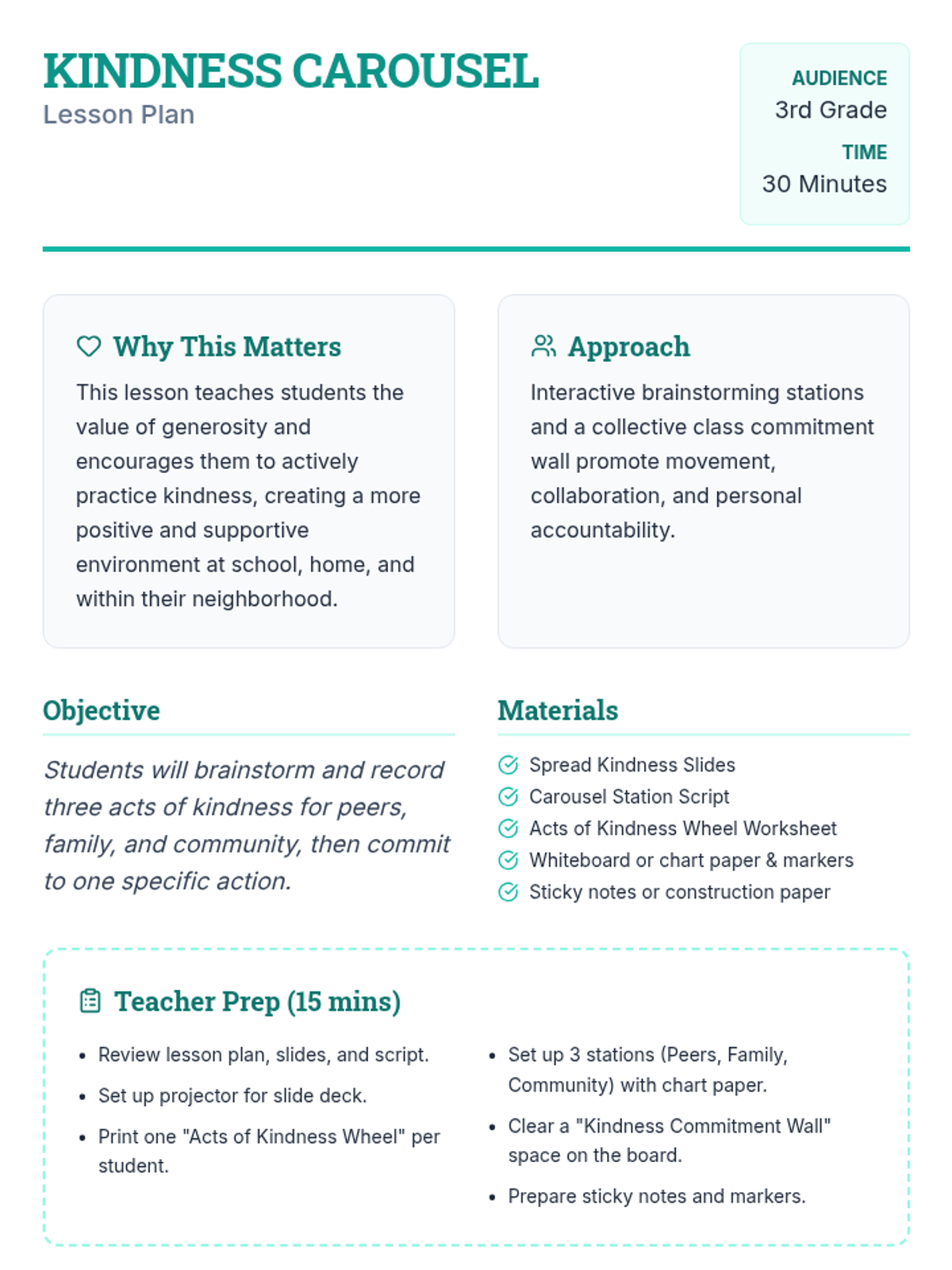A 30-minute lesson for 3rd graders where students brainstorm and commit to acts of kindness for their peers, family, and community through interactive stations.