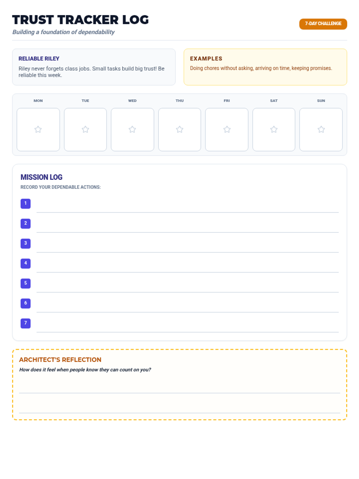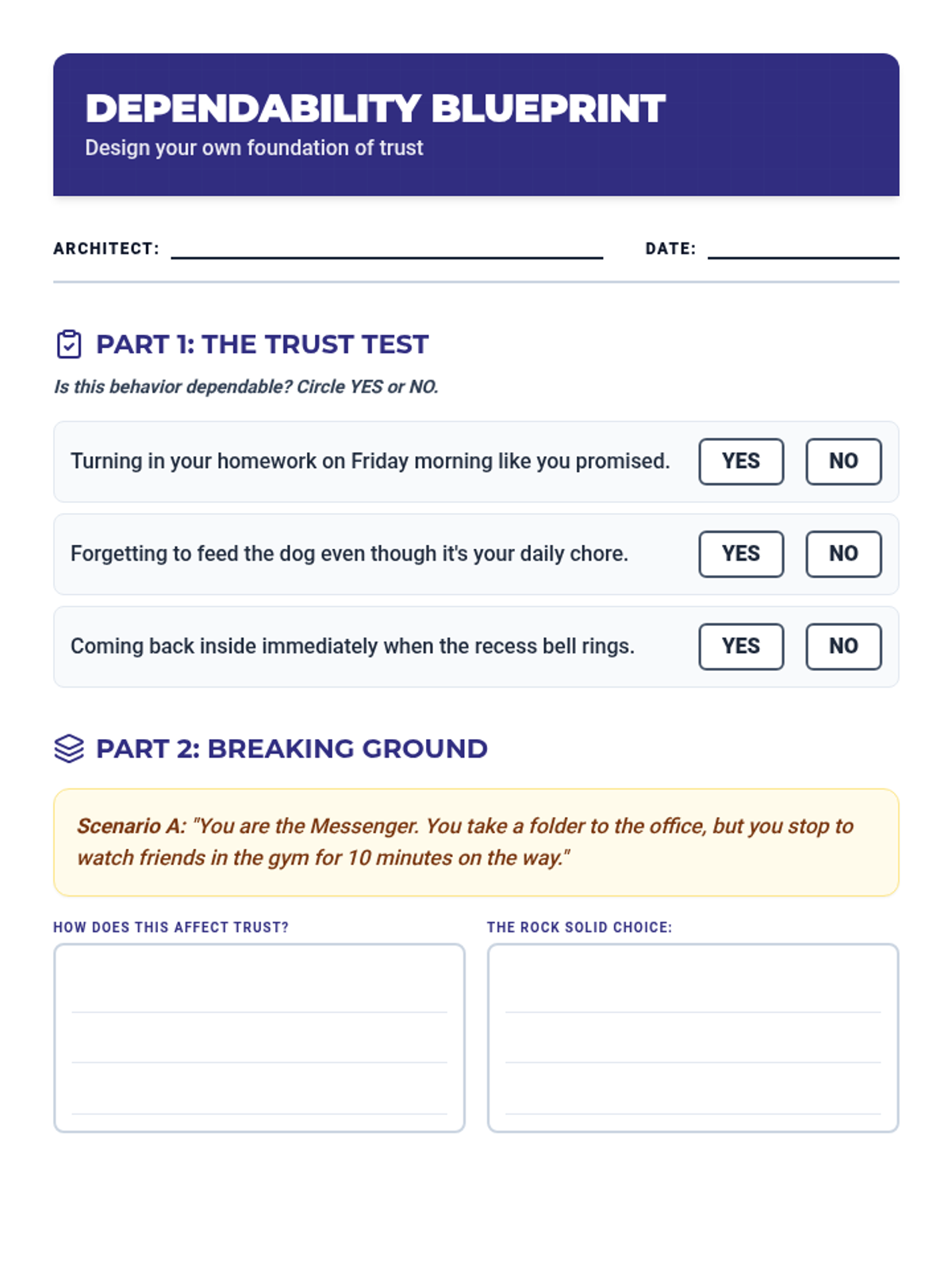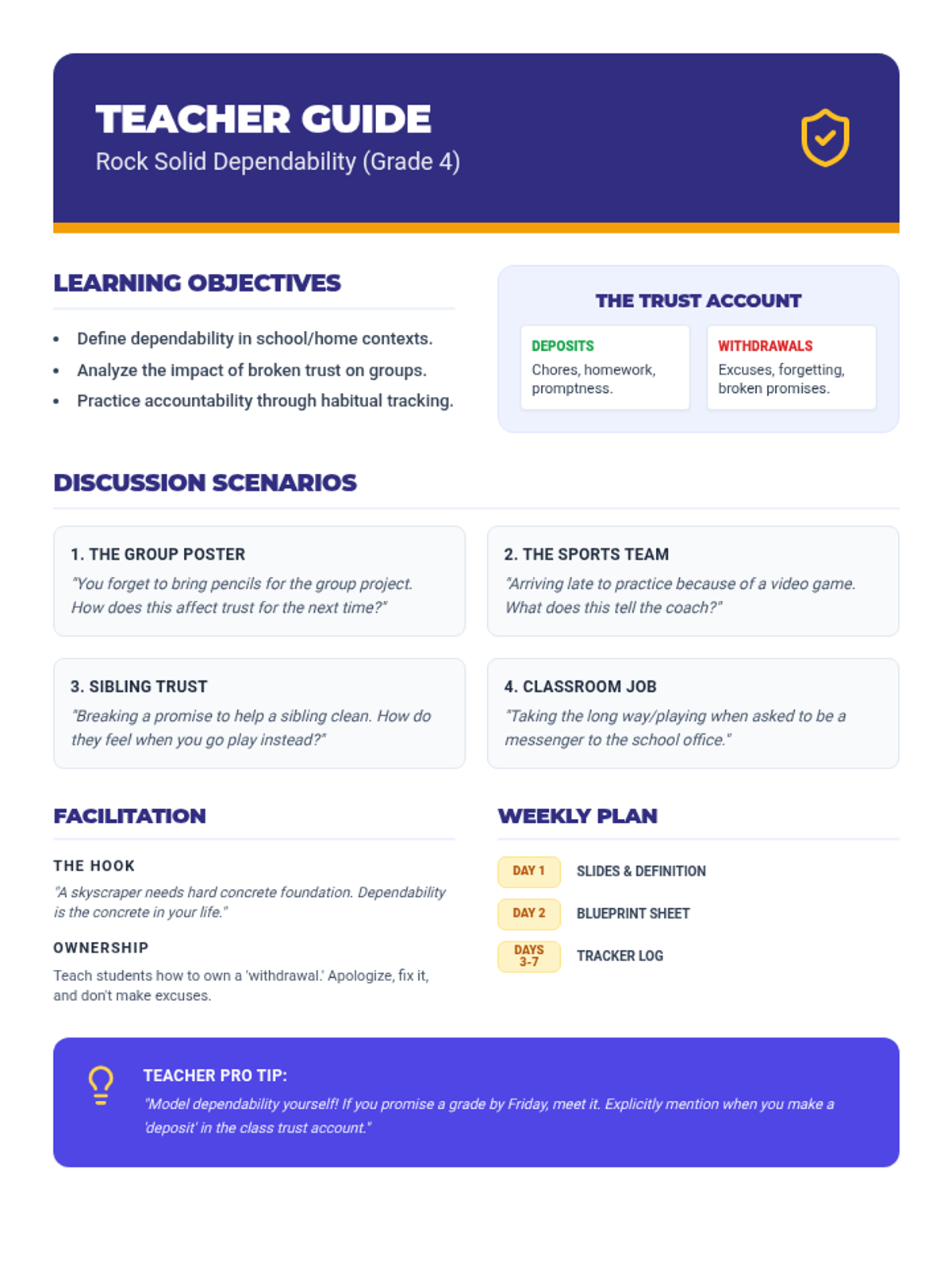 A lesson for fourth graders focused on dependability, defining it as being reliable and keeping promises to build trust with others. Students will analyze scenarios and track their own dependable actions.