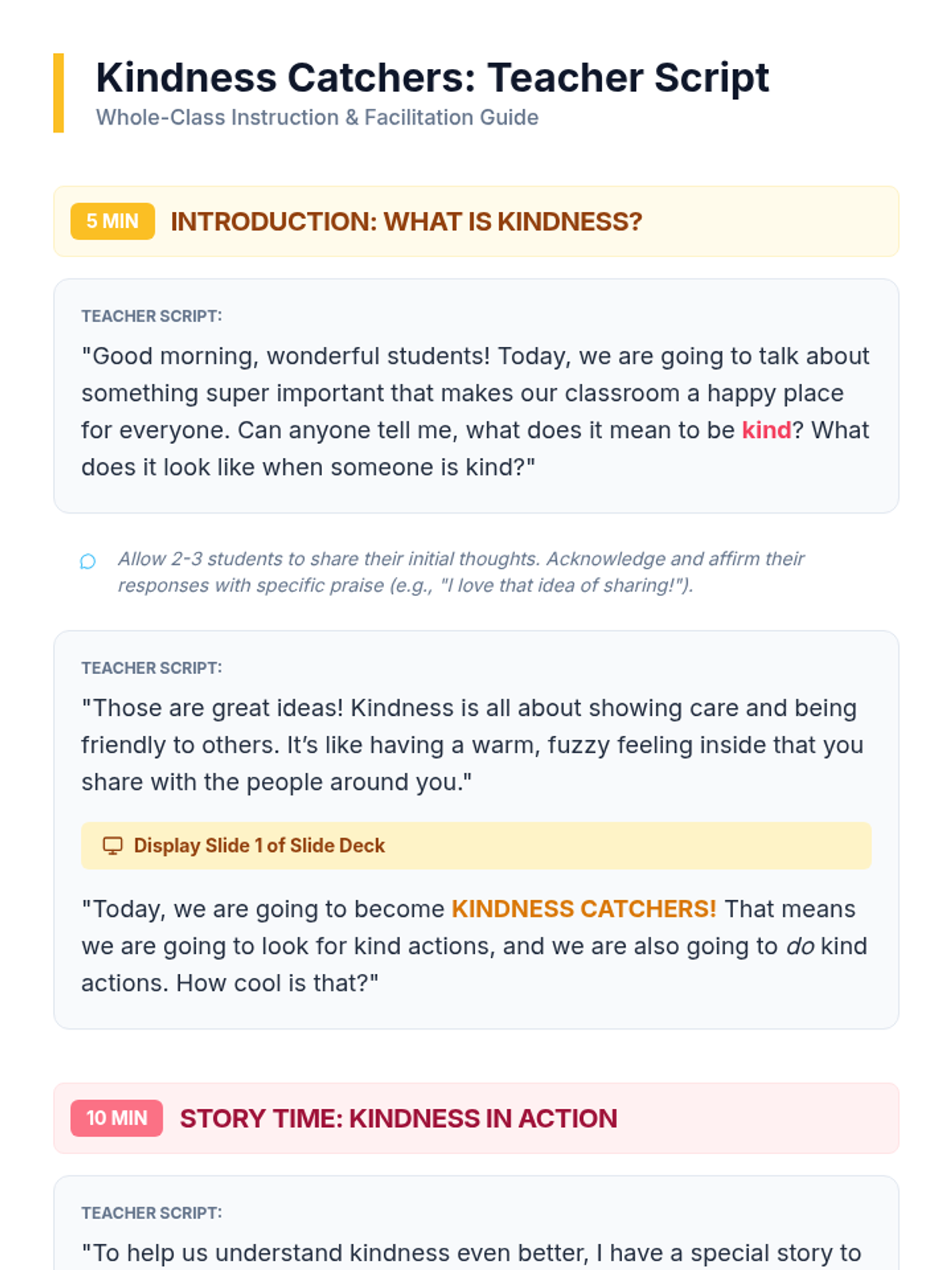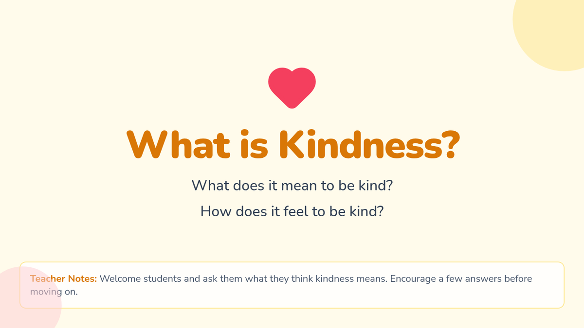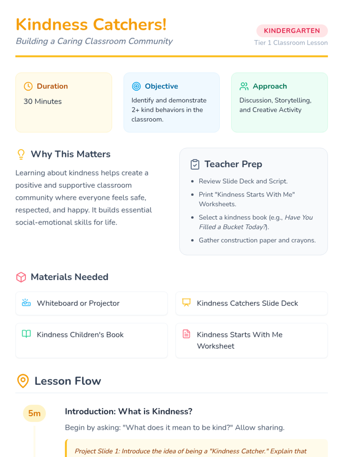 A 30-minute introductory lesson for Kindergarten students focused on identifying, practicing, and celebrating kindness in the classroom and at home.