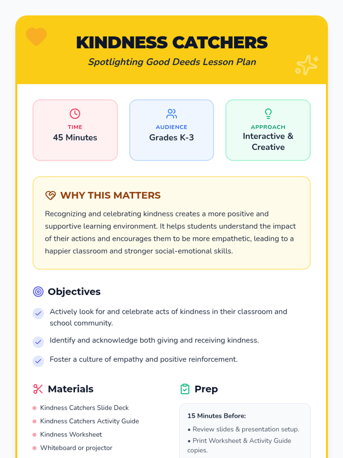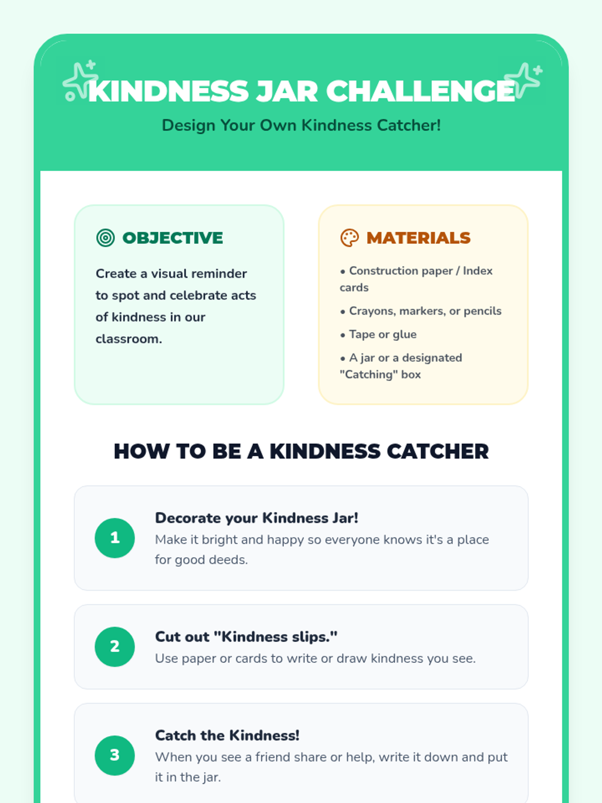 A heart-warming lesson for K-3 students focused on identifying and celebrating acts of kindness within their school community. Students learn to be 'Kindness Catchers,' creating a visual jar of good deeds and reflecting on the positive impact of empathy.
