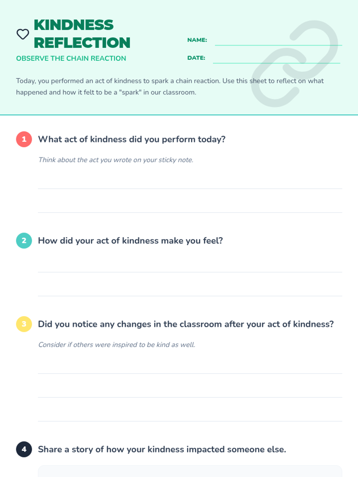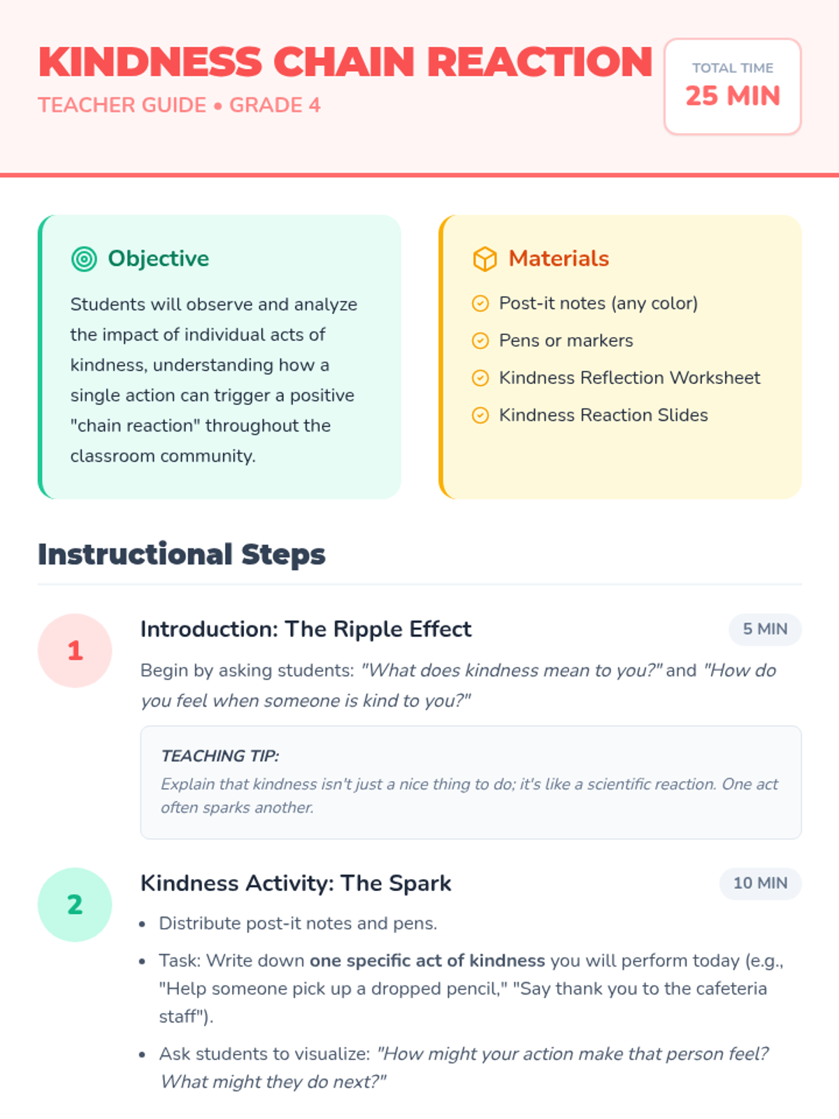 Students explore the ripple effect of kindness through a hands-on experiment and reflection, learning how individual actions contribute to a positive classroom community.