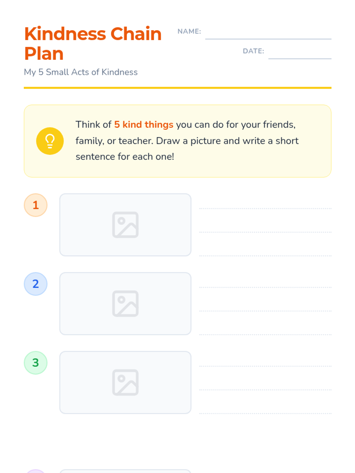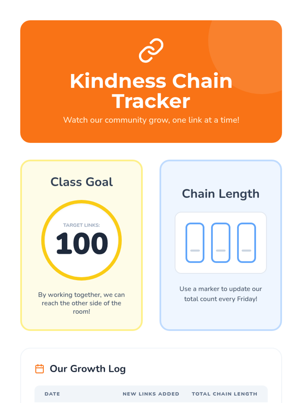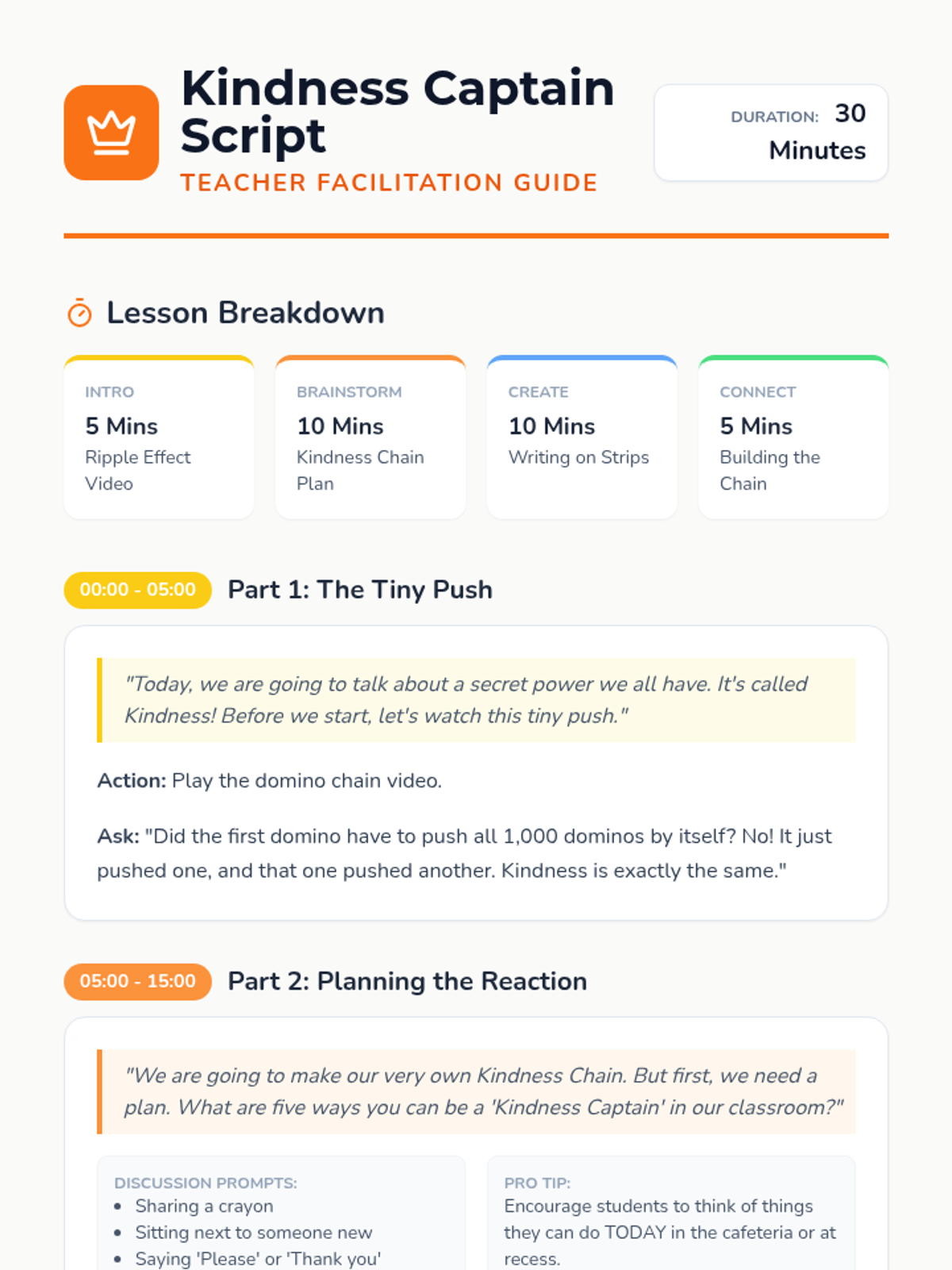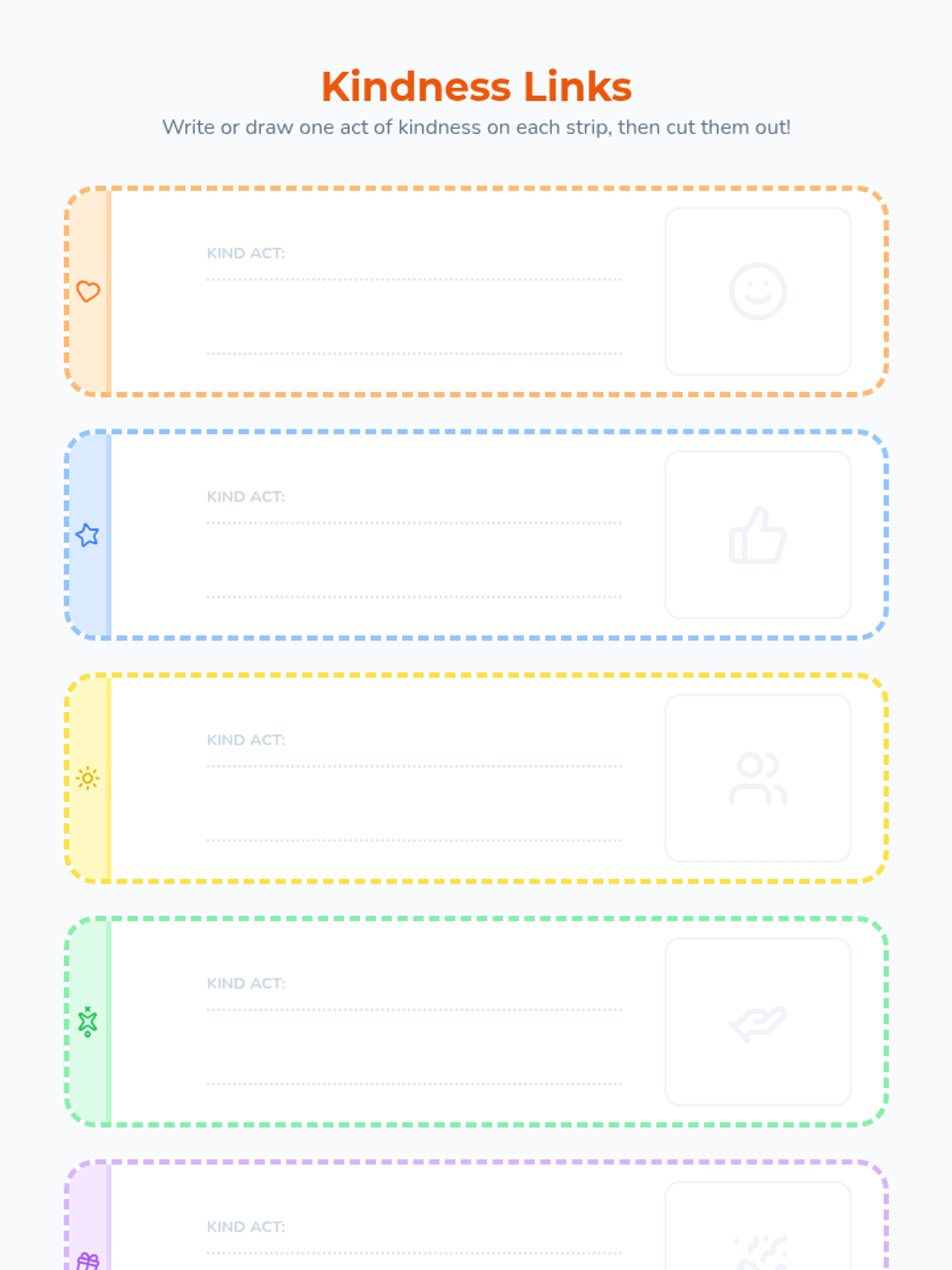 A 30-minute lesson for 1st graders to understand the ripple effect of kindness by creating a physical paper chain of kind acts. Students brainstorm, record, and link their ideas to visualize how community grows through small actions.