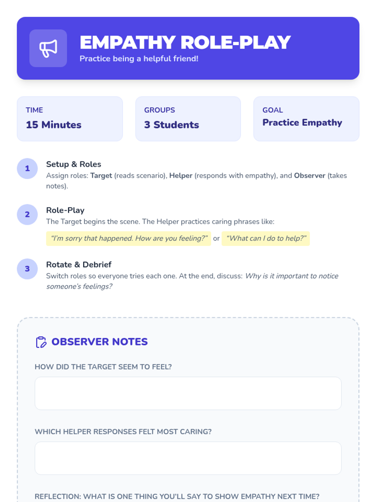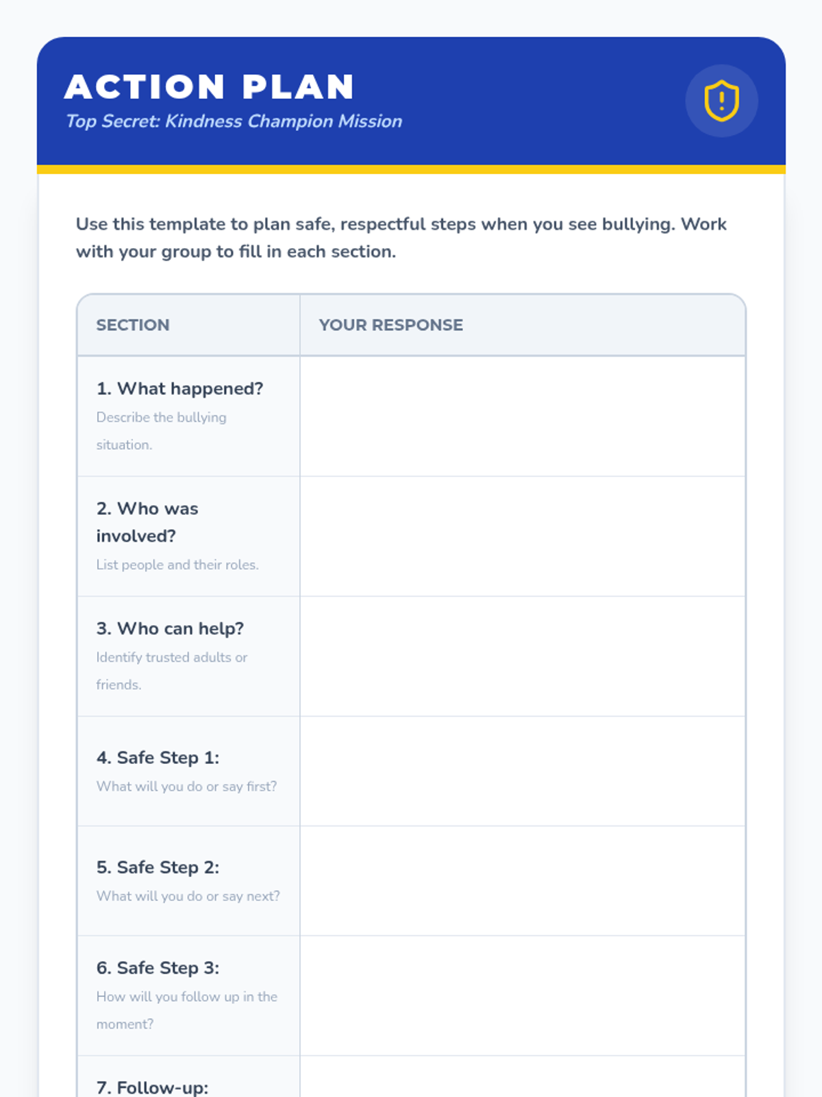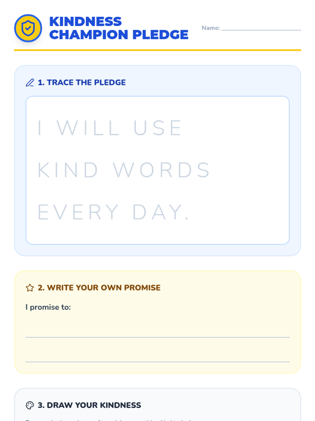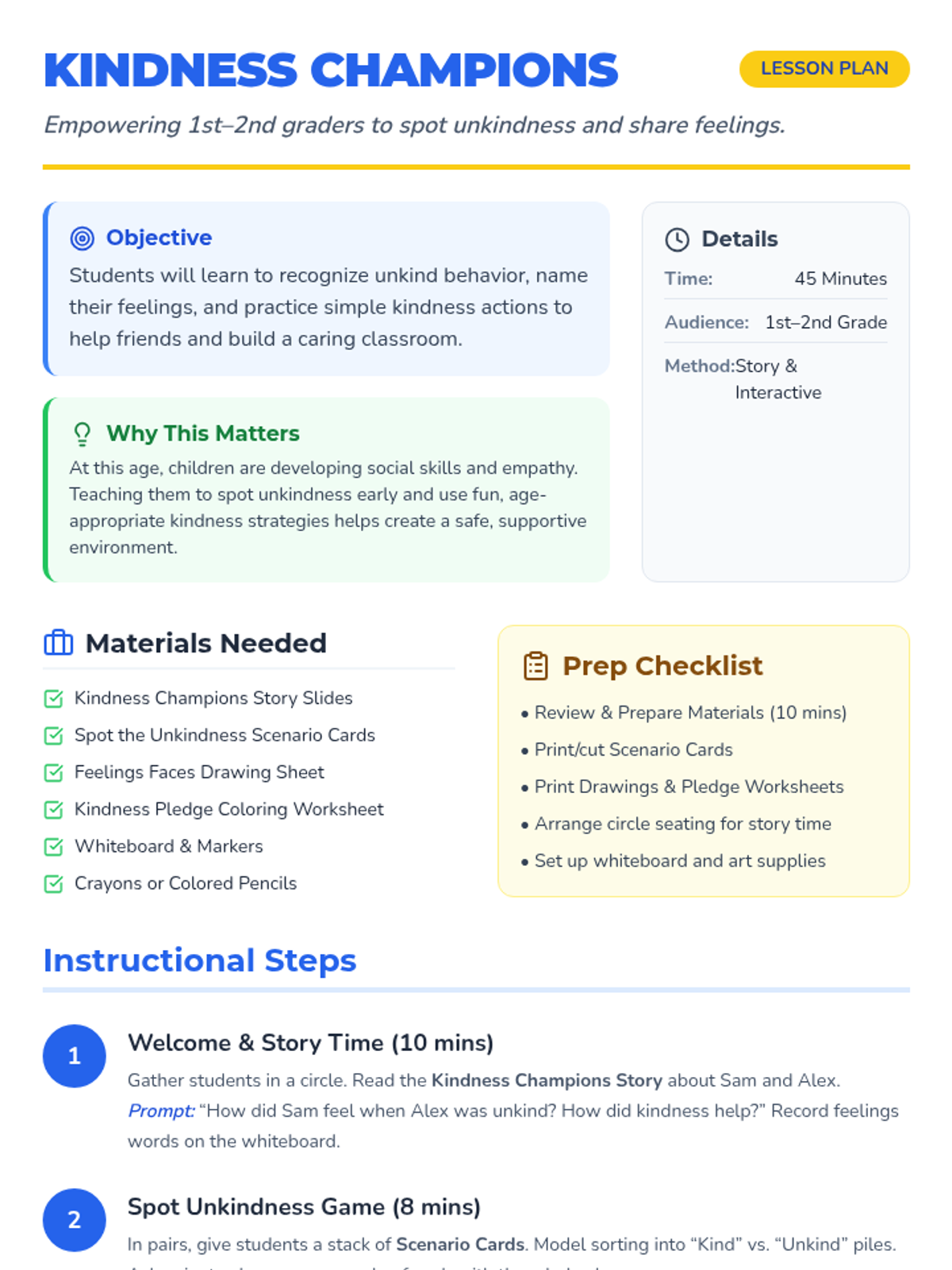 A playful 1st–2nd grade lesson focused on recognizing unkind behavior, identifying feelings, and practicing kindness through storytelling, games, and drawing. Students learn to become 'Kindness Champions' by supporting friends and building a caring classroom community.