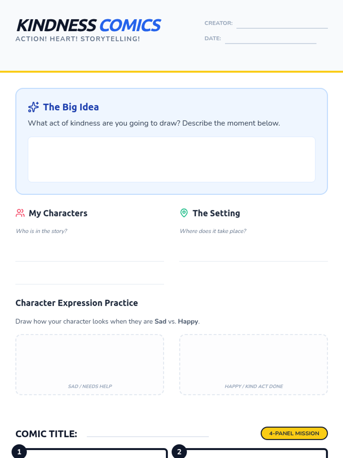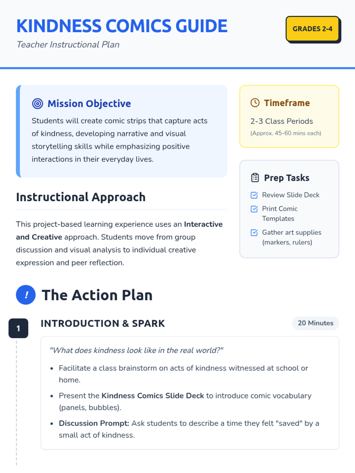 A creative lesson where students in Grades 2-4 design comic strips to illustrate acts of kindness, combining narrative skills with character education.