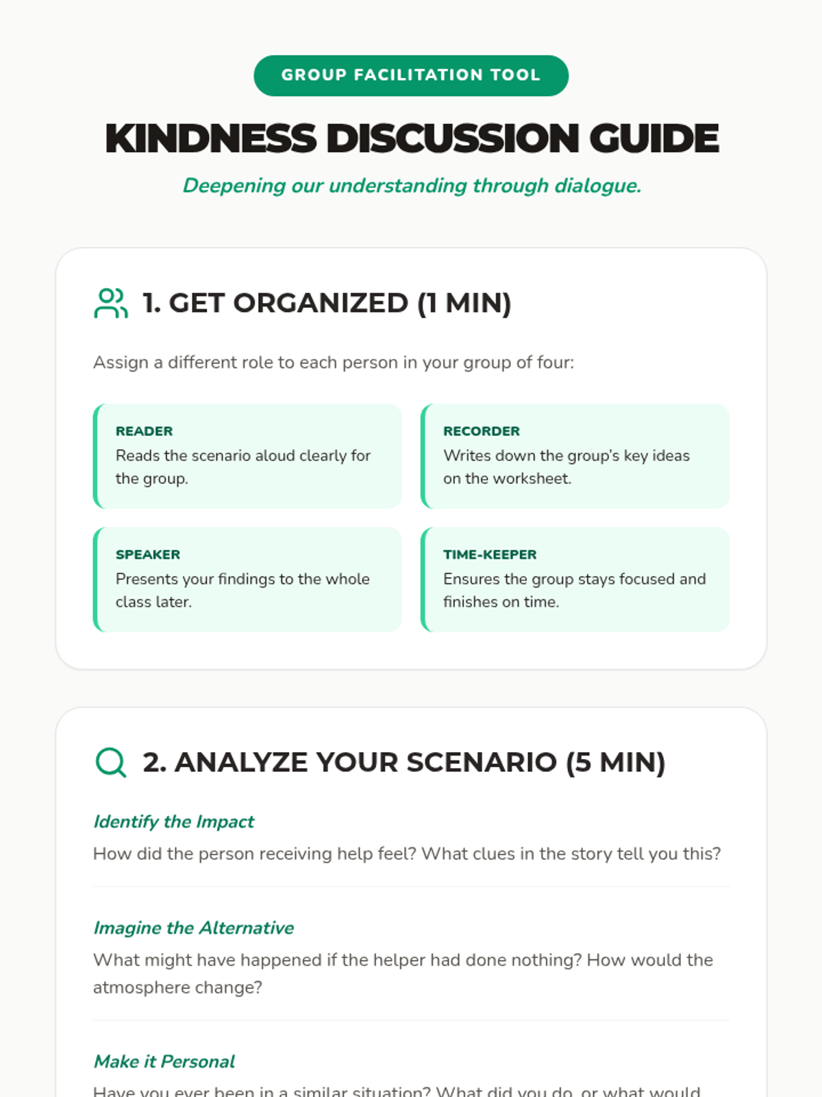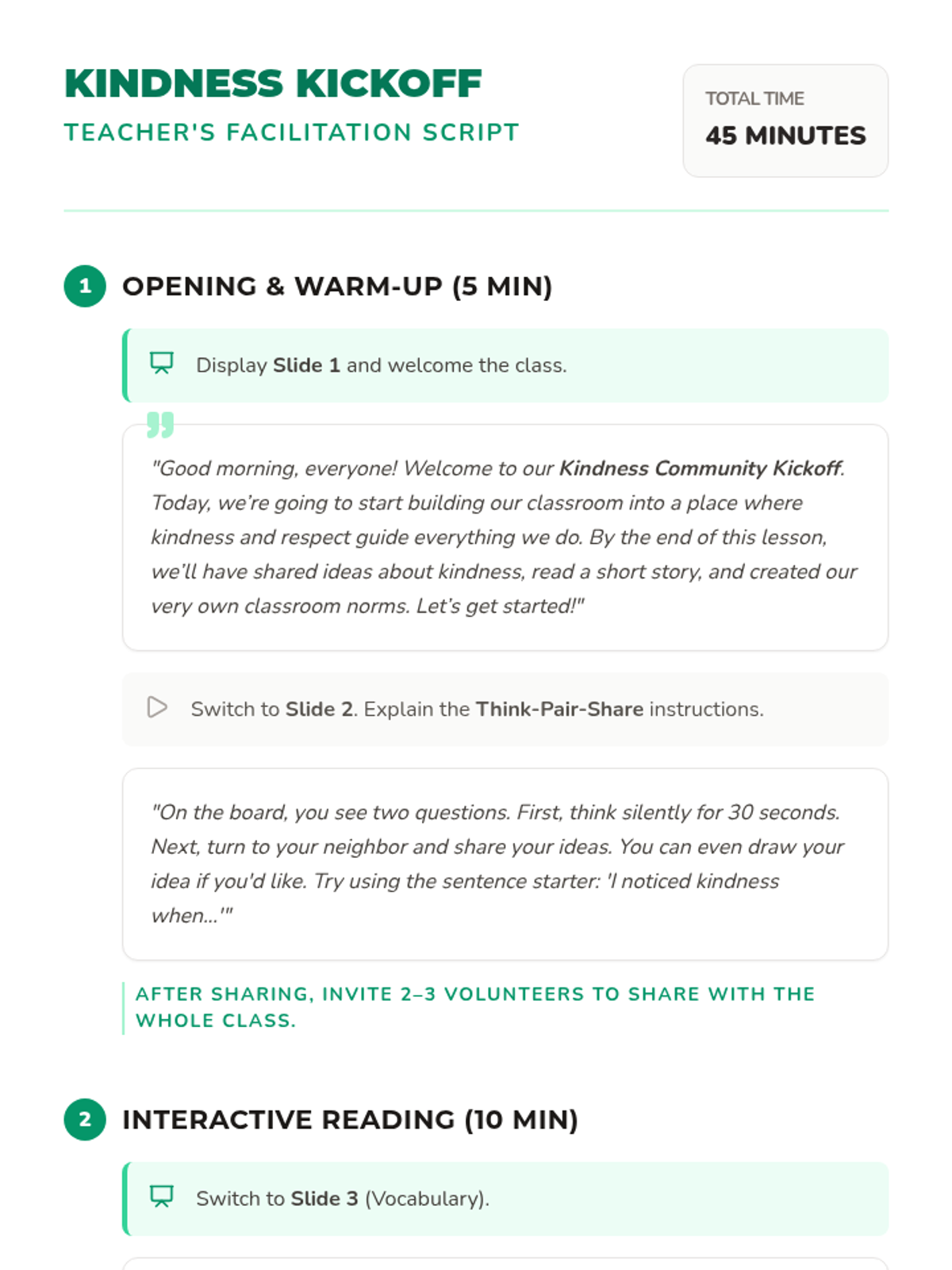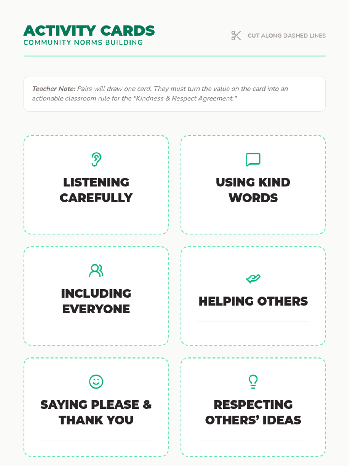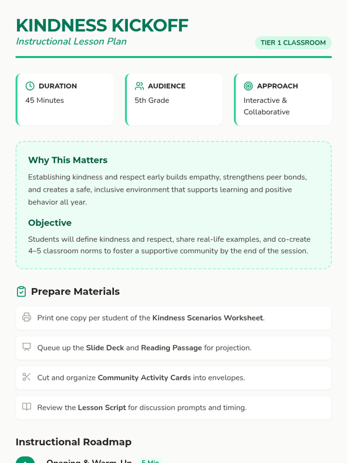 A 45-minute kickoff lesson for 5th graders to establish a culture of kindness and respect through interactive reading, group discussions, and collaborative norm-setting. Students will define key values and co-create a classroom agreement for a positive learning environment.