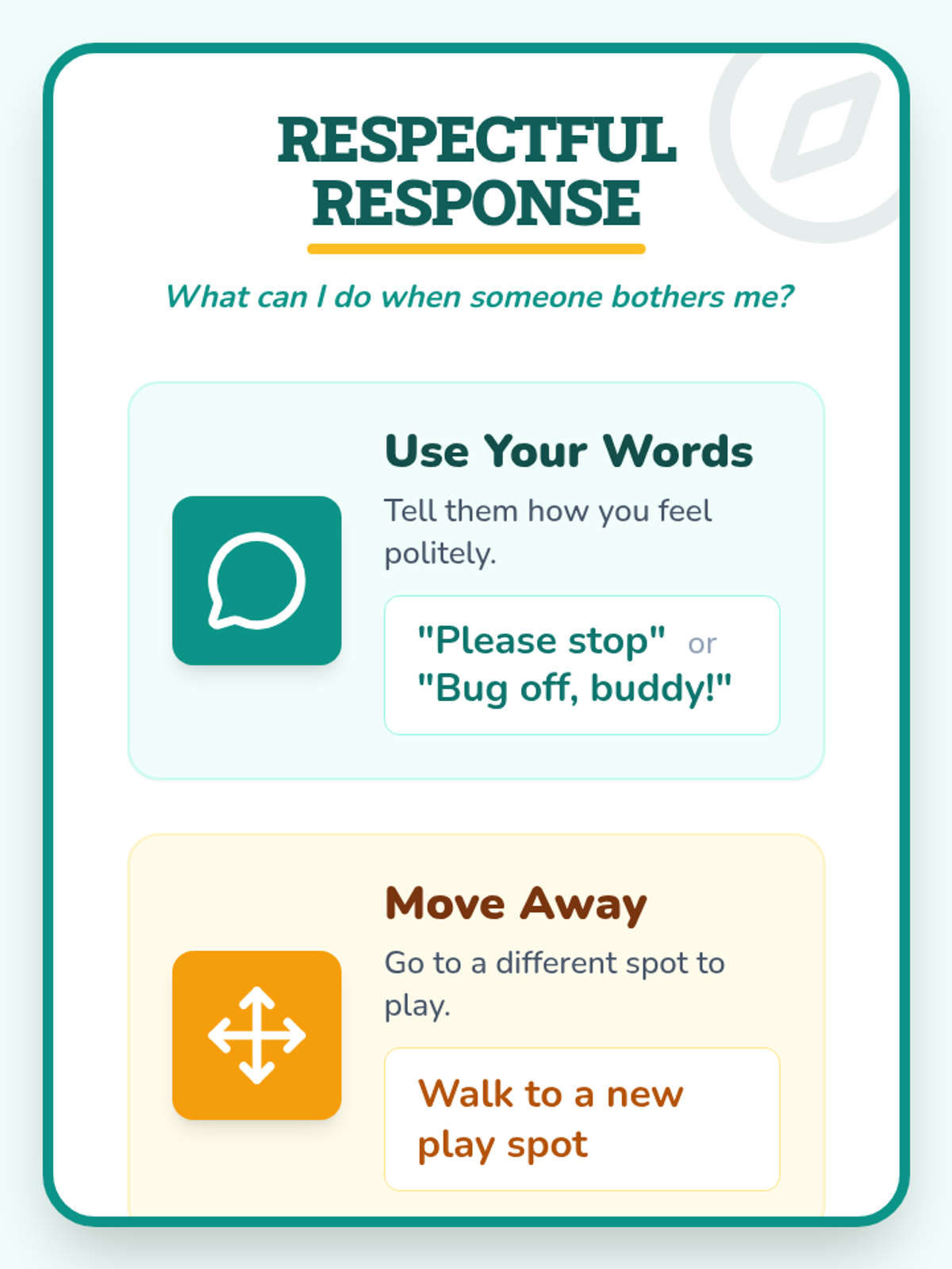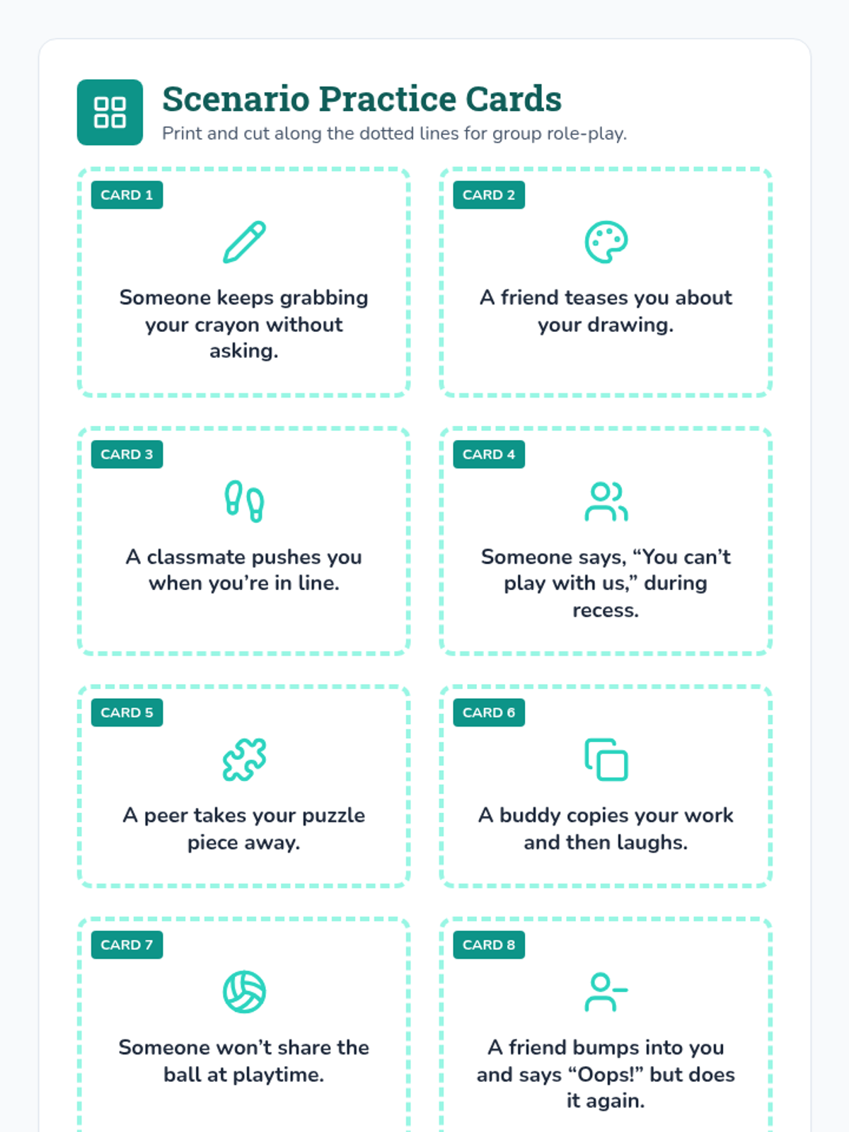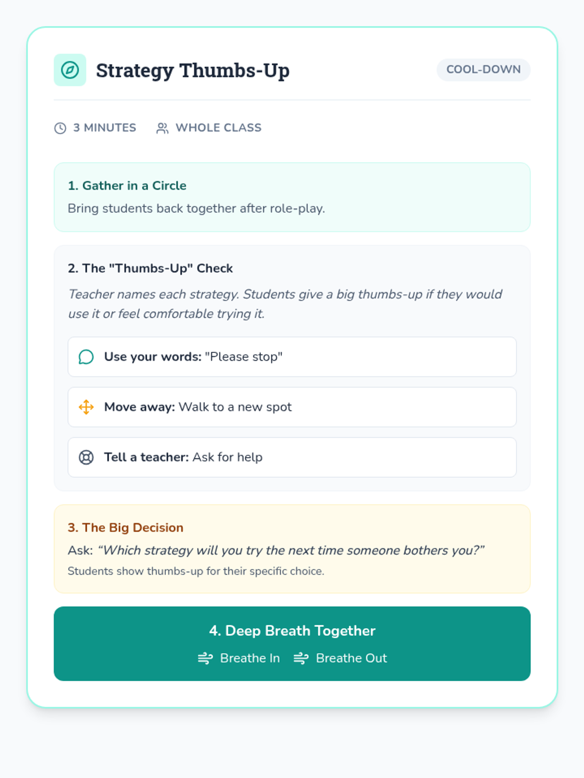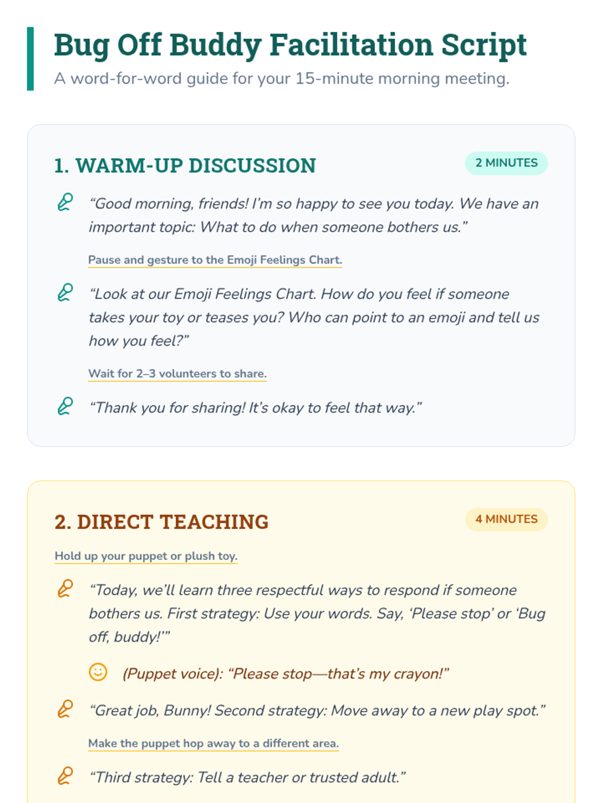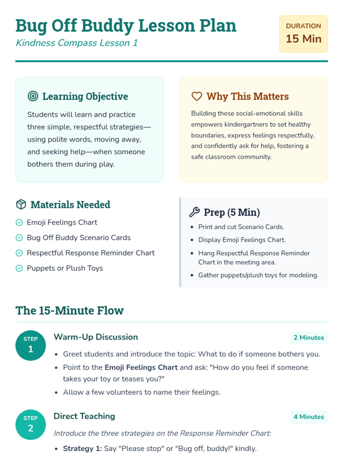 A 15-minute morning meeting lesson for kindergarteners focused on handling small conflicts using respectful strategies like using words, moving away, or seeking adult help.