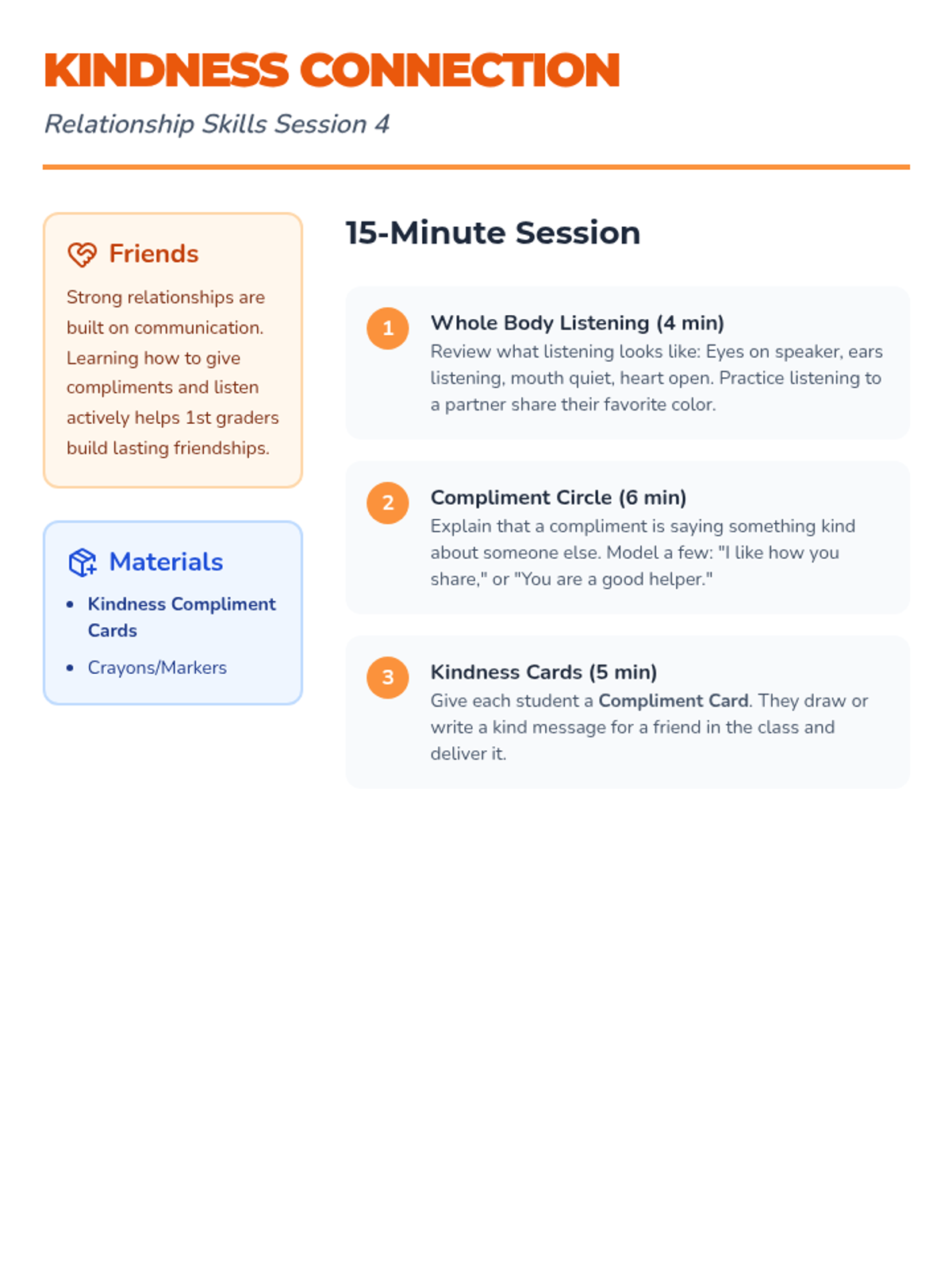 Students practice building positive relationships through kind communication, active listening, and sharing appreciation.