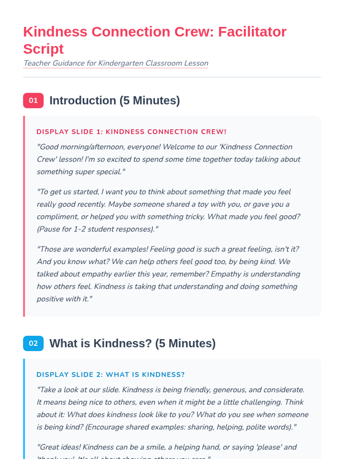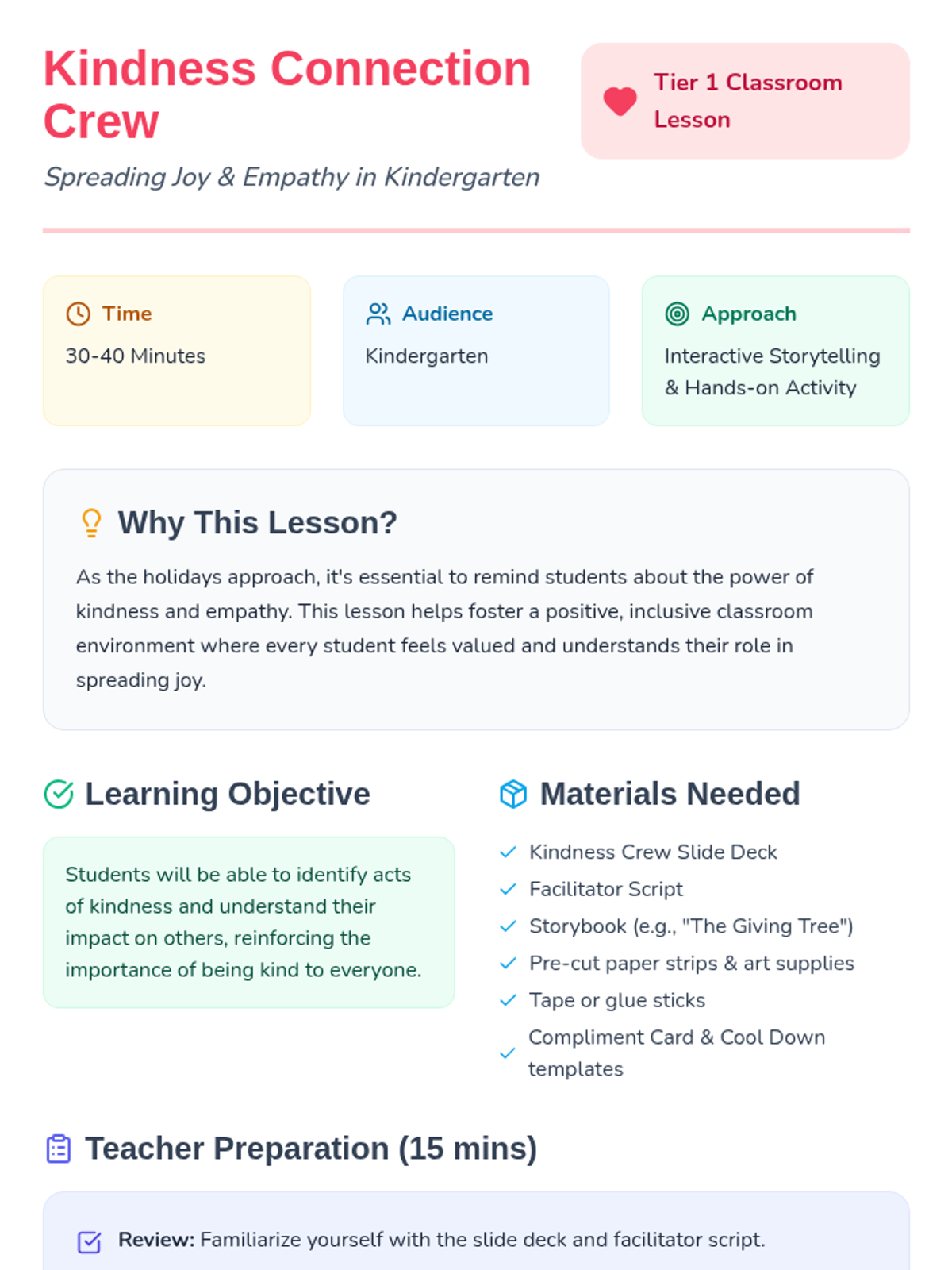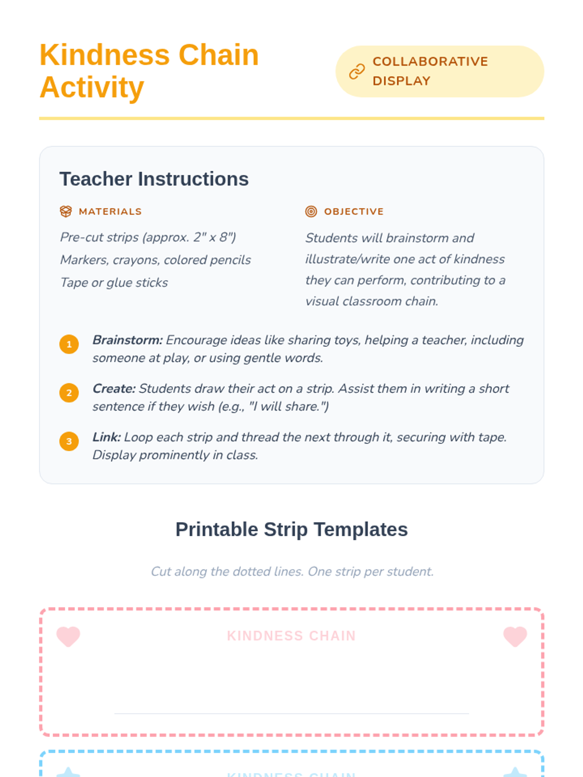 A heartwarming Kindergarten lesson focused on empathy and kindness, featuring interactive storytelling, a collaborative Kindness Chain activity, and optional compliment card creation.