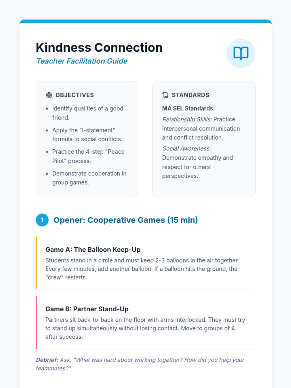 An elementary SEL lesson focused on building strong friendship skills and mastering peaceful conflict resolution through 'I-statements' and cooperative play. Aligned with Massachusetts SEL Standards for Relationship Skills and Social Awareness.