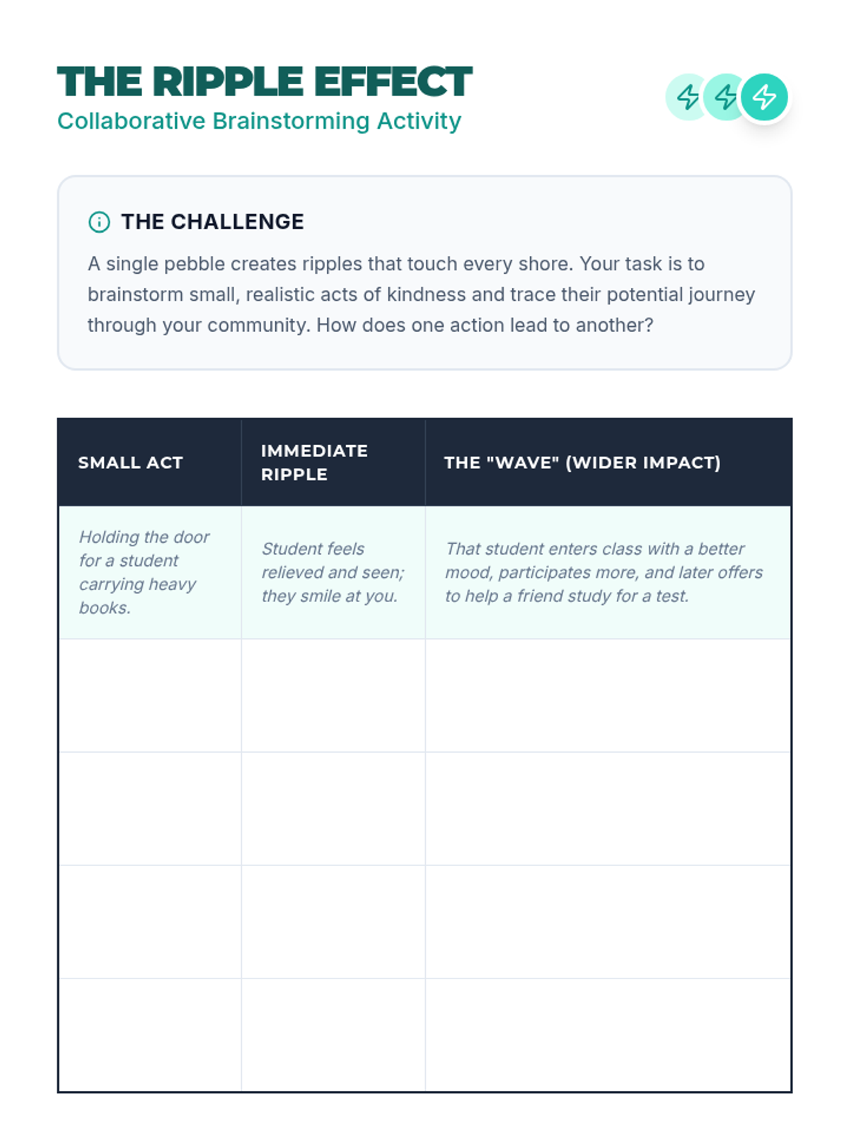 Practical team-based synergy challenges to apply collaborative problem-solving skills.
