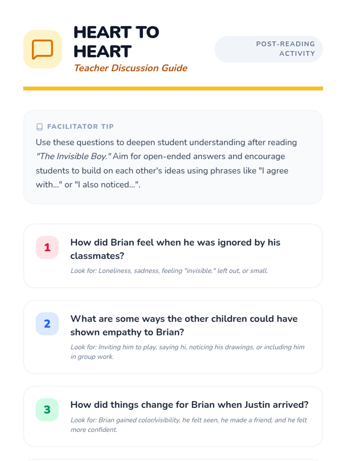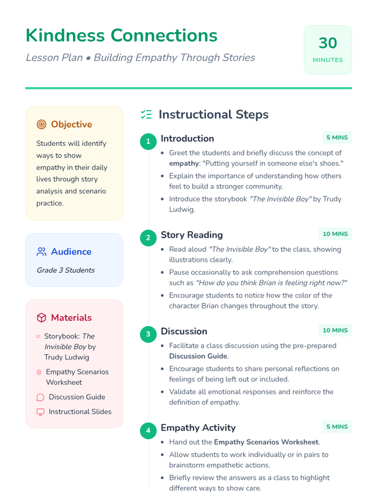 Students will listen to a story that highlights empathy, participate in a discussion, and identify ways to show empathy in their daily lives using the book 'The Invisible Boy'.