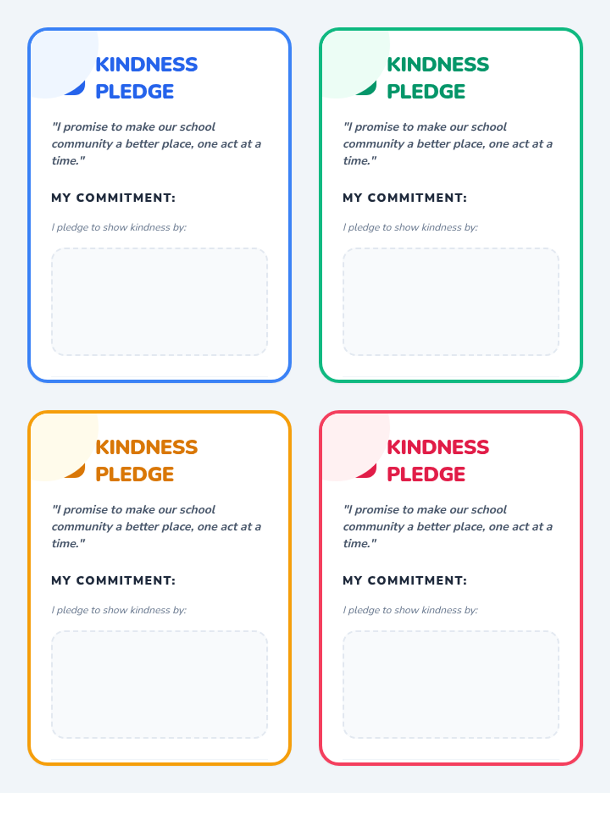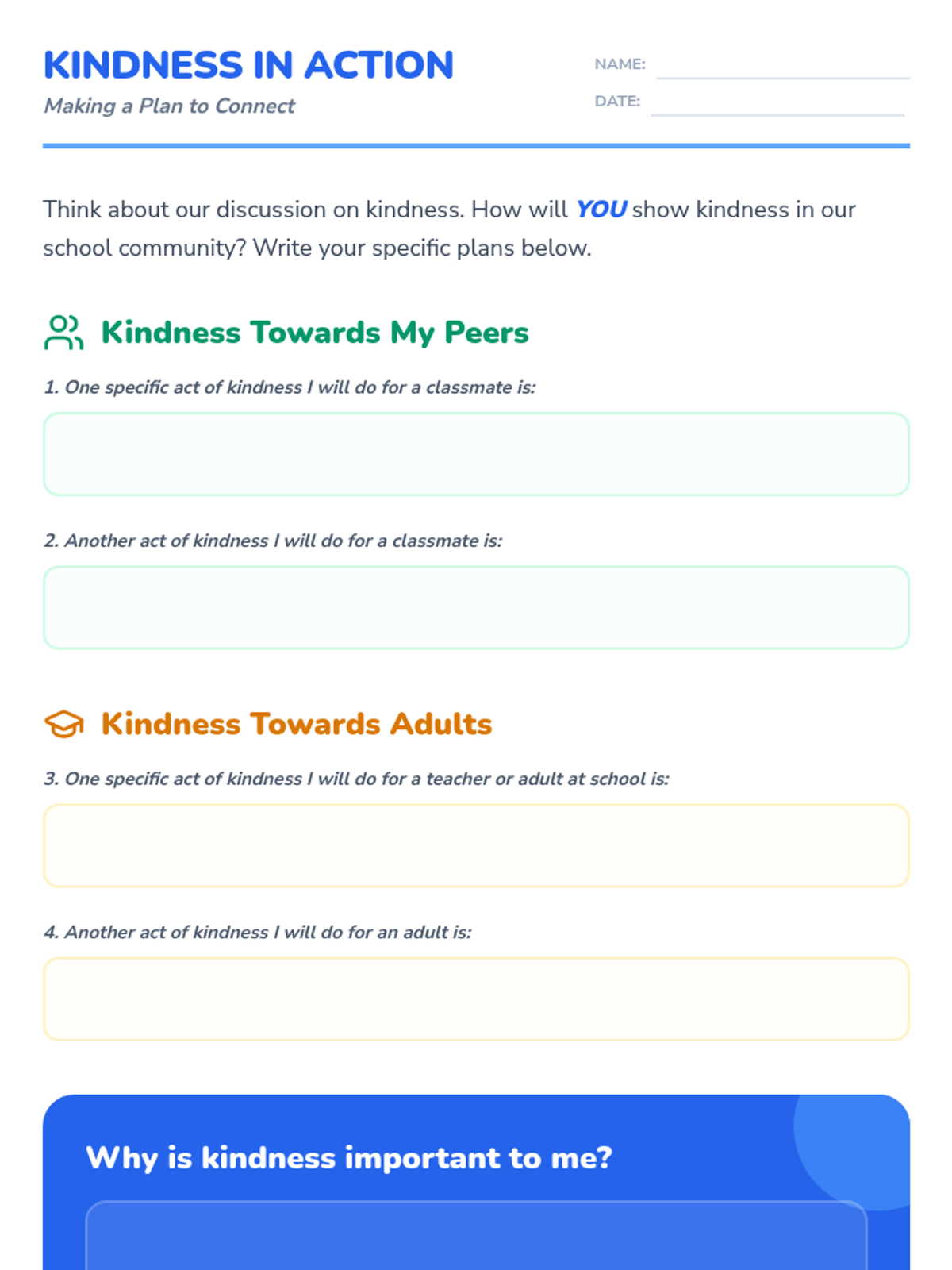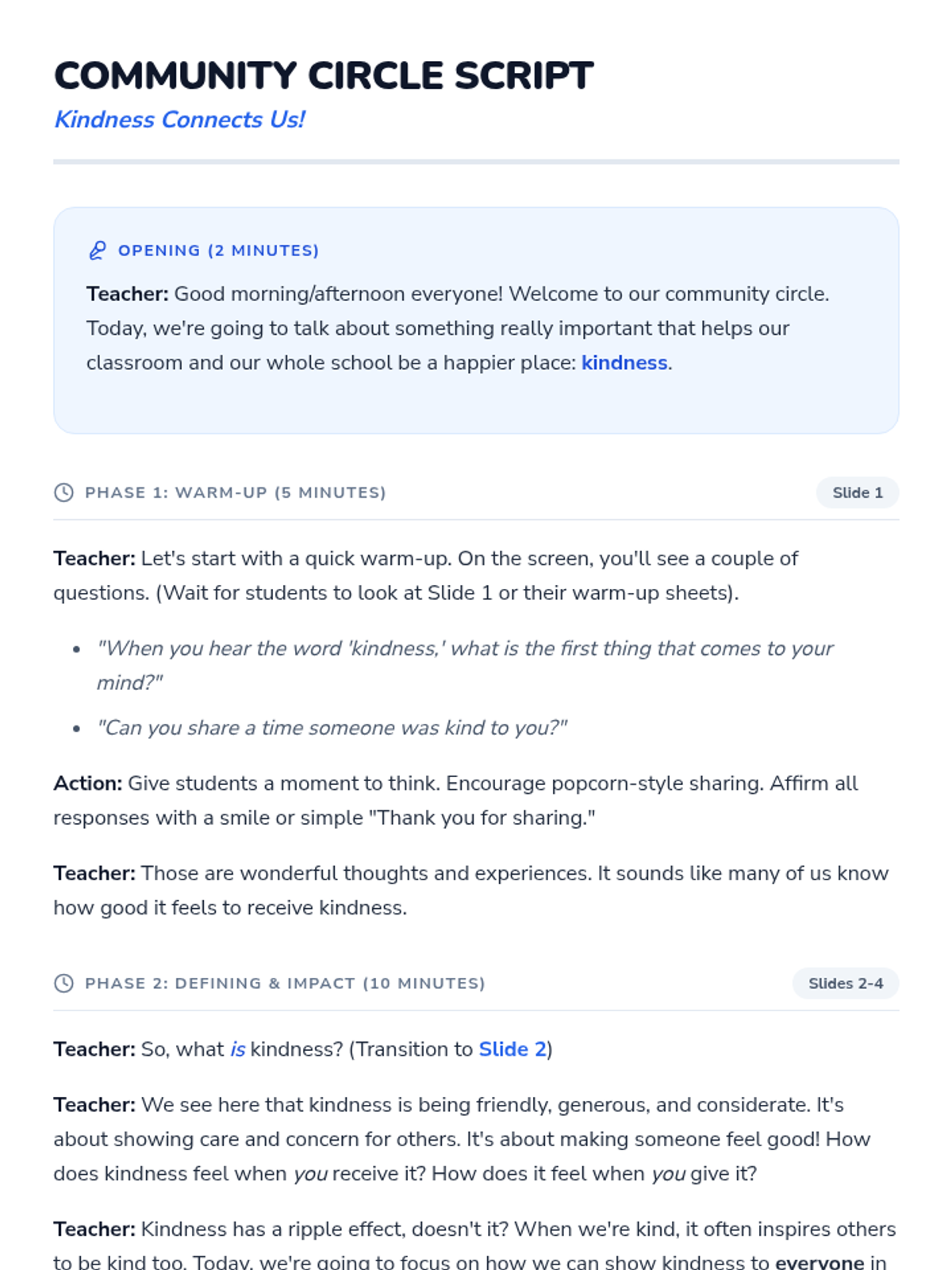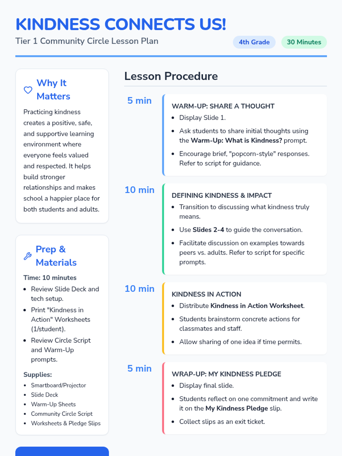 A 30-minute community circle lesson for 4th graders focused on defining kindness, identifying kind acts towards peers and adults, and making personal kindness pledges to improve the classroom climate.