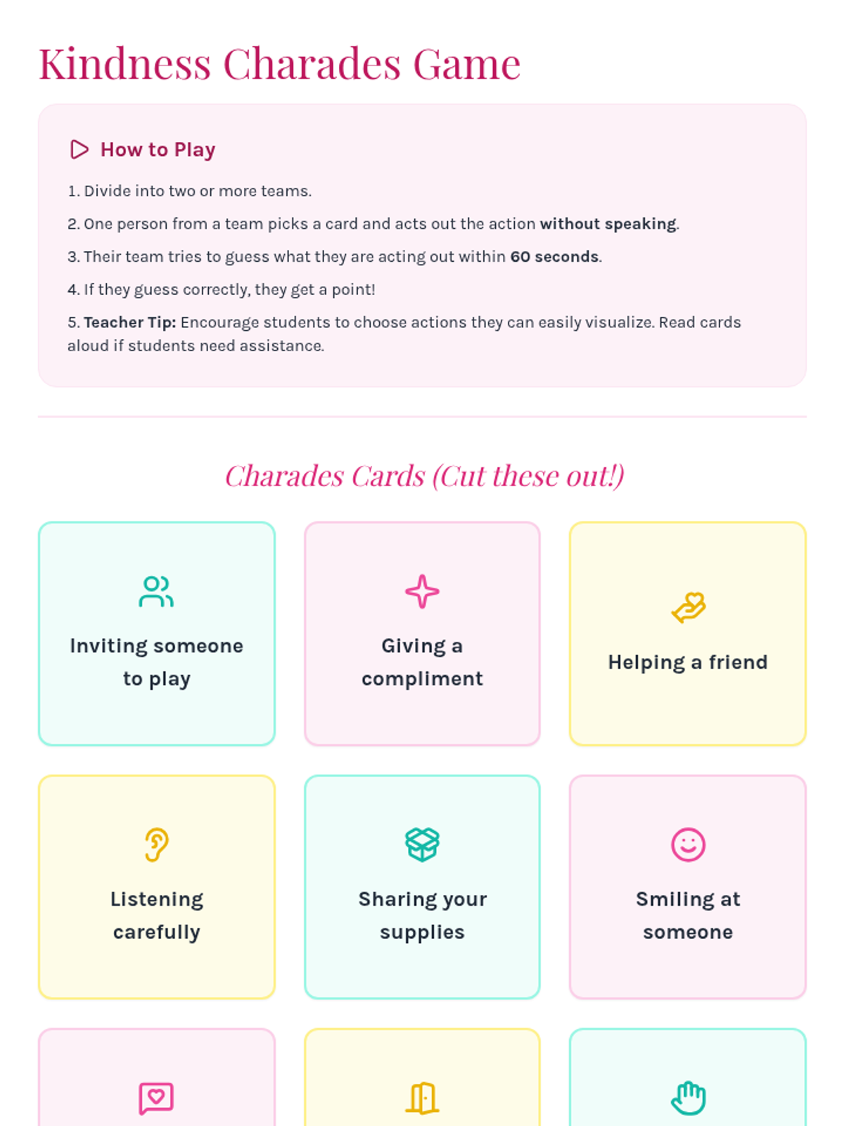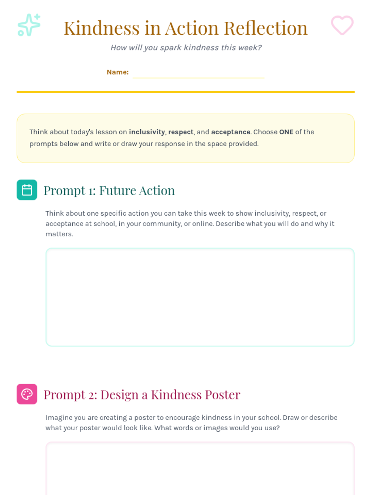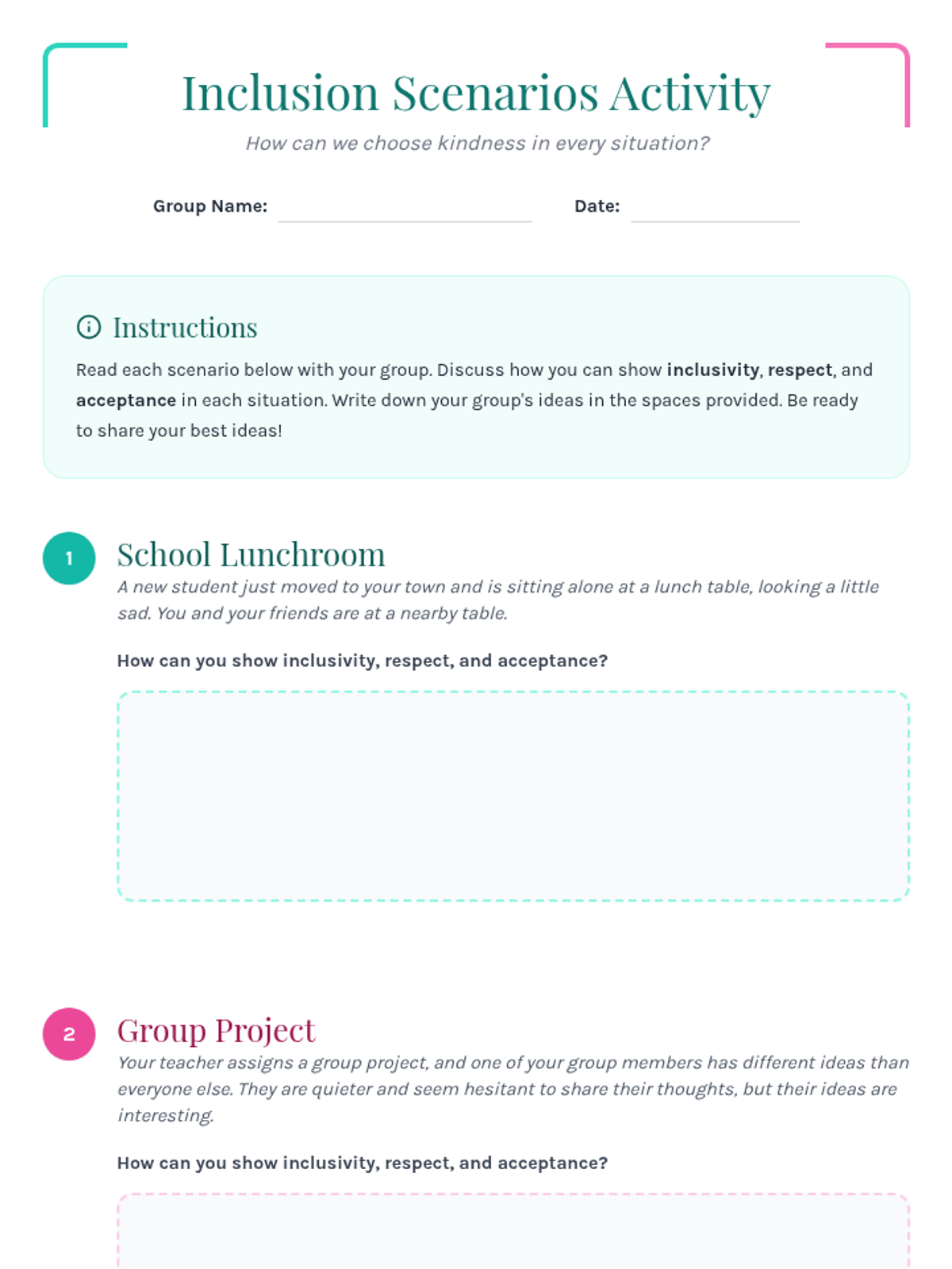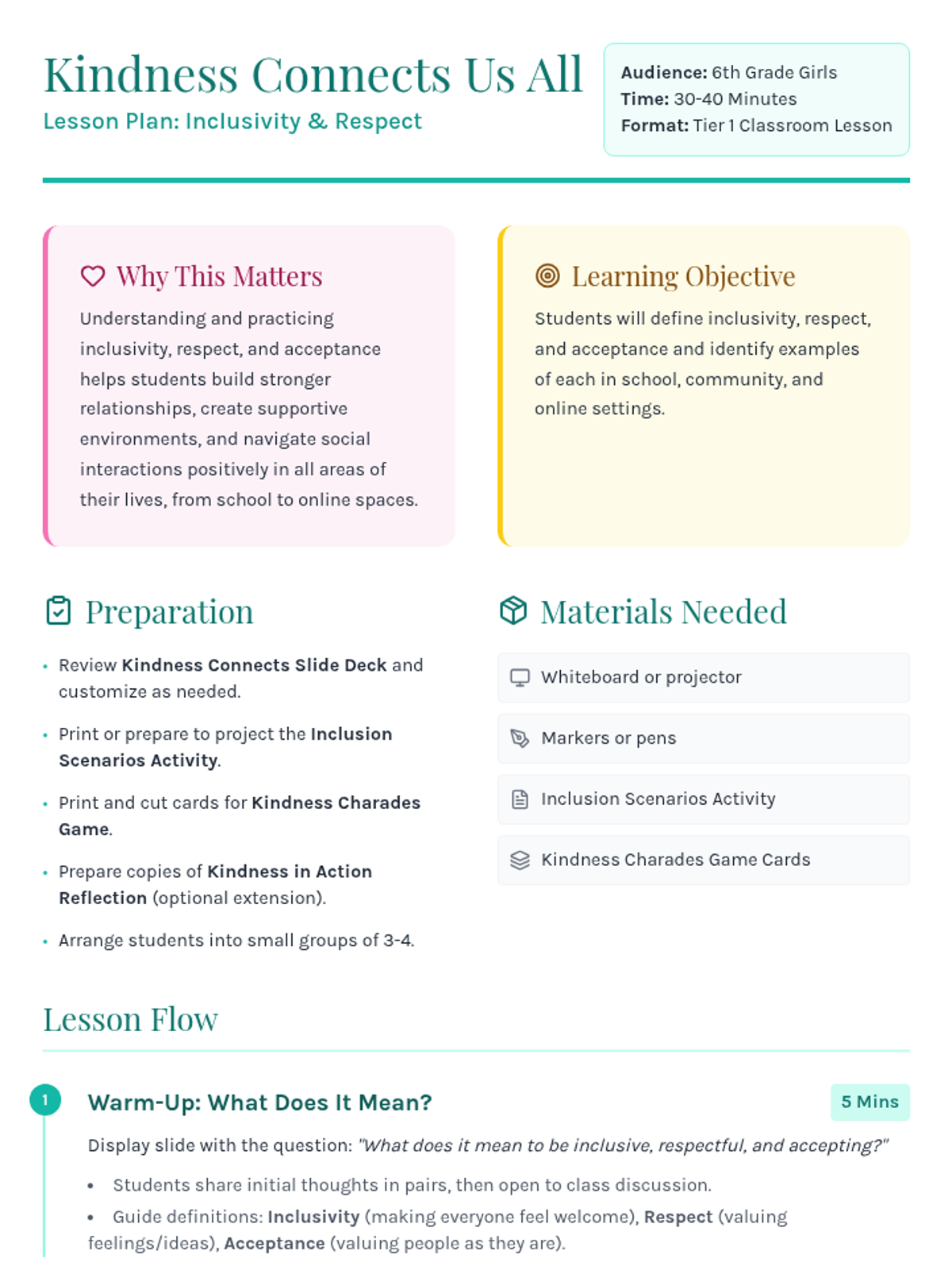 A 30-minute lesson for 6th-grade girls exploring inclusivity, respect, and acceptance across school, community, and online contexts through discussion and interactive games.