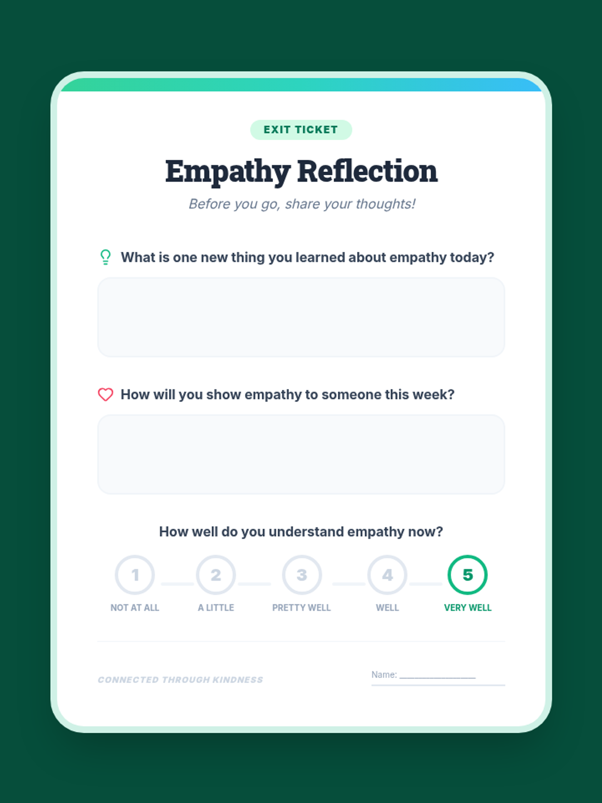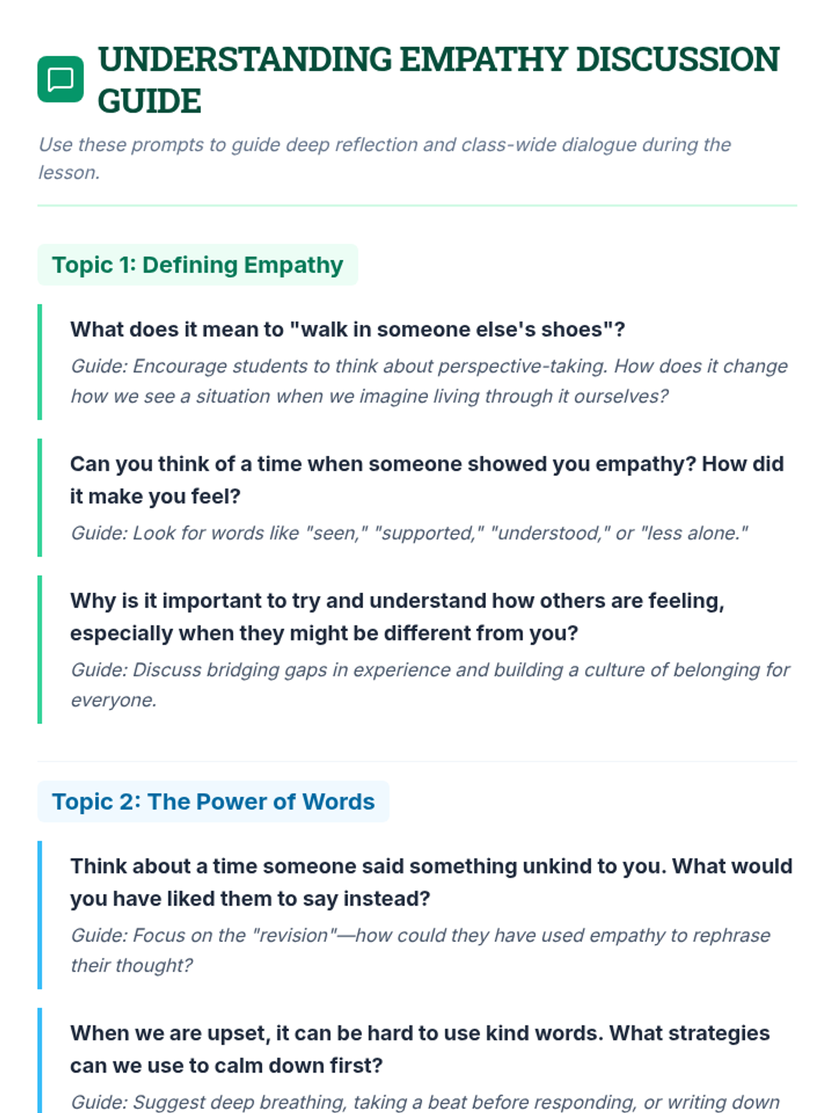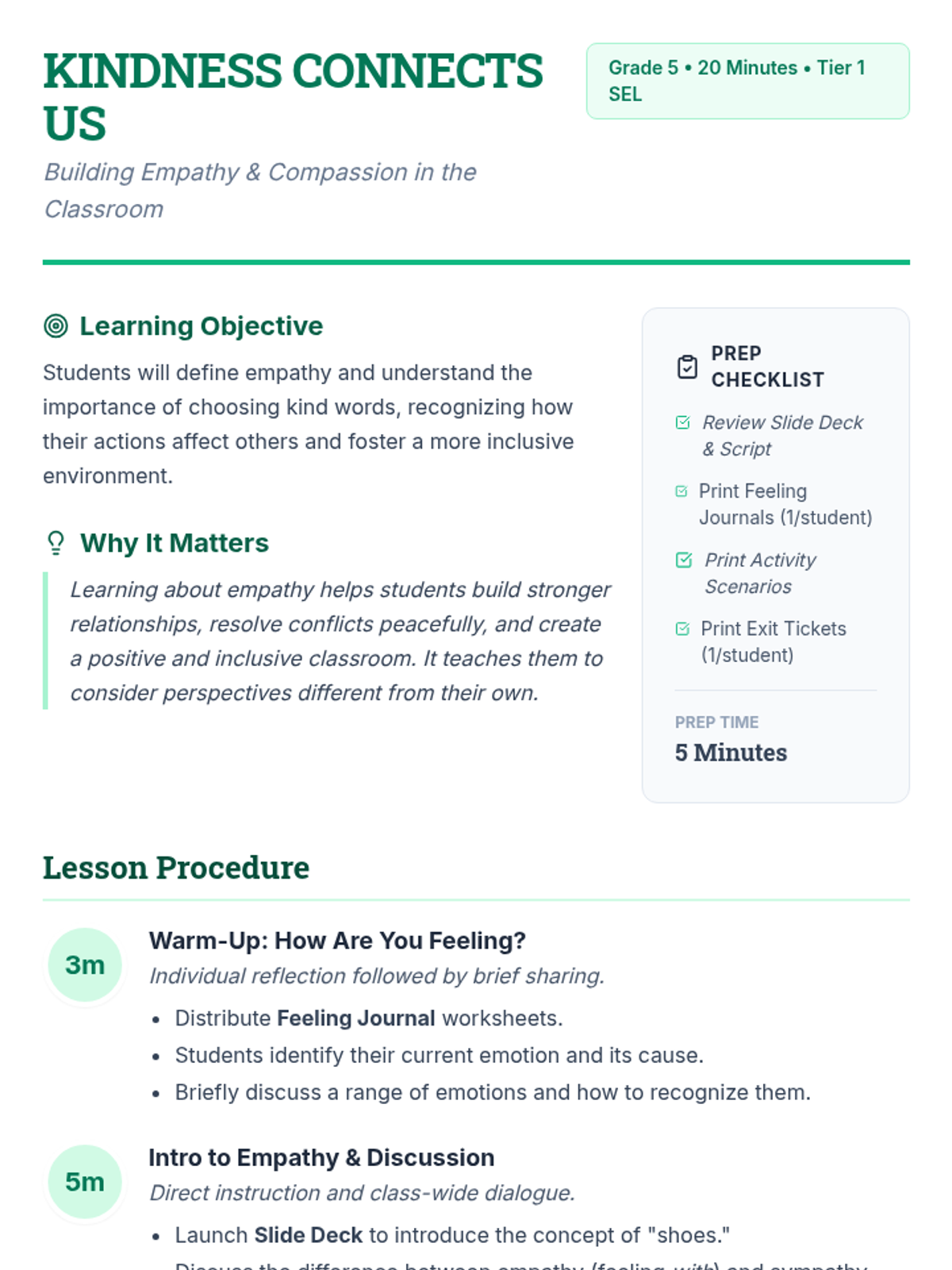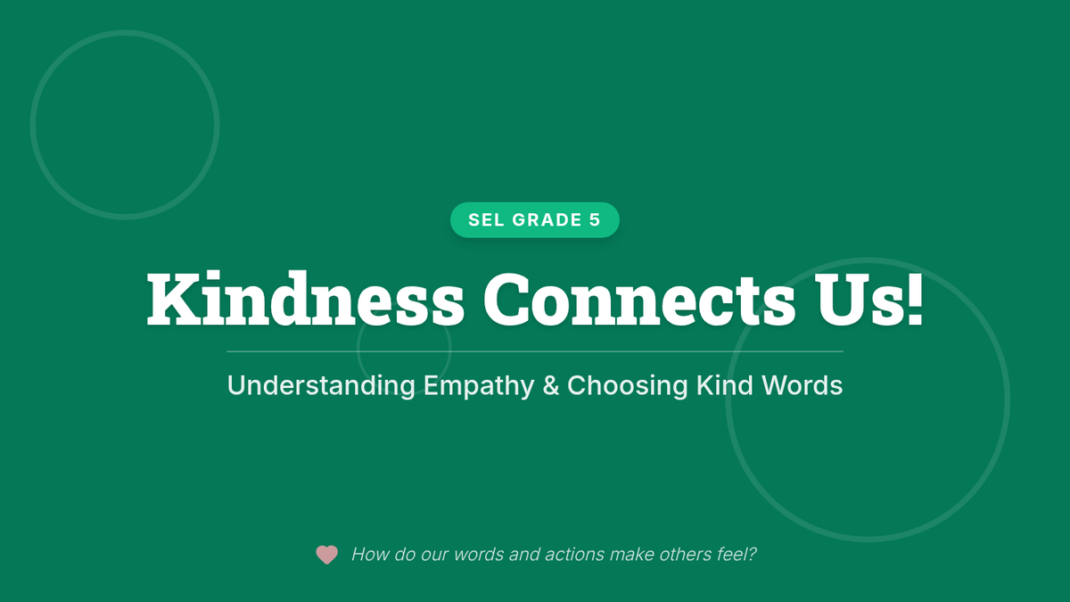A 20-minute SEL lesson for 5th graders focusing on defining empathy, recognizing feelings, and choosing kind words to build a compassionate classroom community.