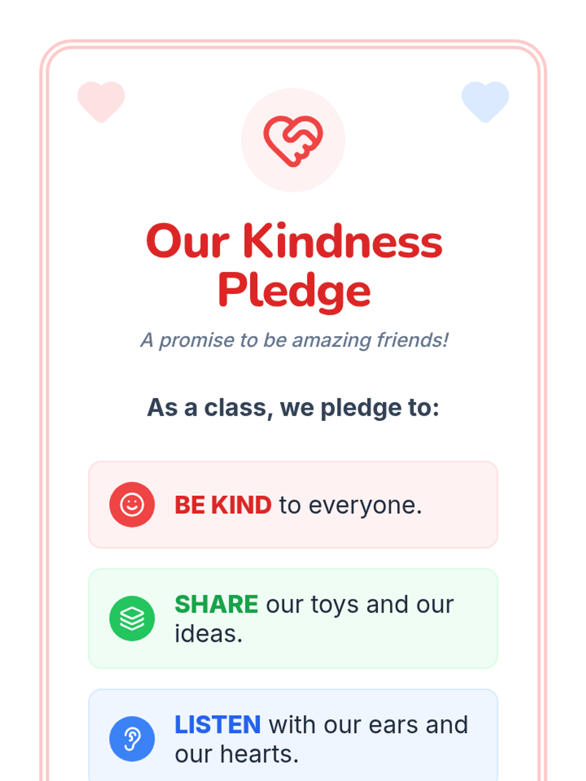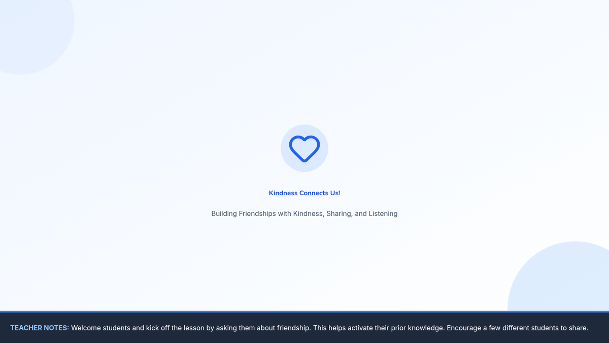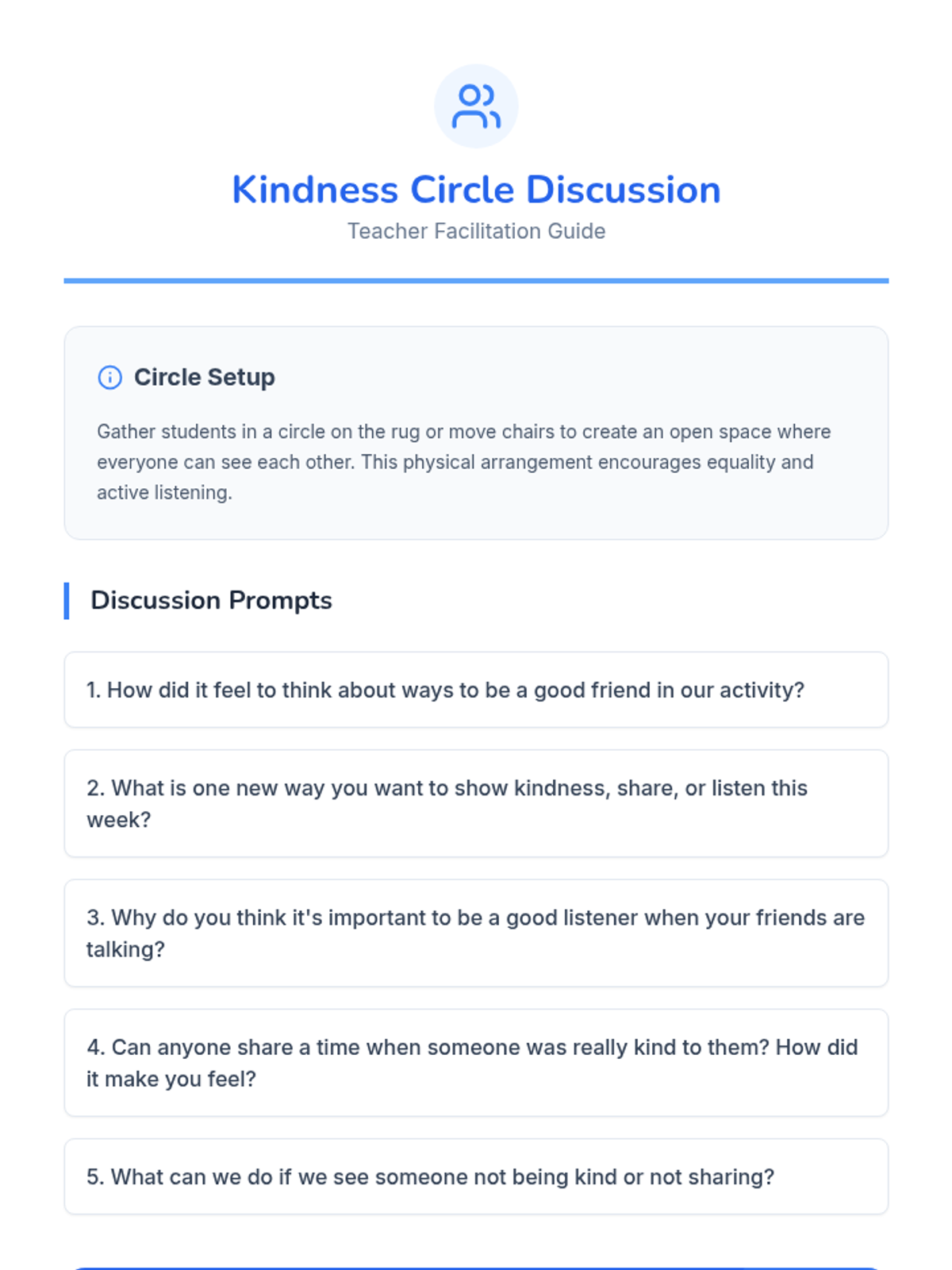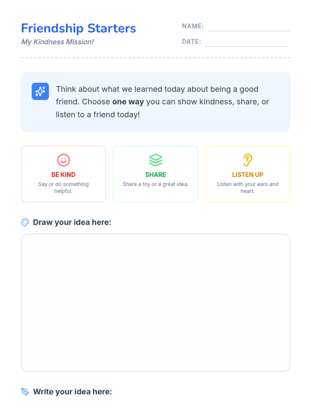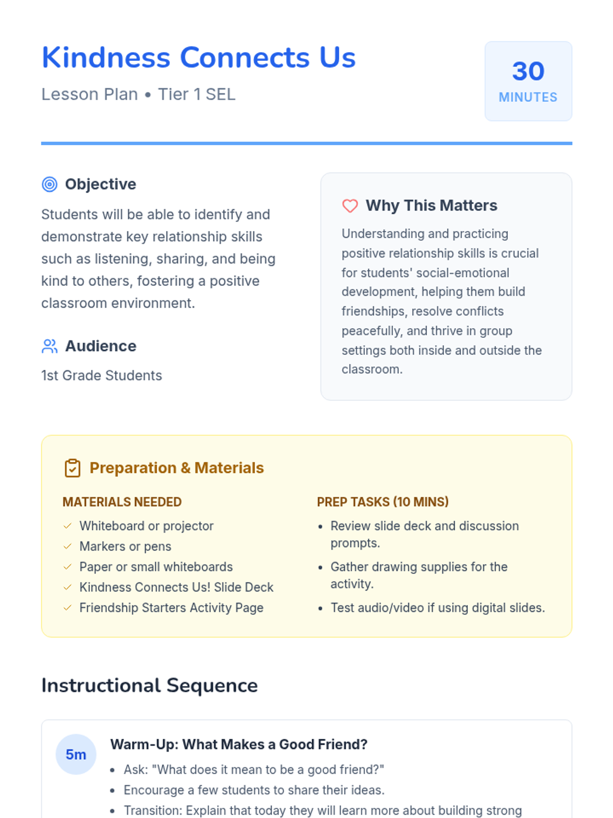 A 30-minute Tier 1 lesson for 1st graders focusing on kindness, sharing, and listening to build strong peer relationships.