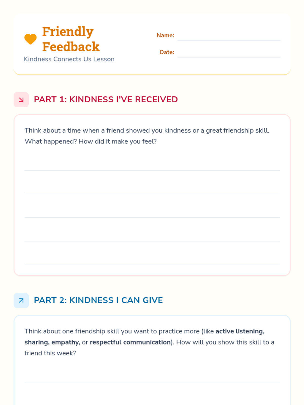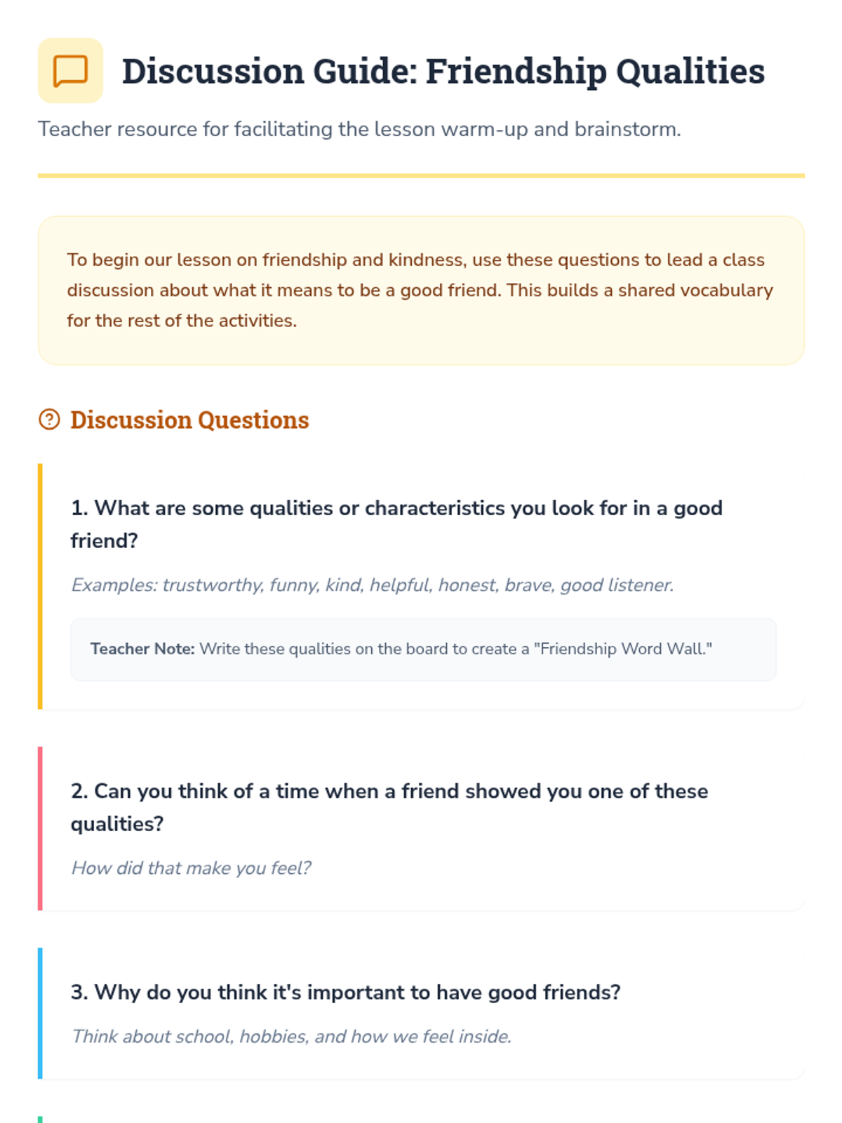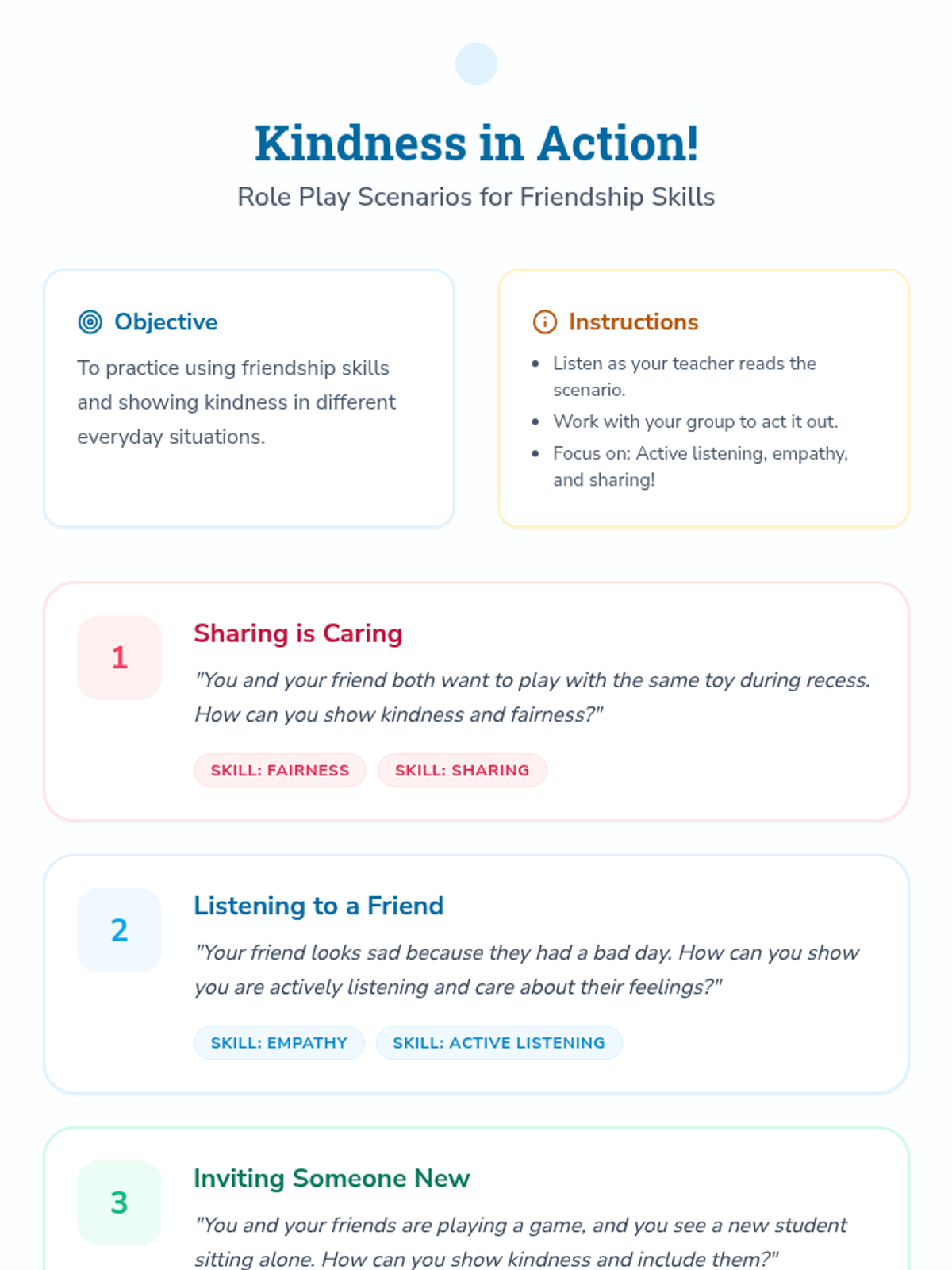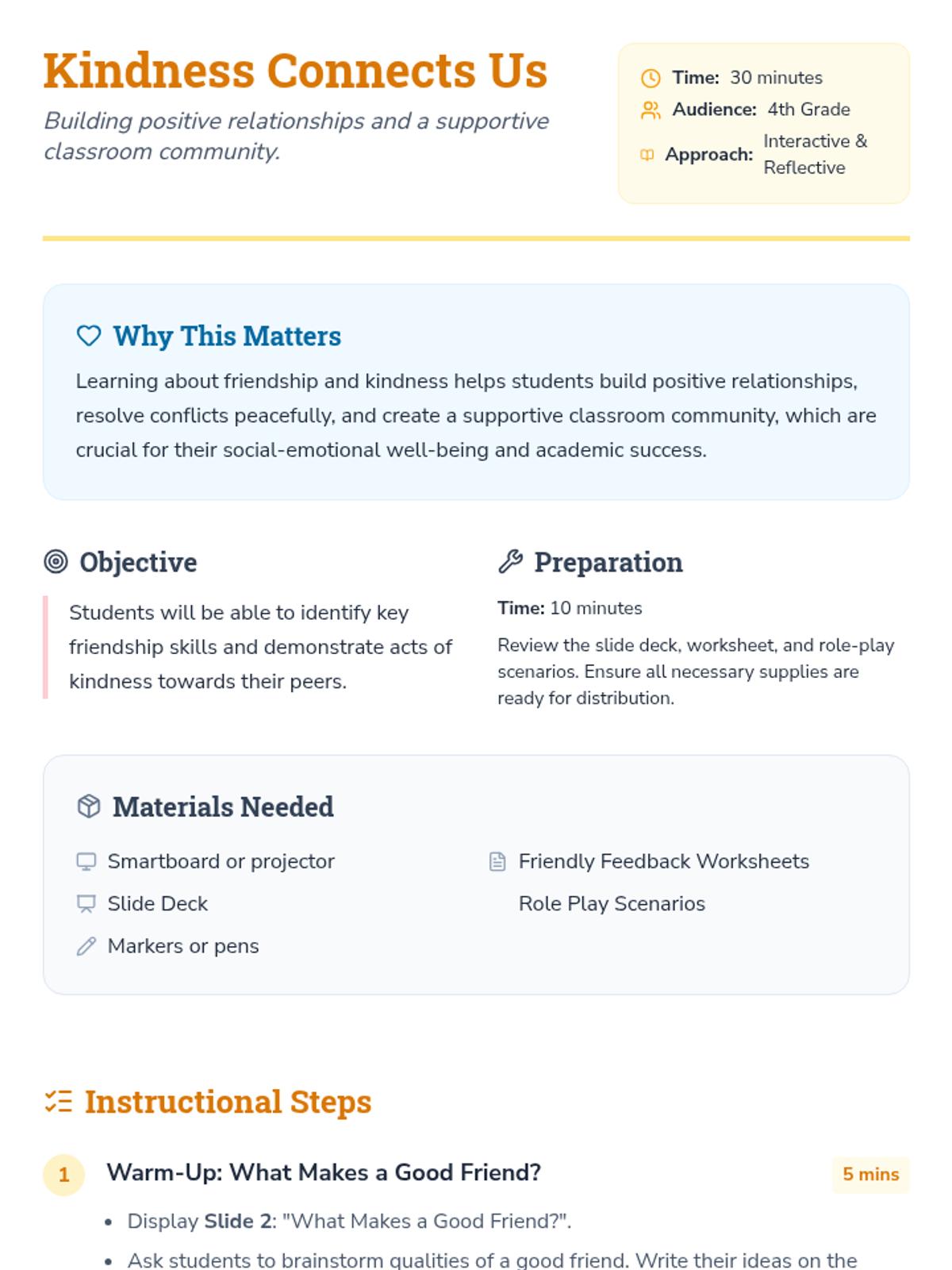 This single-session lesson helps 4th-grade students understand and practice essential friendship skills and kindness through interactive activities, discussions, and role-play. Students will explore qualities of a good friend and learn specific skills like active listening, empathy, and respectful communication to build a supportive classroom community.