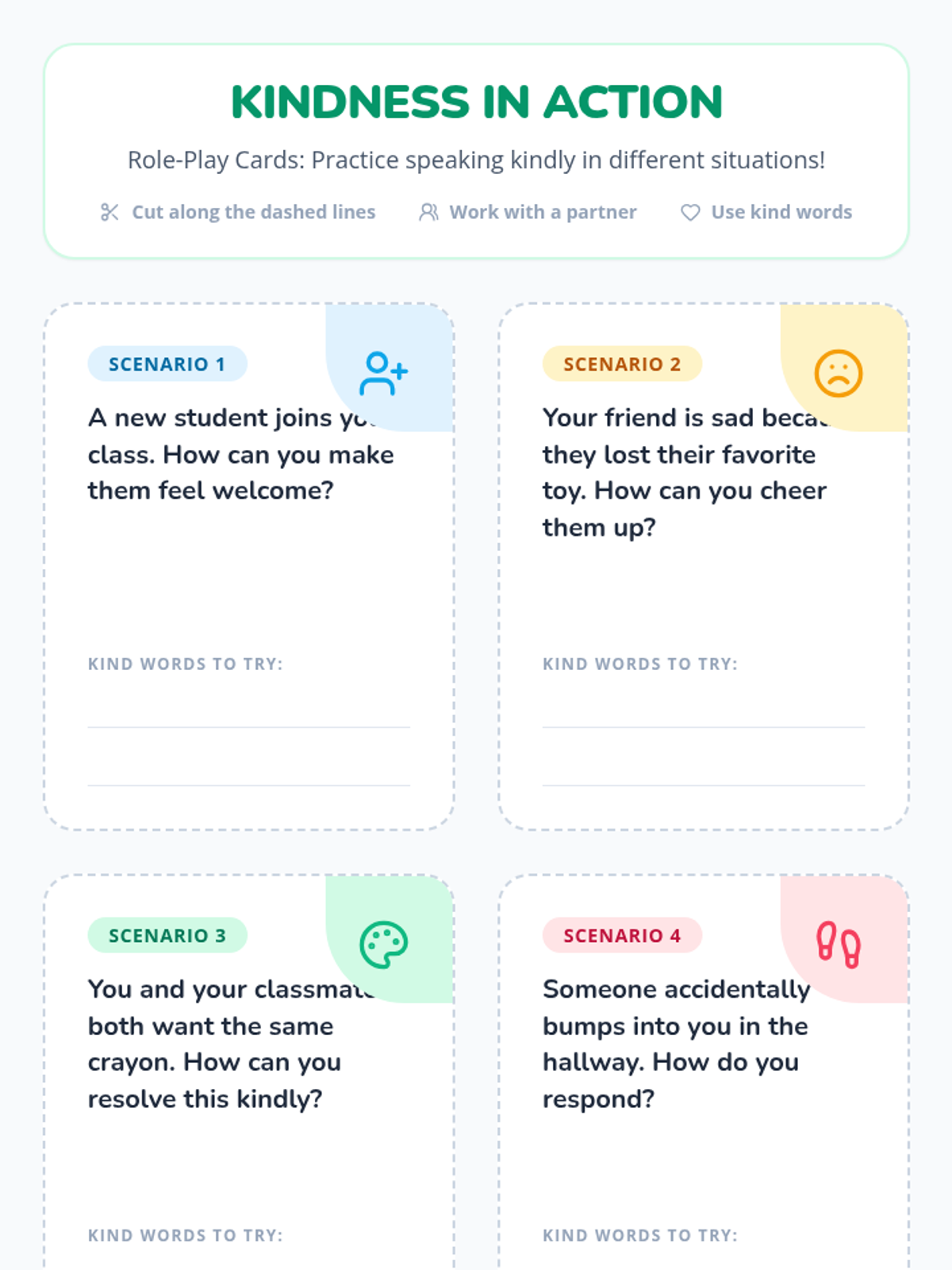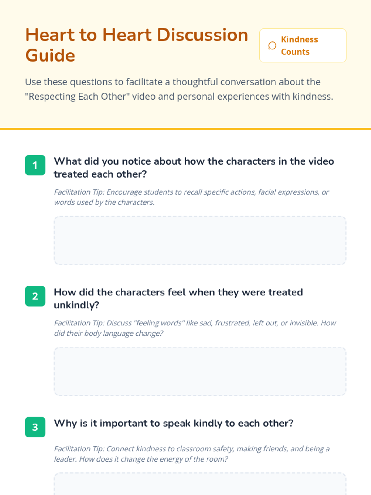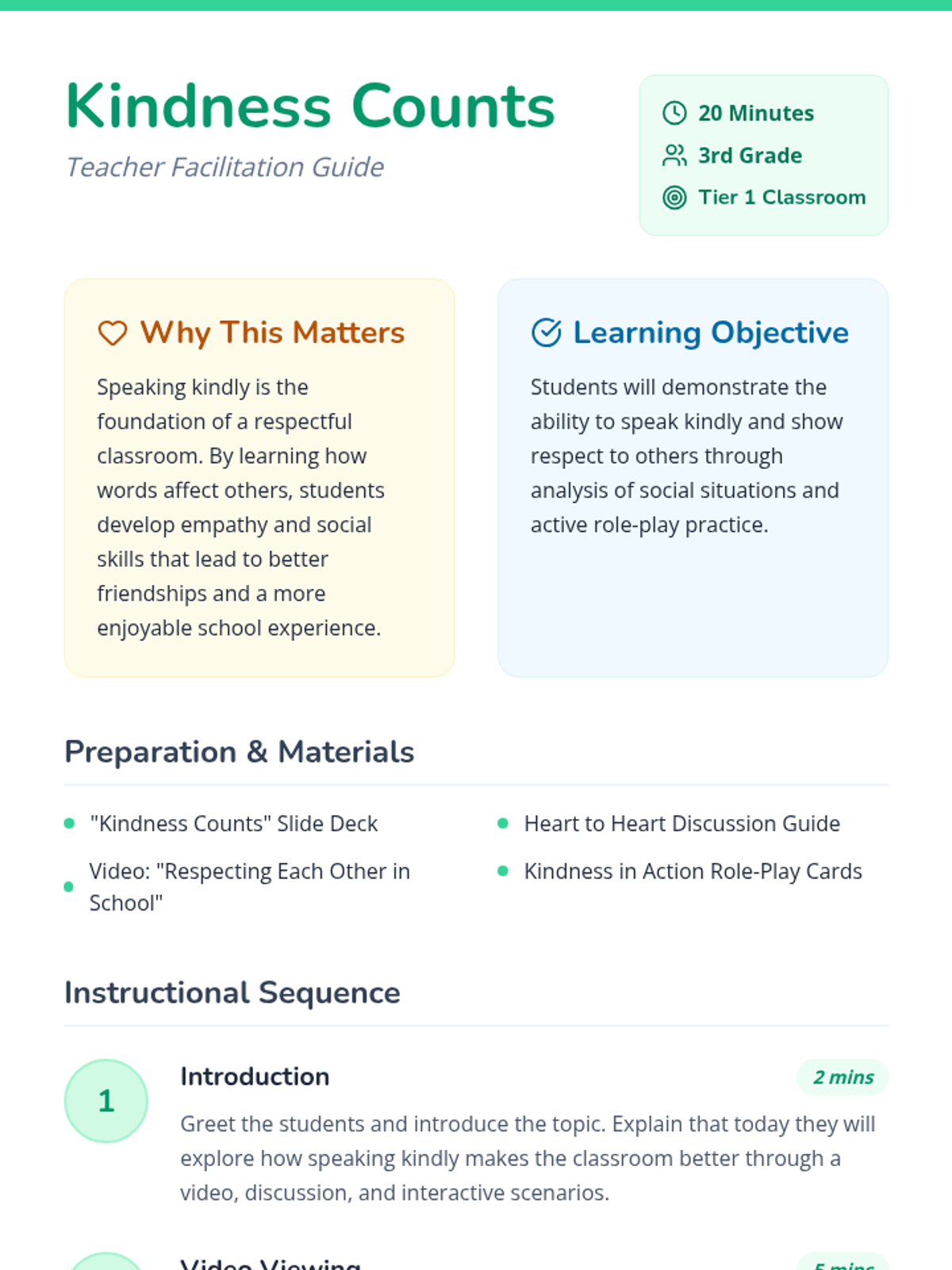 A lesson designed for 3rd graders to learn the importance of kind communication through video, discussion, and interactive role-play scenarios. Students will explore how their words affect others and practice positive social interactions to foster a respectful classroom environment.