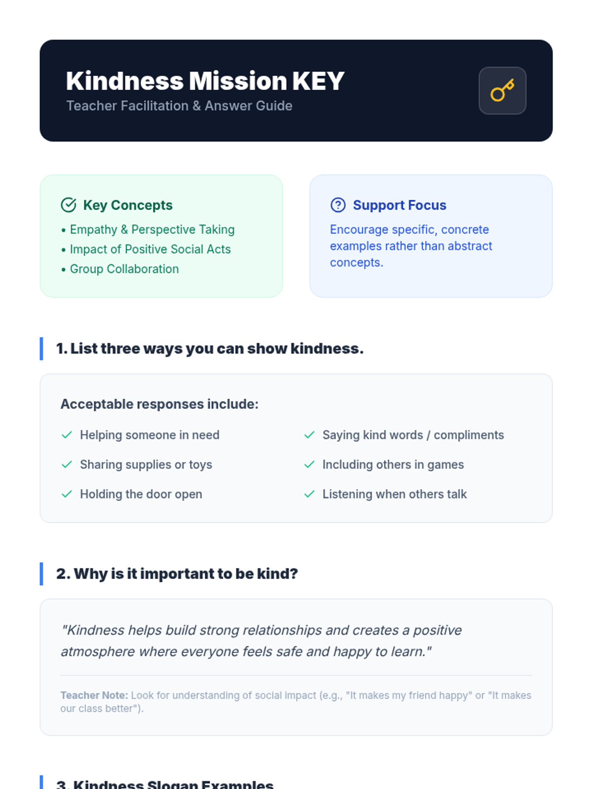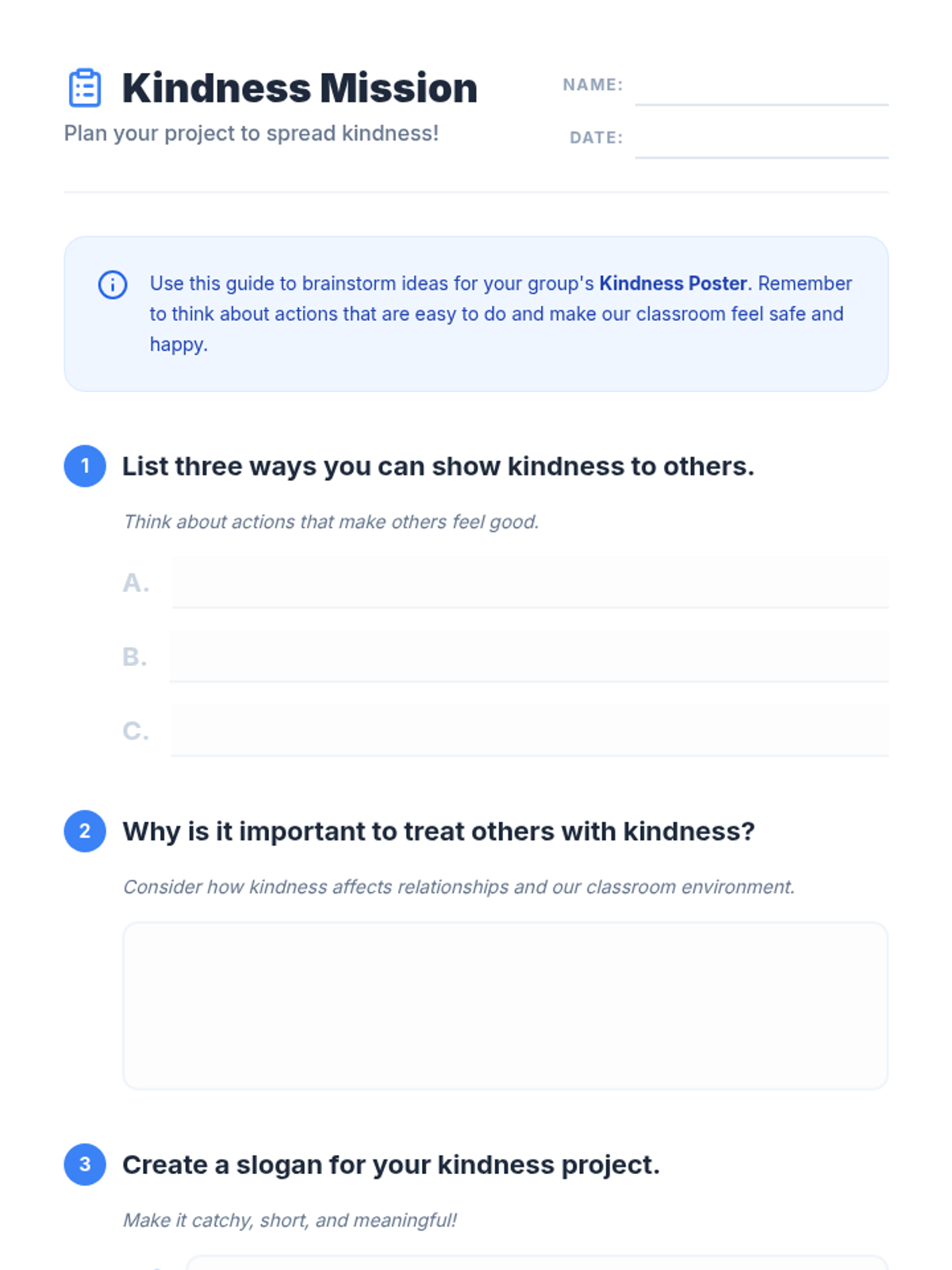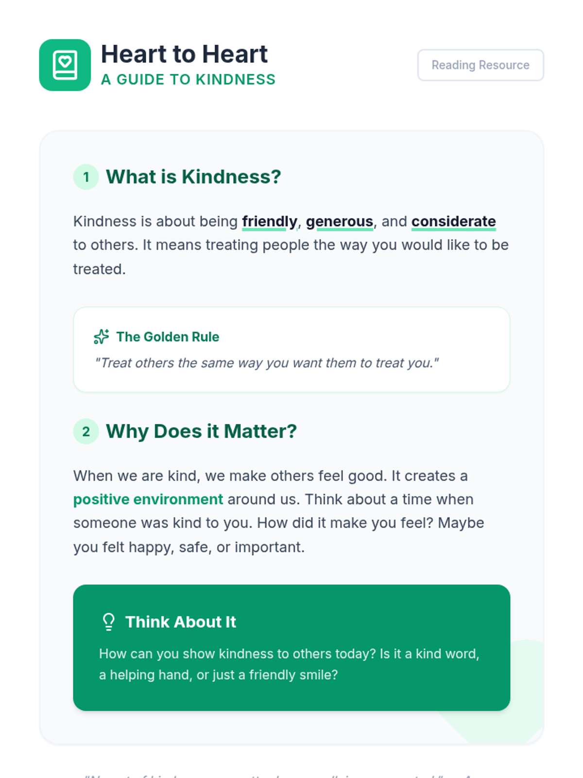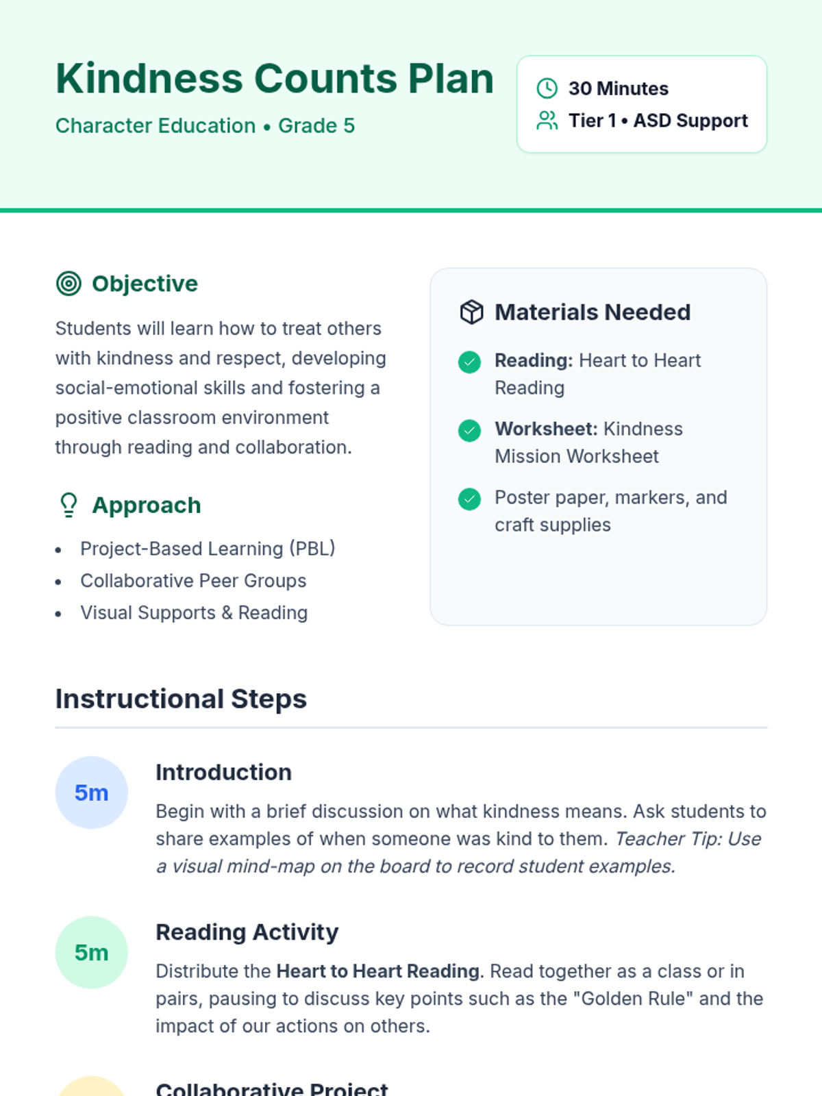 A lesson designed for 5th-grade students with autism to explore the concept of kindness through reading and a collaborative project. Students will learn how their actions impact others and create a visual 'Kindness Mission' to share with the class.