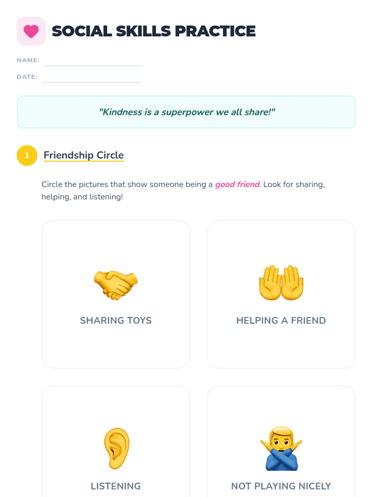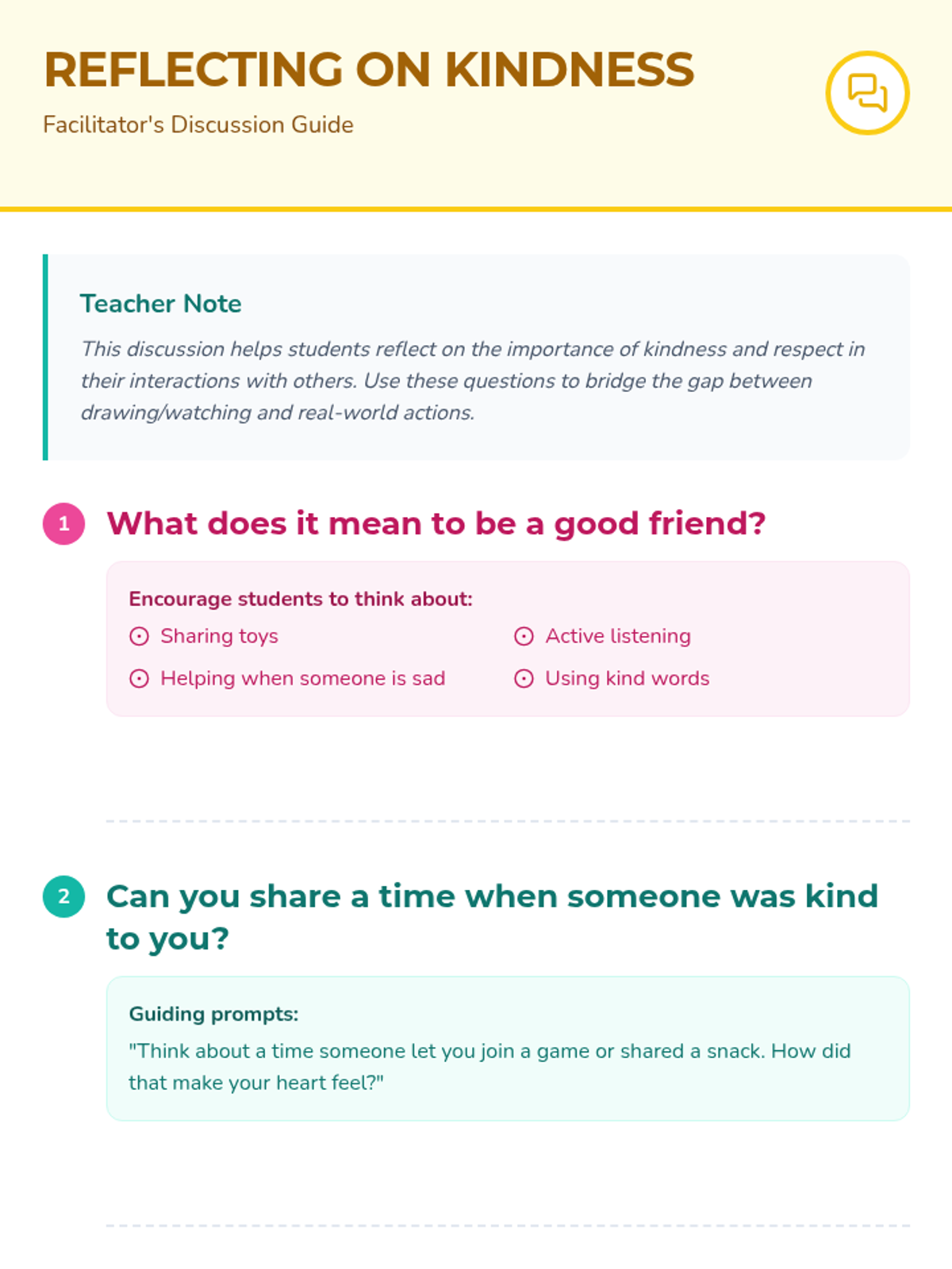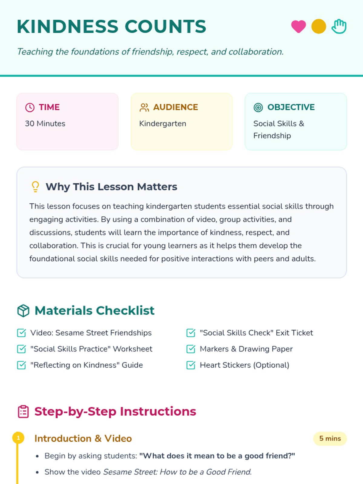 This lesson focuses on teaching kindergarten students essential social skills through engaging activities. By using a combination of video, group activities, and discussions, students will learn the importance of kindness, respect, and collaboration.