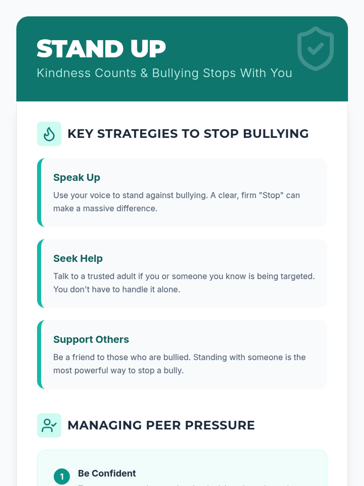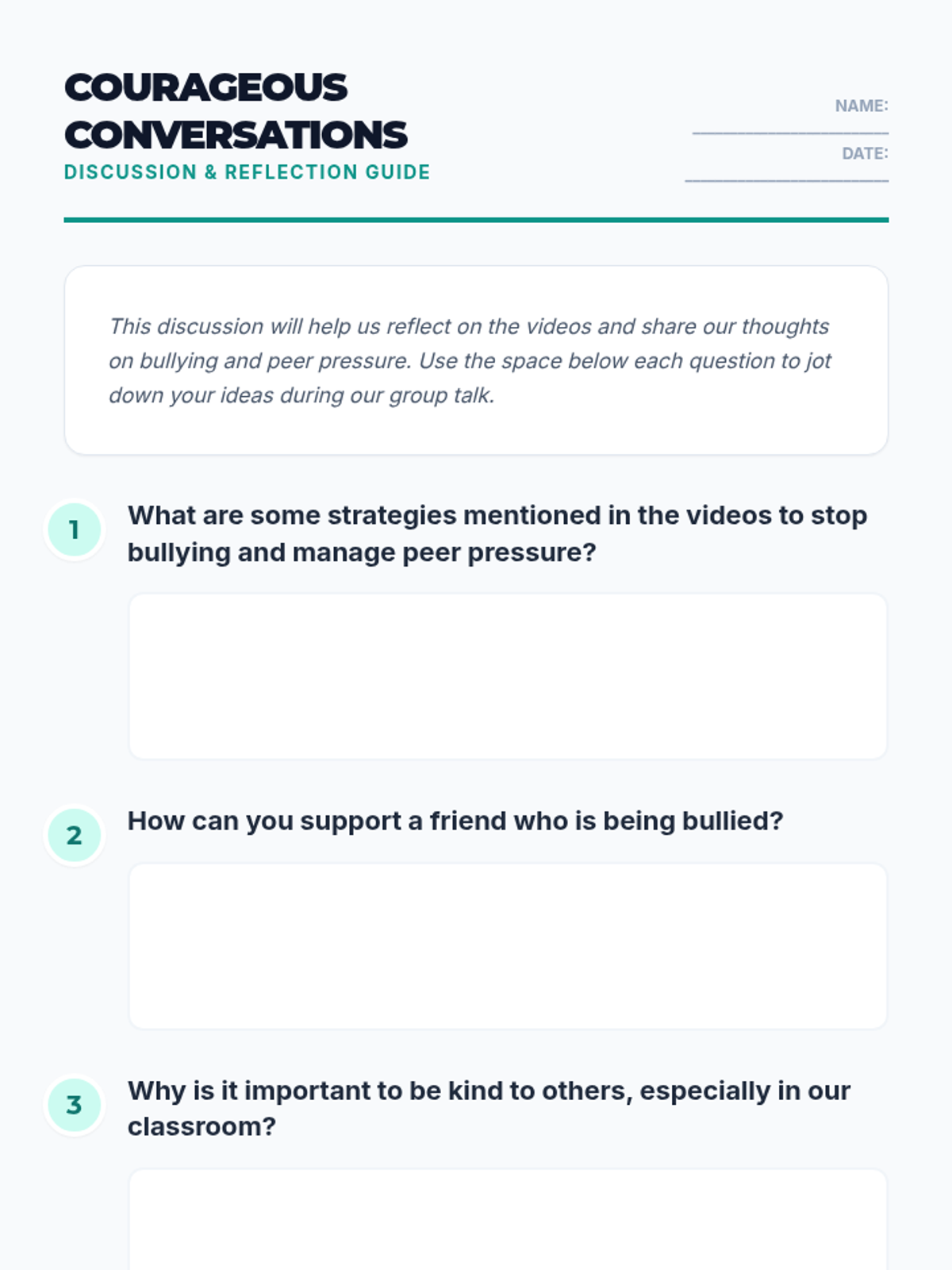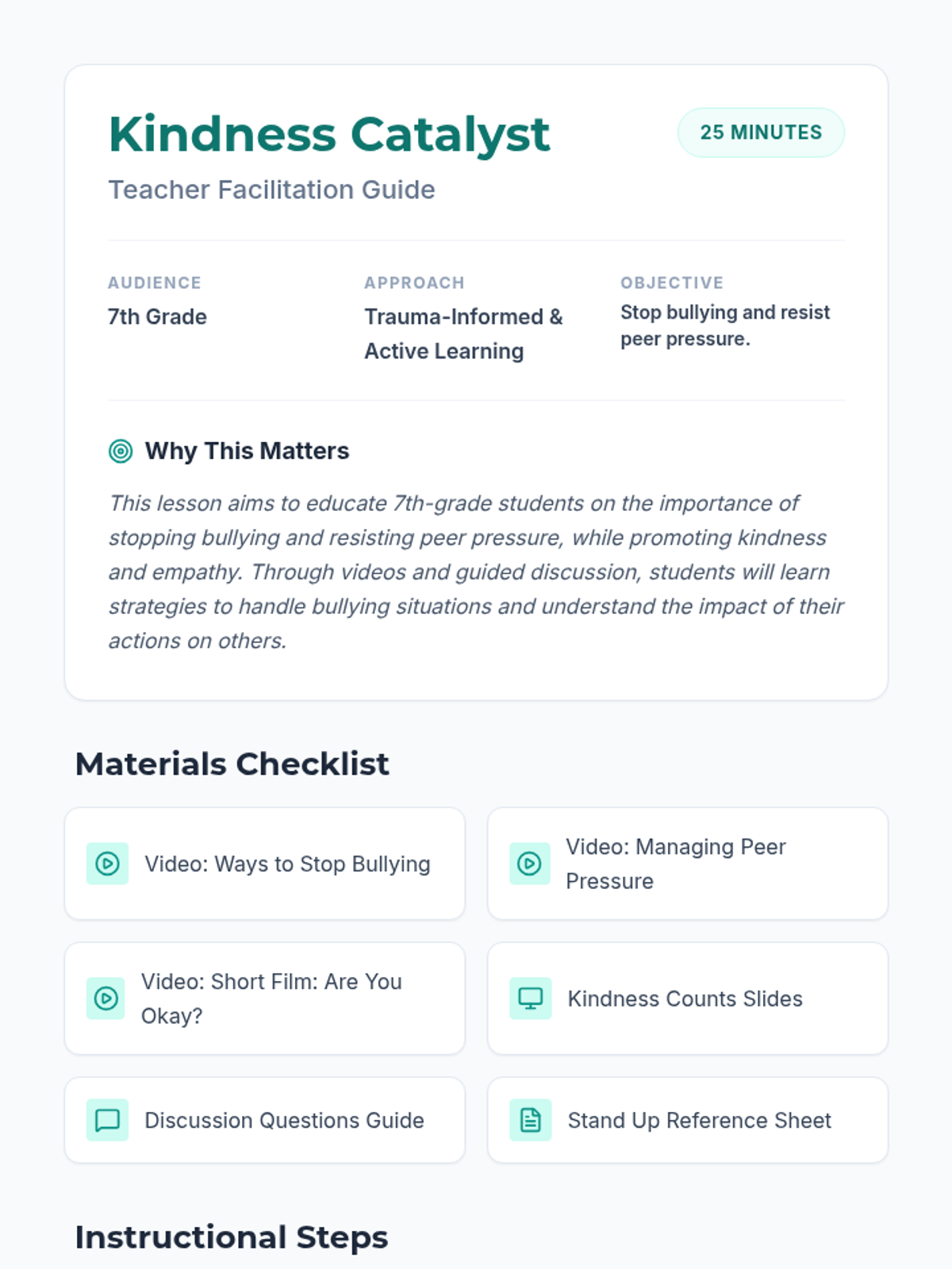 A 25-minute lesson for 7th graders focused on stopping bullying, resisting peer pressure, and fostering empathy through video-based discussion and strategy building.