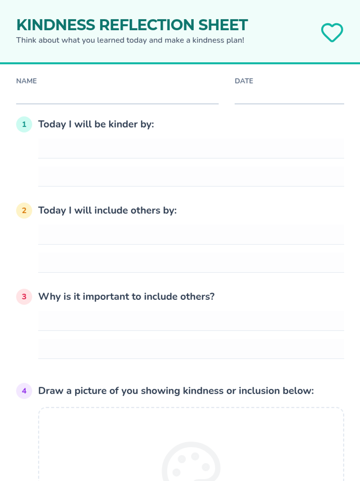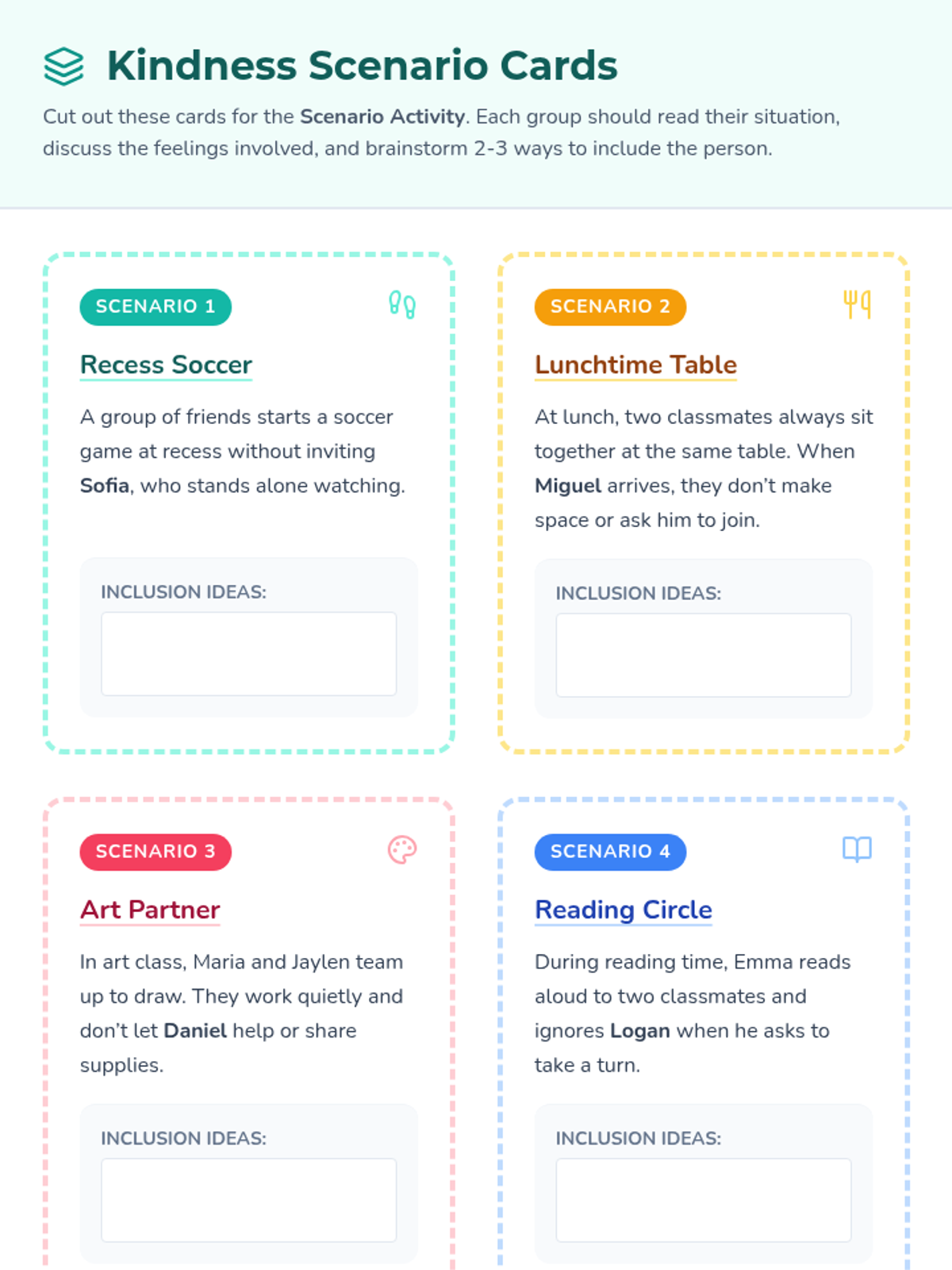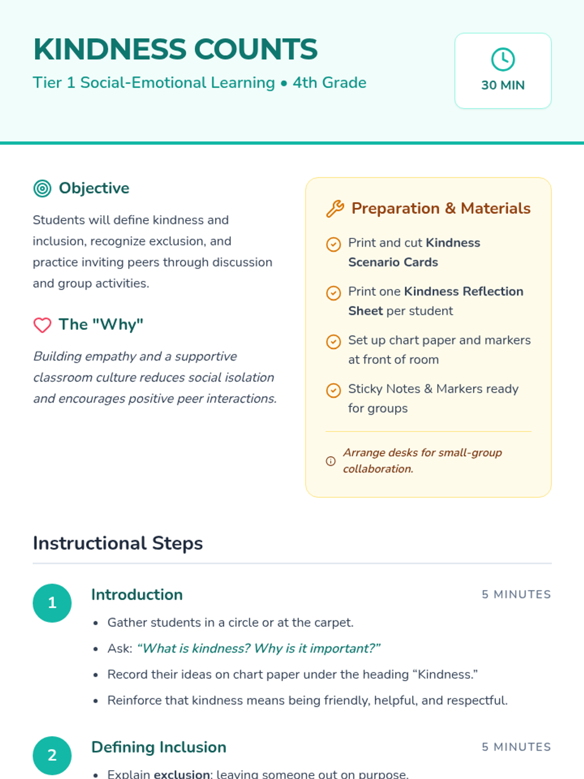 A 30-minute Tier 1 classroom lesson for 4th graders focused on defining kindness, recognizing exclusion, and practicing inclusive behaviors through scenarios and reflection.
