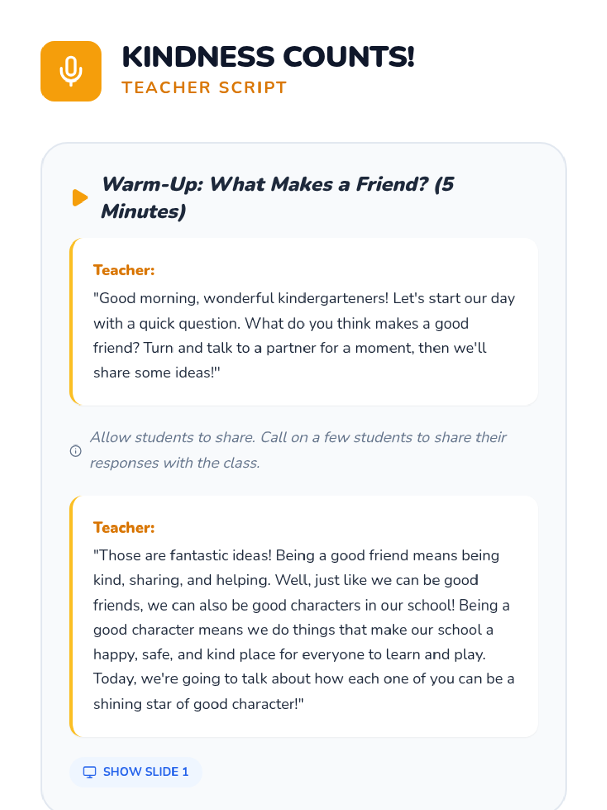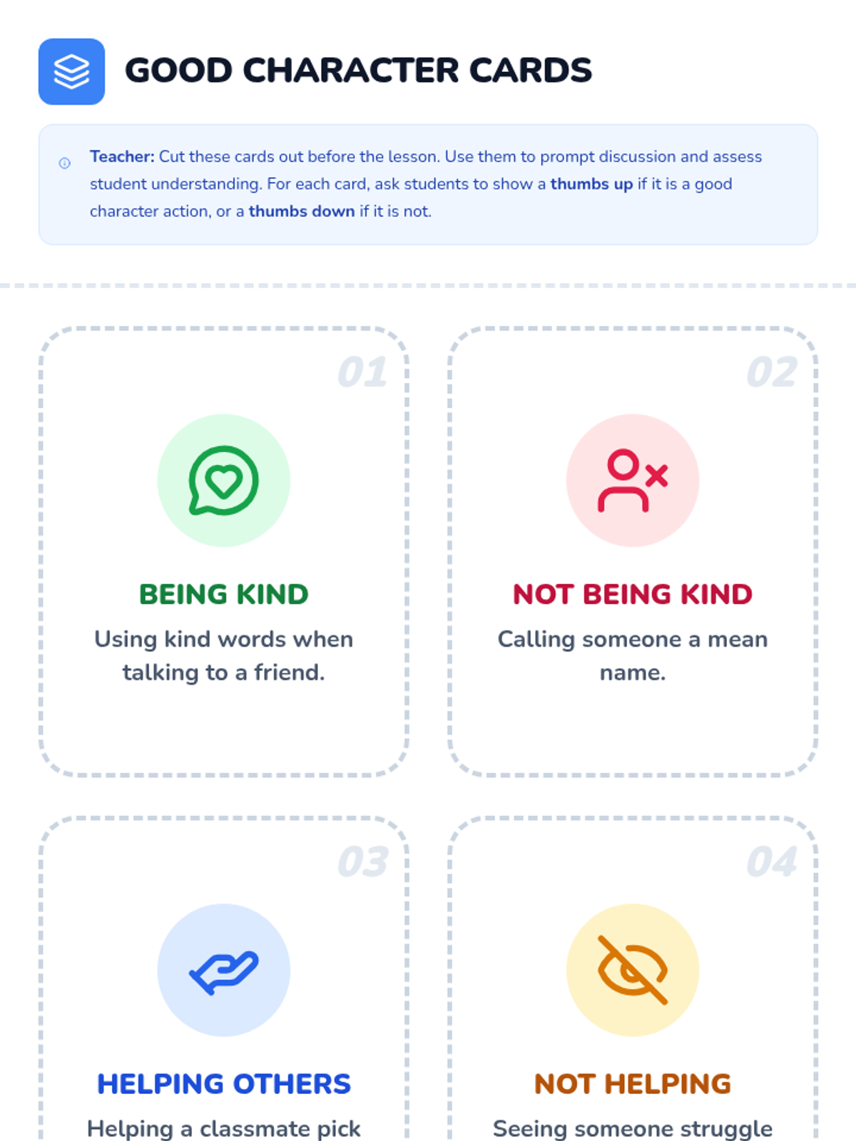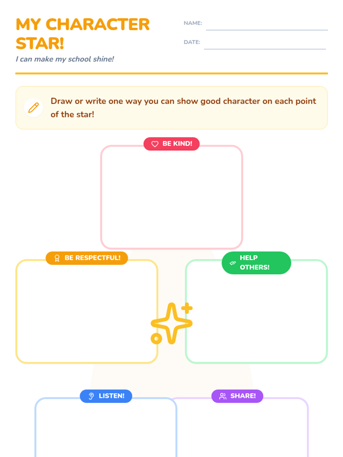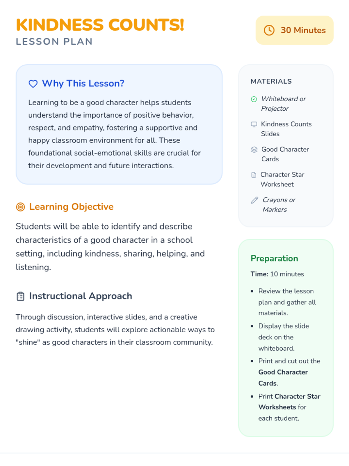 This lesson introduces Kindergarten students to the concept of being a 'good character' in school by focusing on simple, actionable behaviors like kindness, sharing, and helping. Students will learn how these actions make school a better place for everyone.