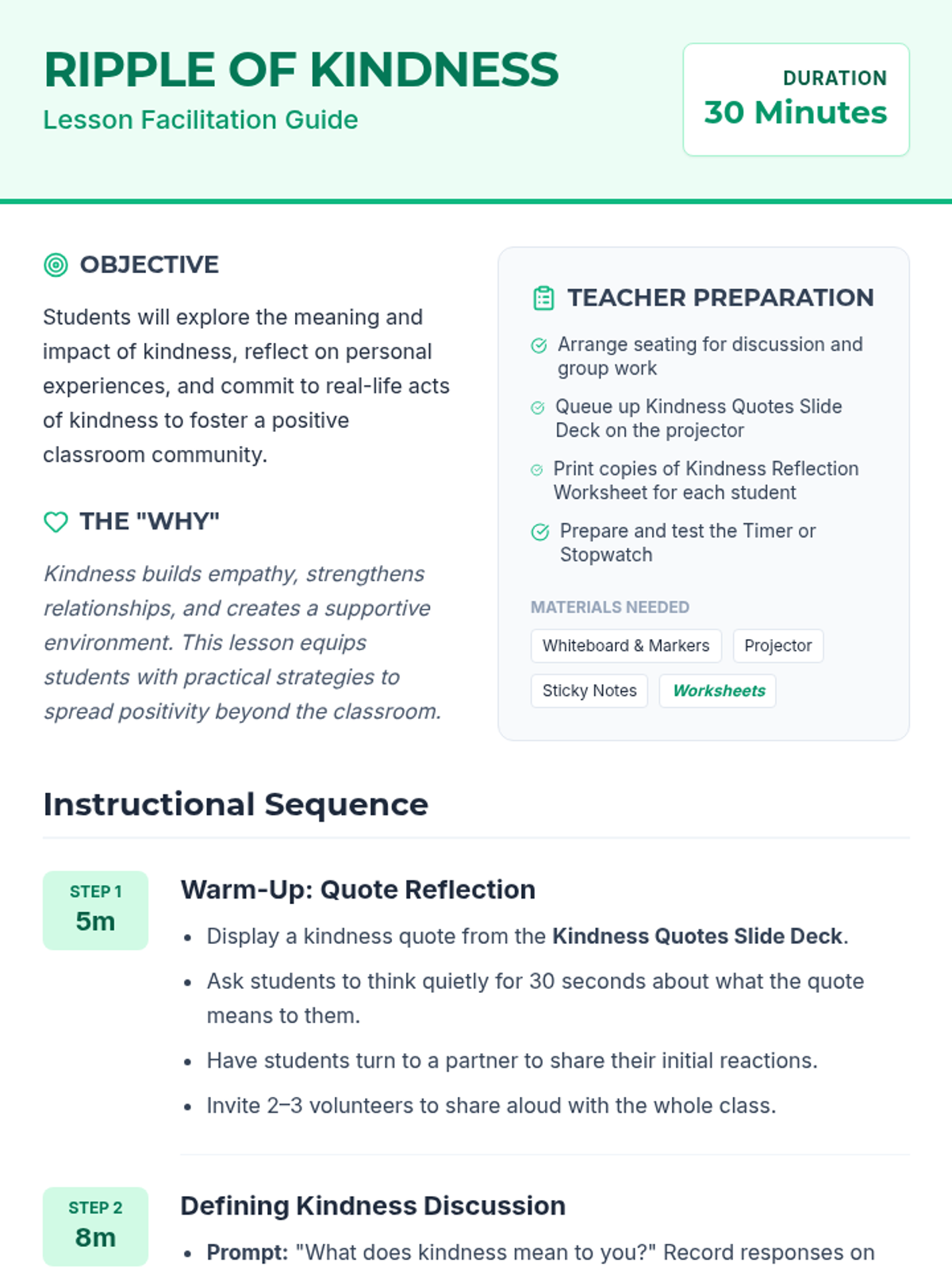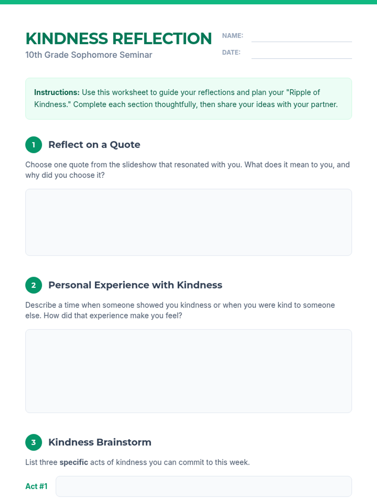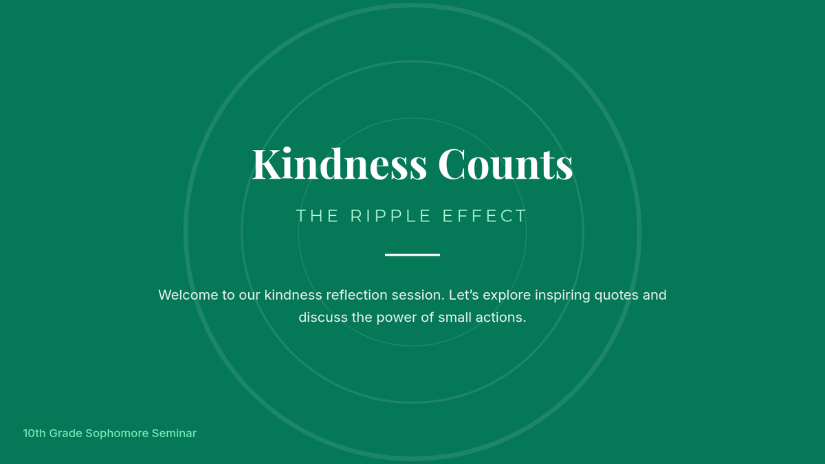 A 30-minute seminar for 10th graders exploring the impact of kindness through reflection, discussion, and actionable pledges. Students learn how small acts create a ripple effect in their community.