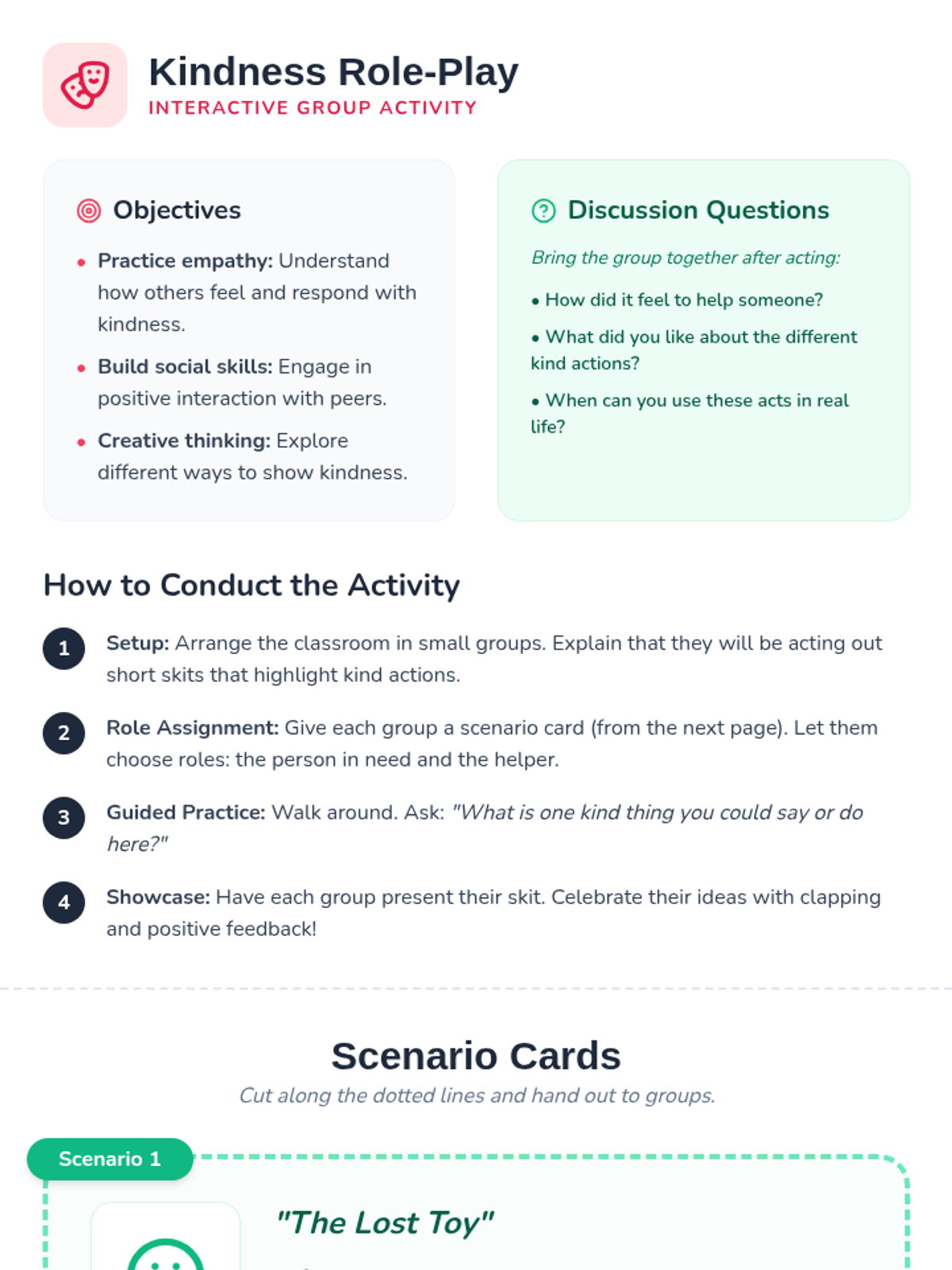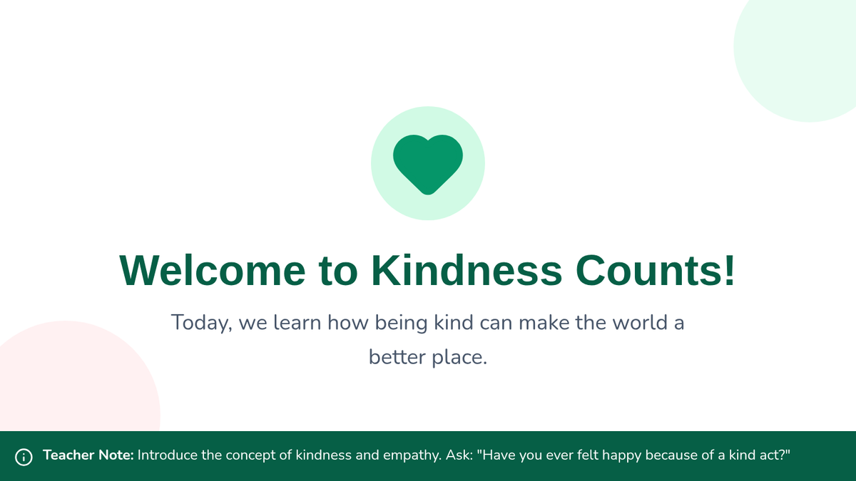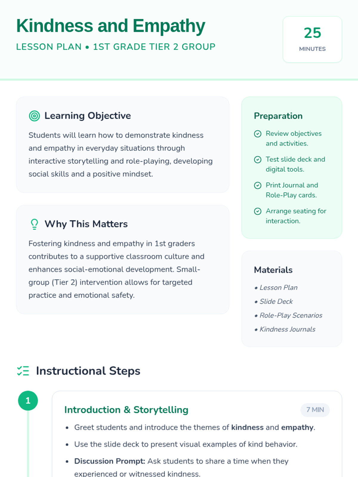 A Tier 2 behavioral intervention lesson for 1st graders focused on empathy and kindness through interactive storytelling, role-play, and journaling.