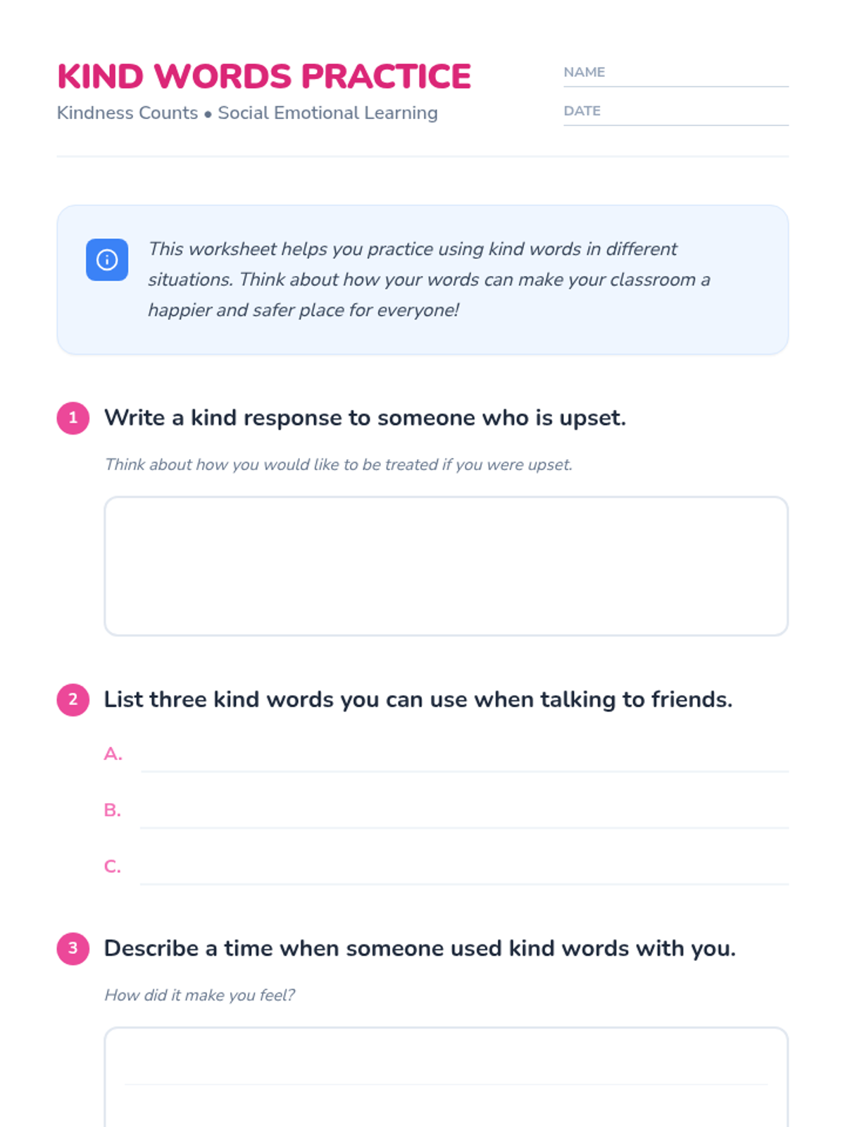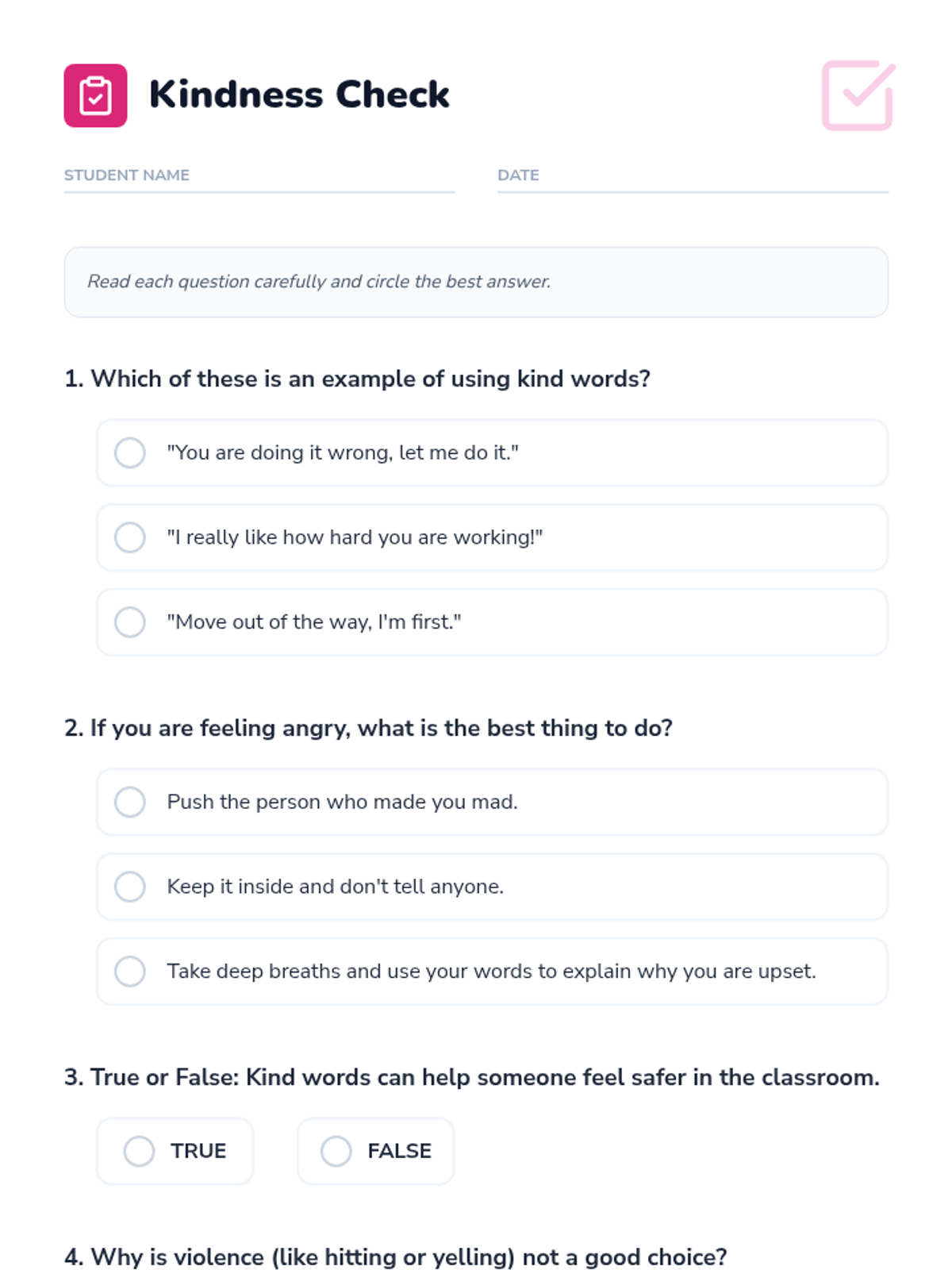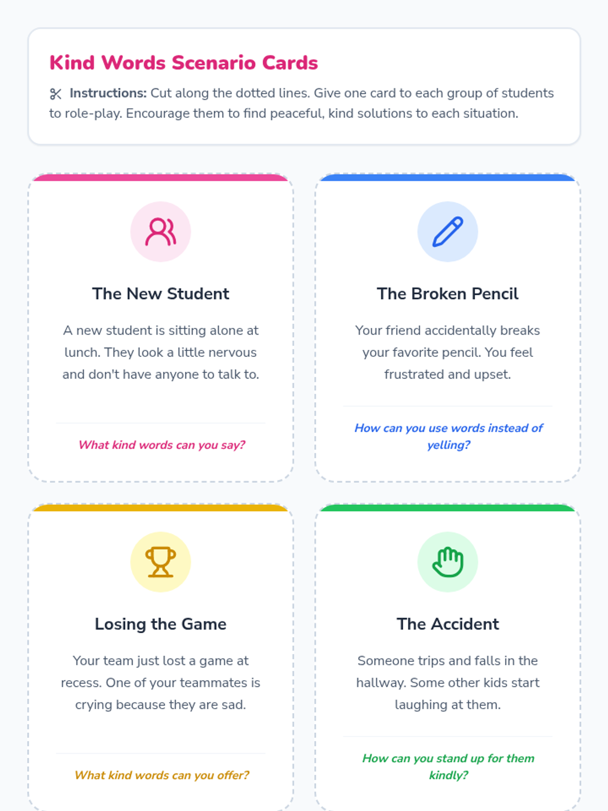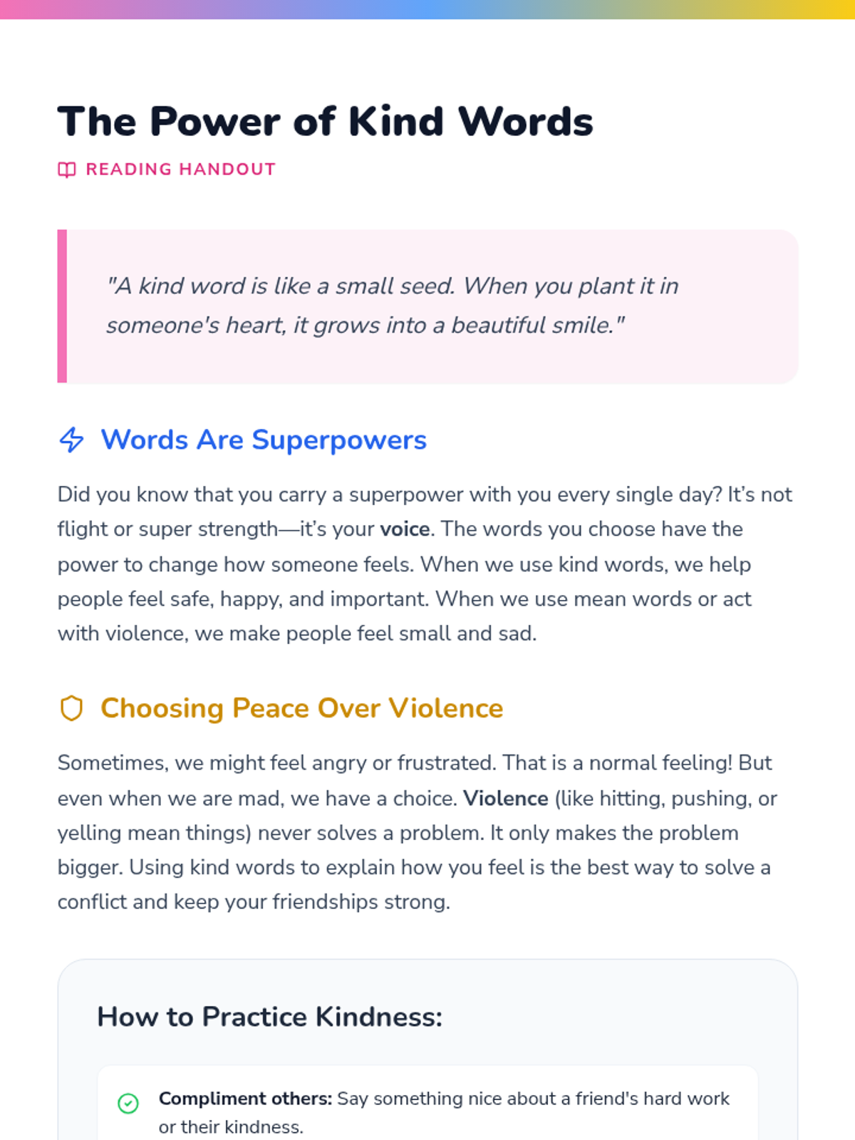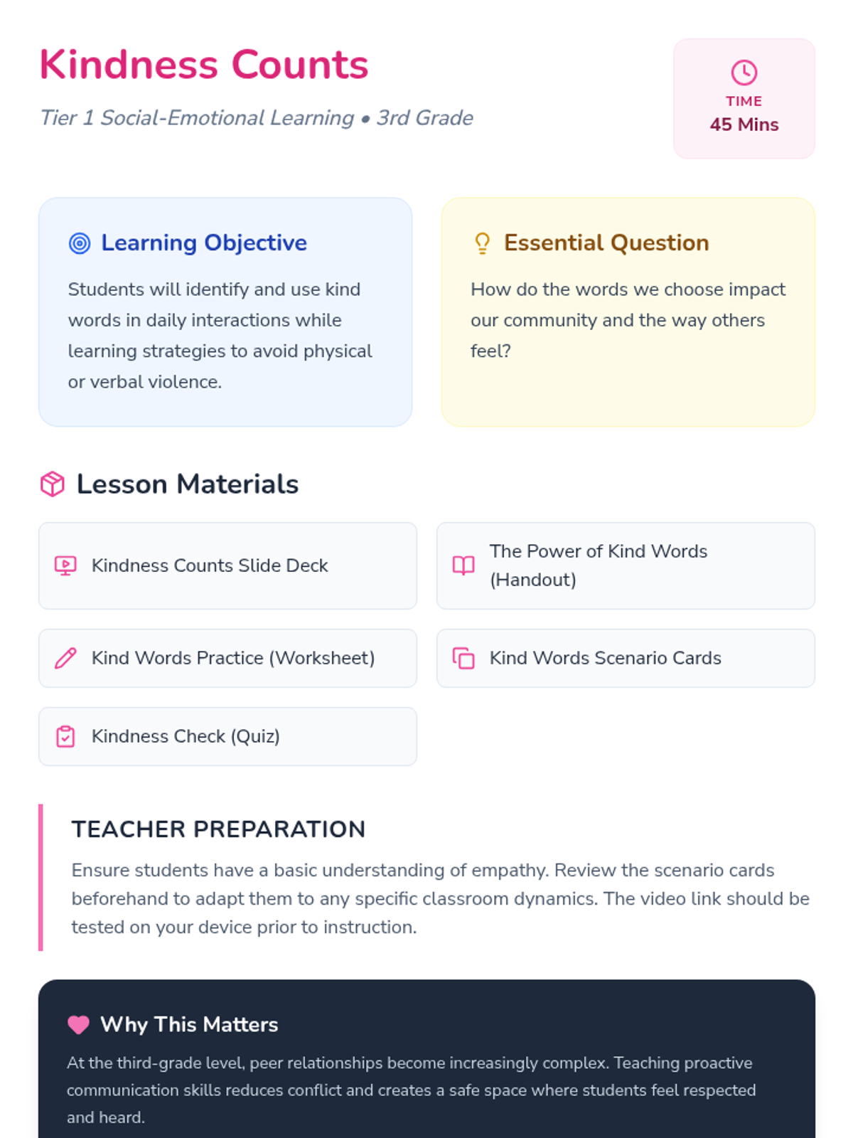 This lesson aims to teach third-grade students the importance of using kind words and avoiding violence through interactive activities and discussions. By fostering a positive classroom environment, students will learn to communicate effectively and empathetically, which is crucial for their social development and conflict resolution skills.