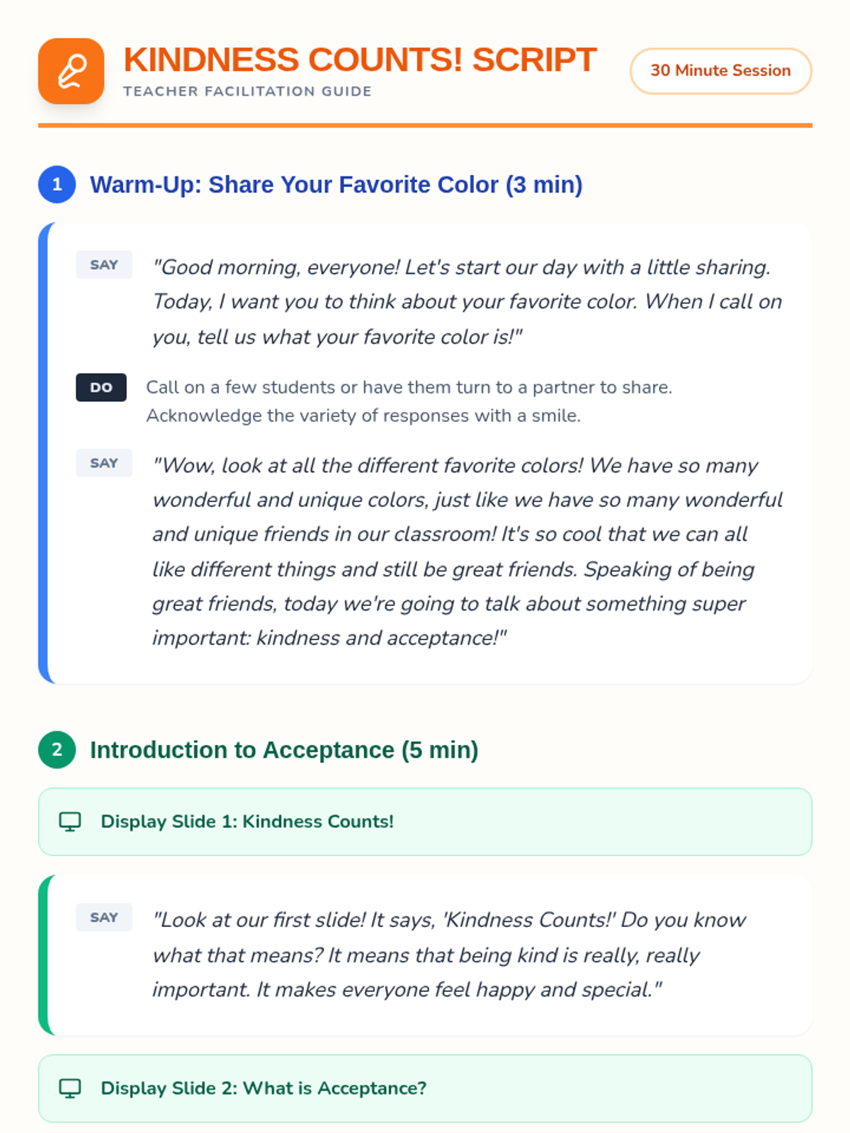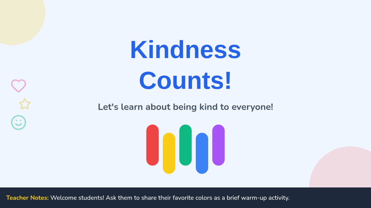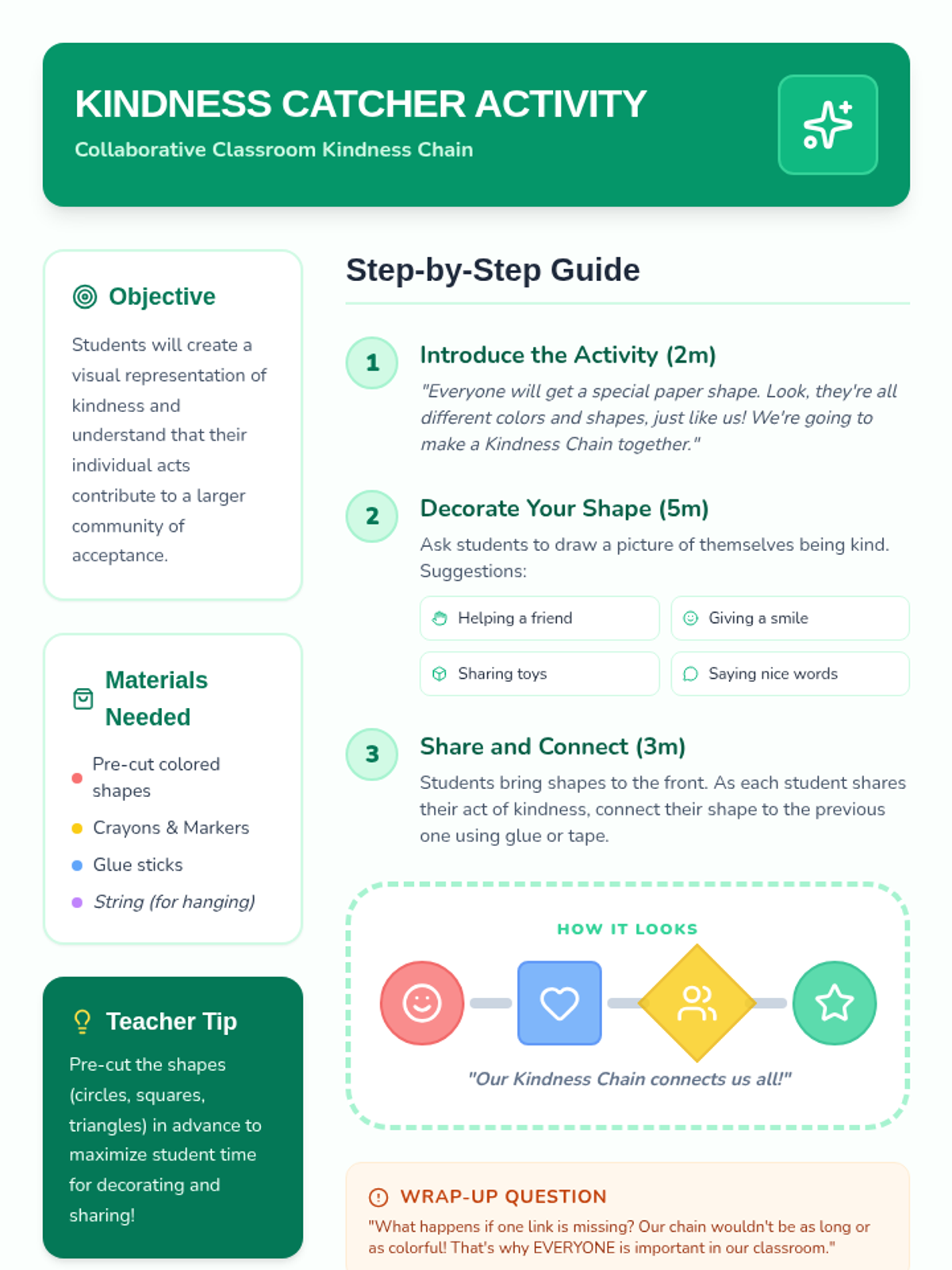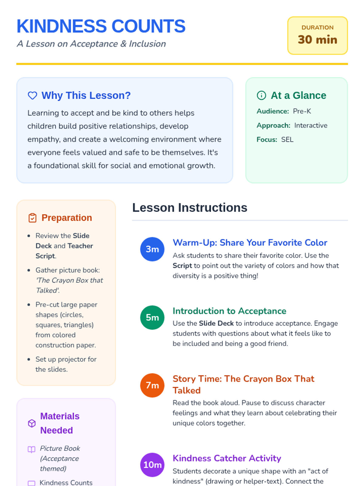 This lesson introduces Pre-K students to the concept of acceptance and kindness towards others. It helps children understand the importance of including everyone and celebrating differences through a story and a collaborative kindness chain activity.