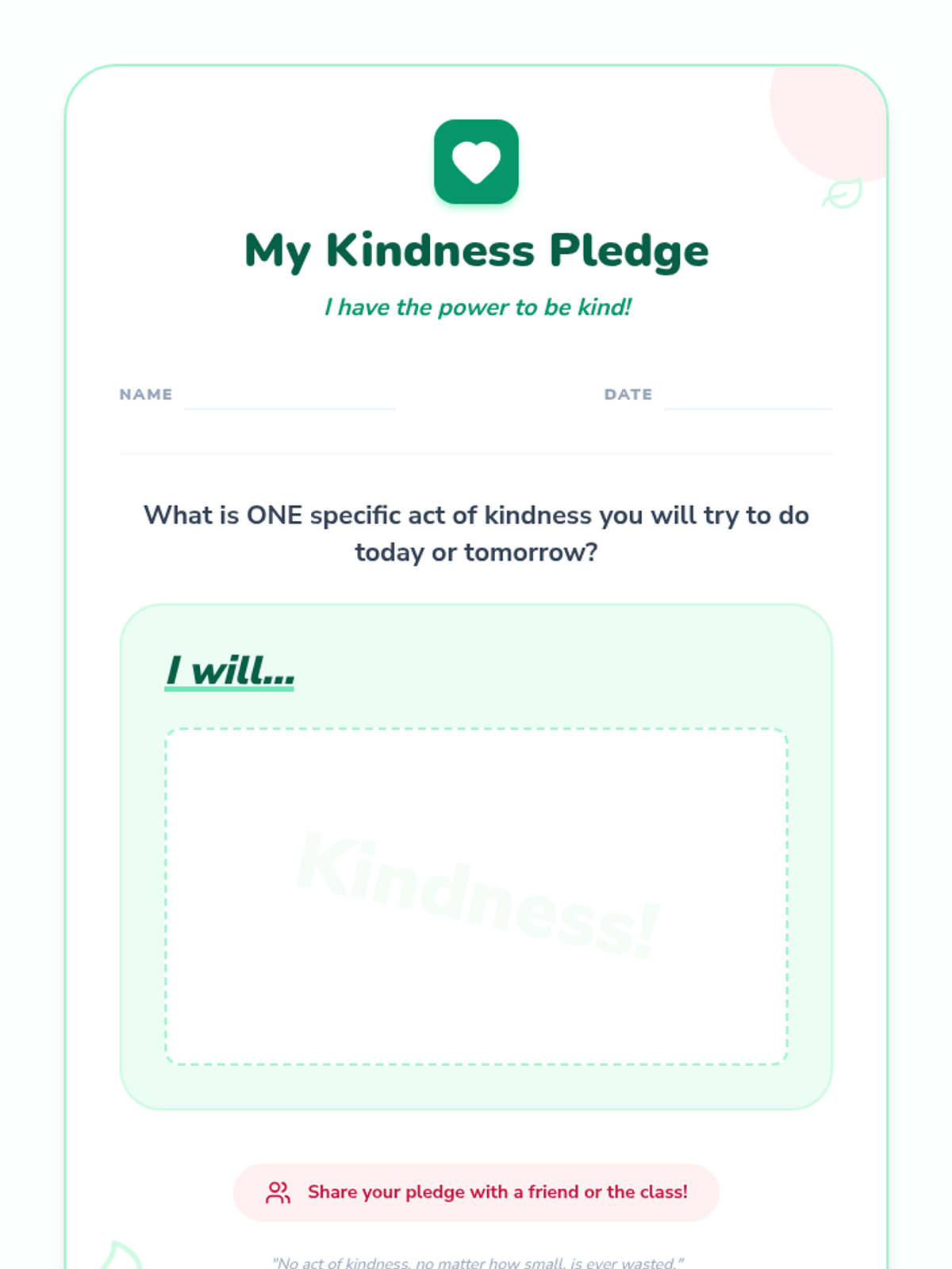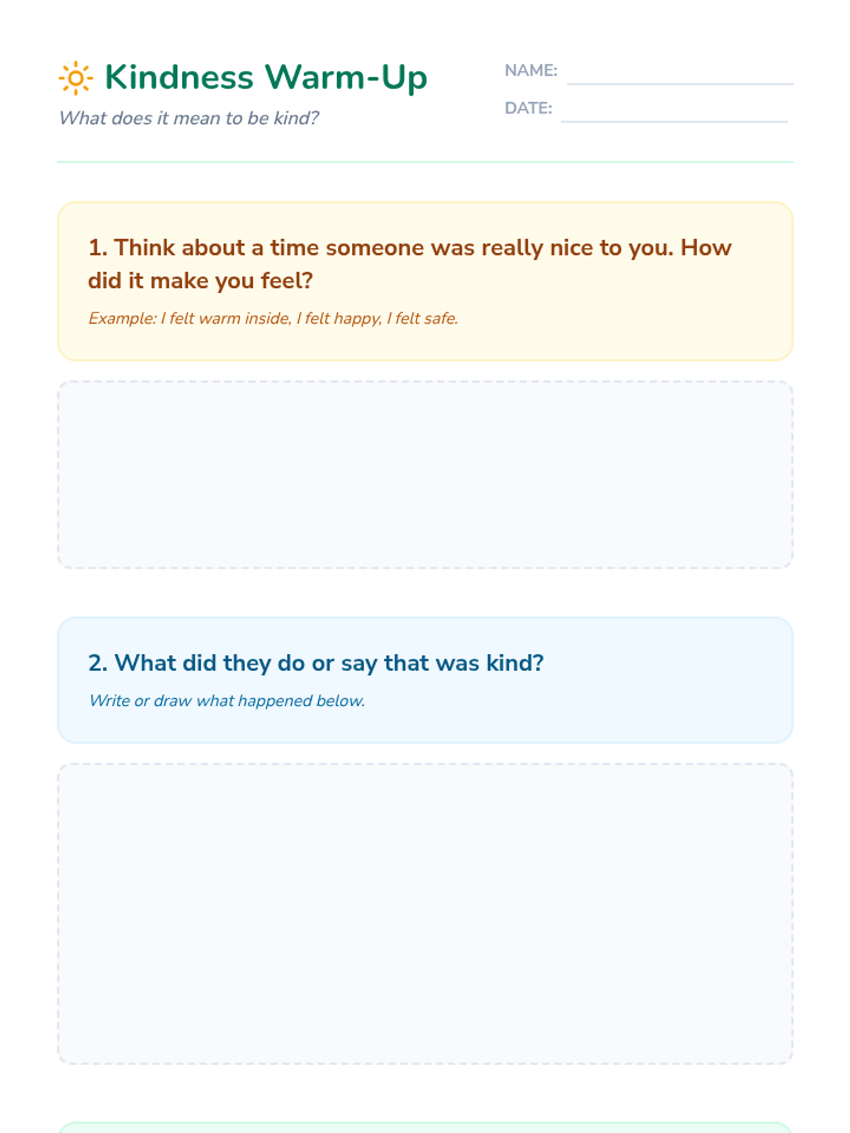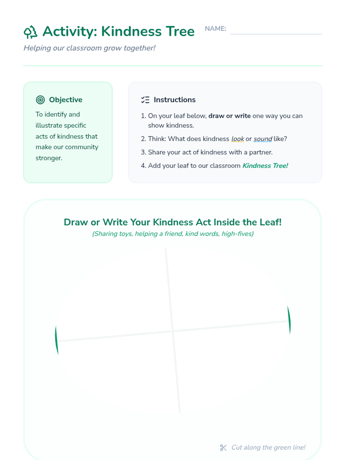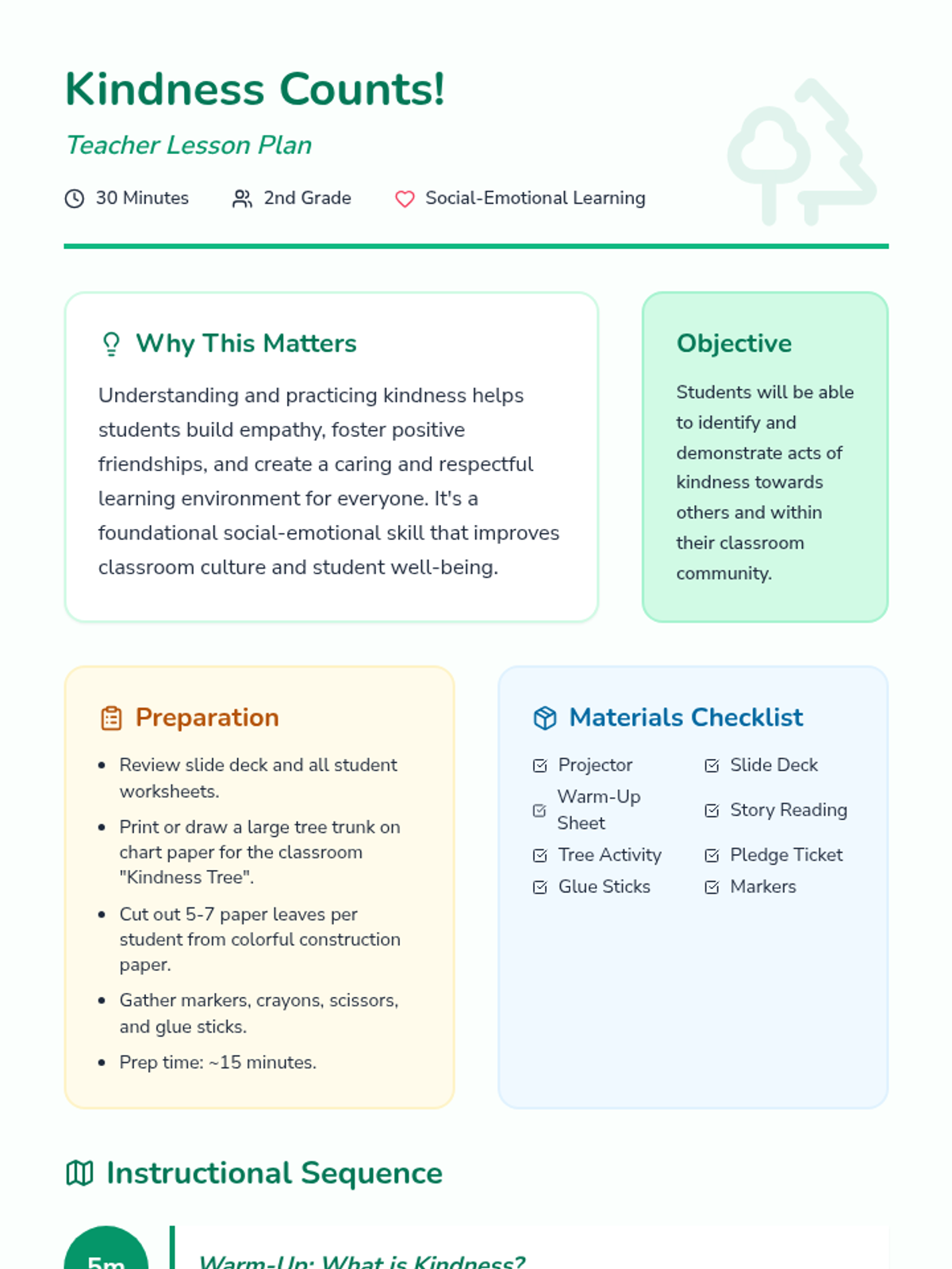 A 30-minute lesson for early elementary students that explores the concept of kindness through discussion, a story, and a collaborative 'Kindness Tree' activity. Students will learn what kindness looks, sounds, and feels like while making personal pledges to show care for others.