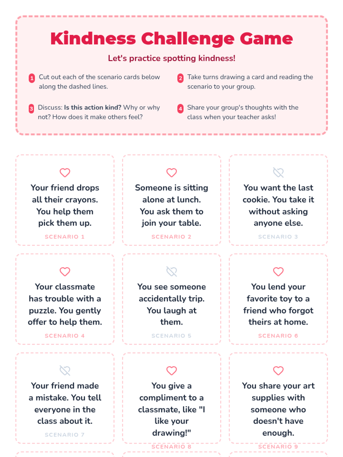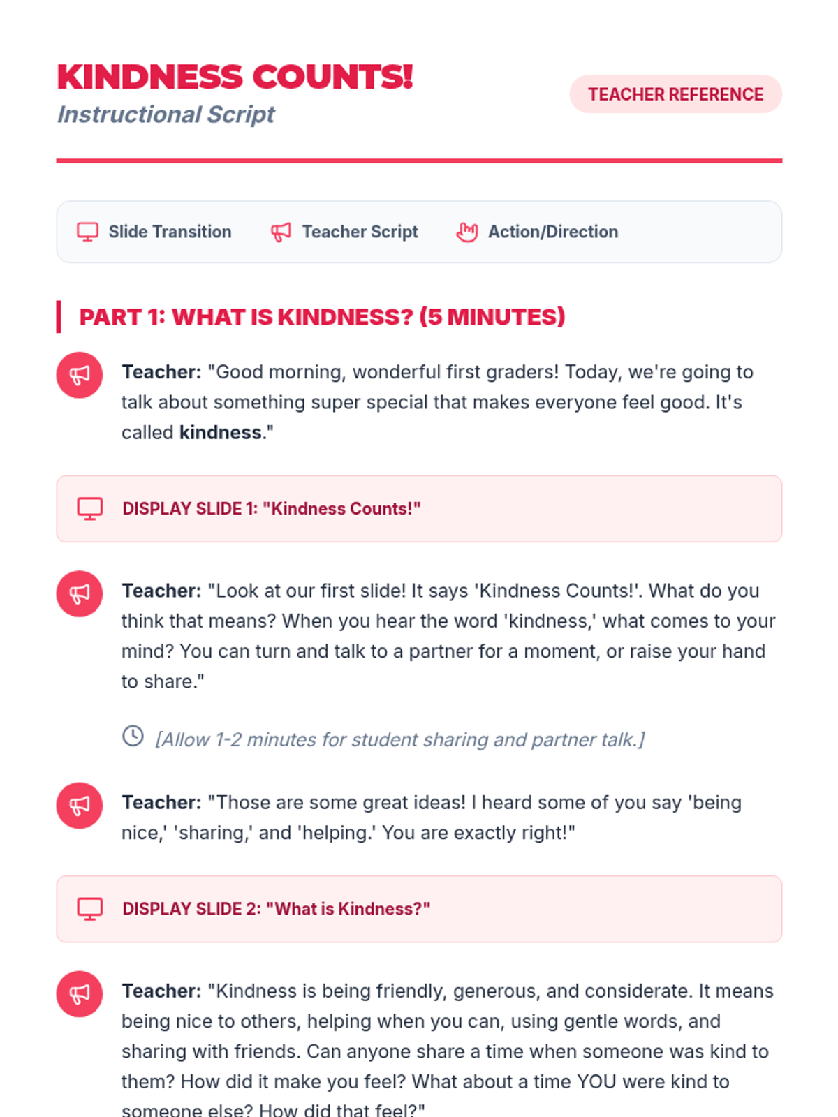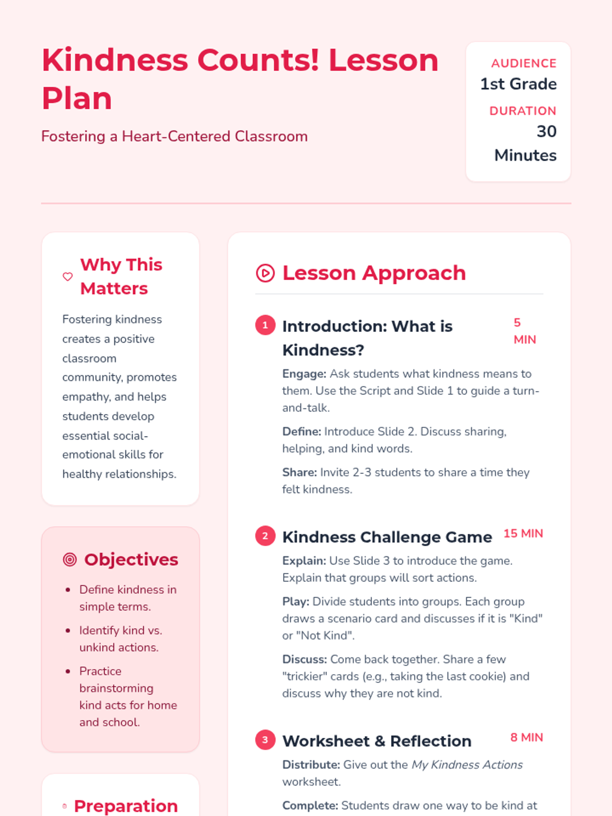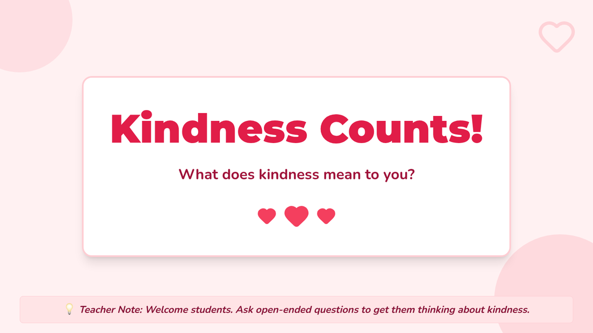 This lesson introduces first-grade students to the concept of kindness through interactive activities. Students will learn what kindness looks and feels like and how to practice it in their daily lives. This is important for fostering a positive classroom environment and developing social-emotional skills. Designed for one 30-minute session.